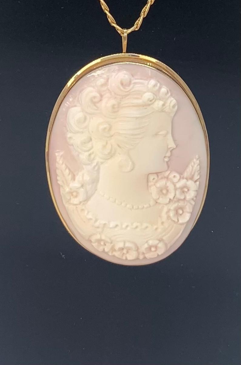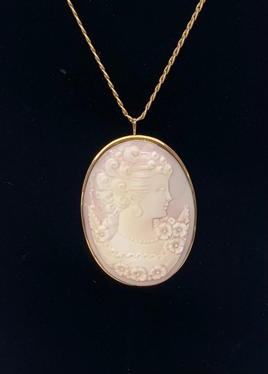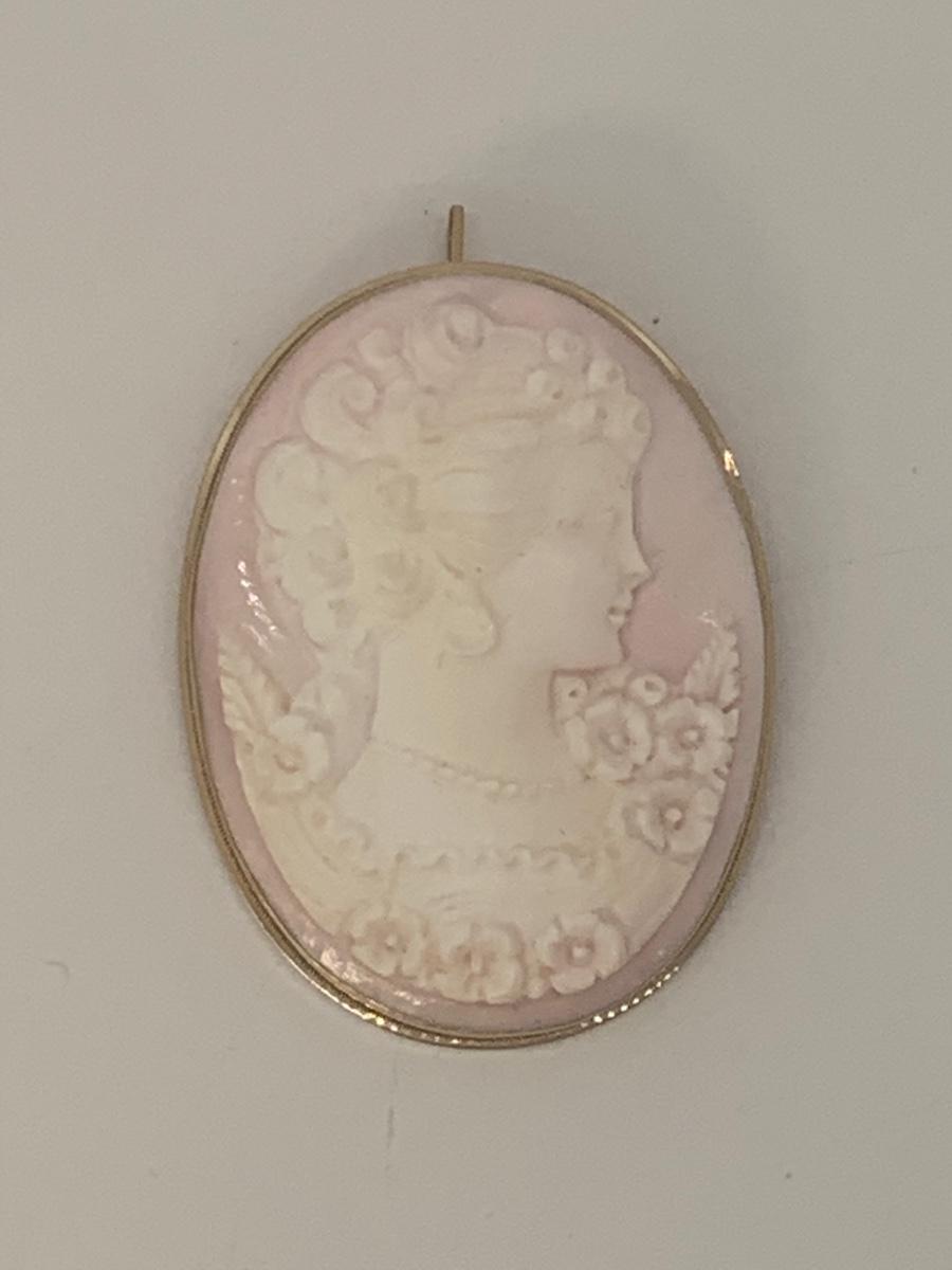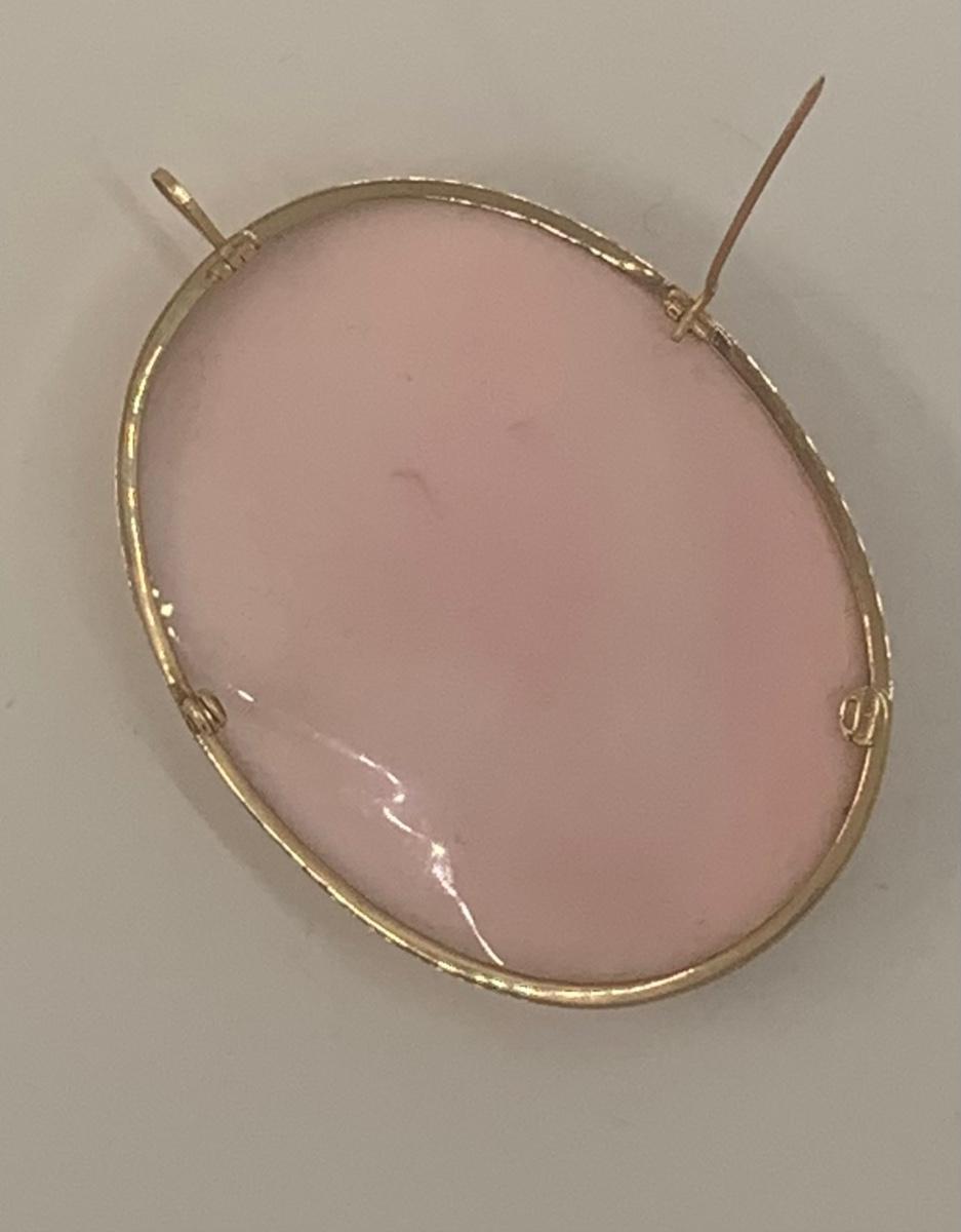 16: New with box 14k pink conch shell M&M Scognamiglio Cameo Pendant/Brooch