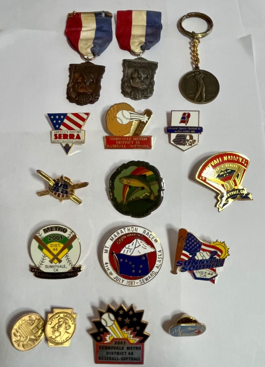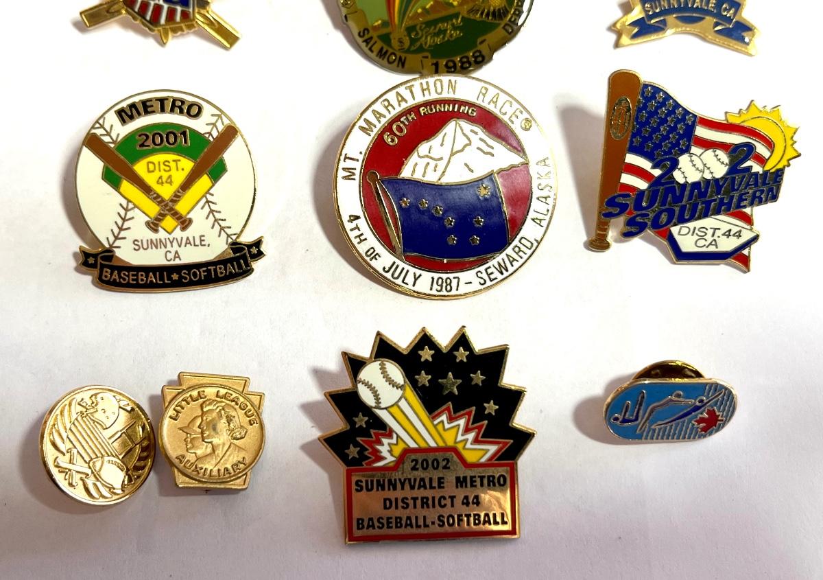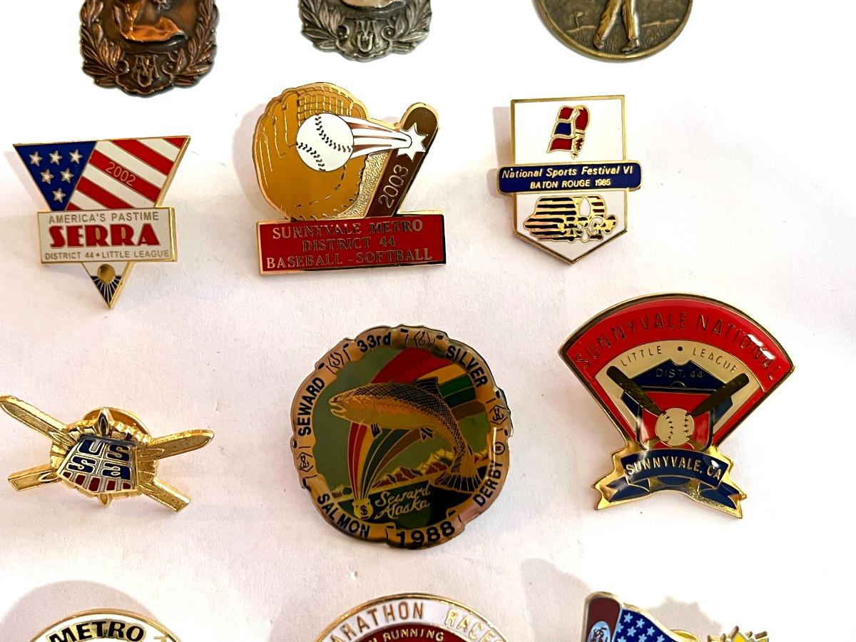 Lot includes 16 various pins for little league Baseball, Swimming, Marathons, Fishing and more. Some are older from 1957 and some from the early 2000's.