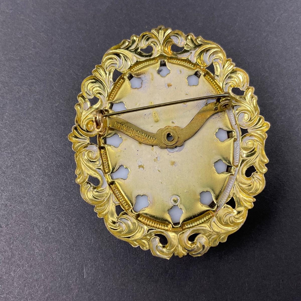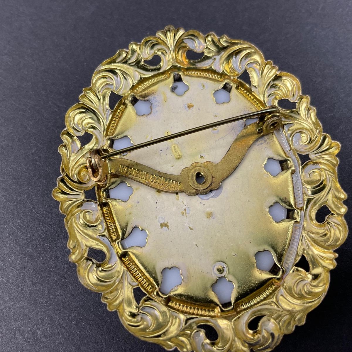 One vintage western Germany brooch marked. Please see photos for details and condition. Any condition statement is given as a courtesy to a client, is an opinion, and should not be treated as a statement of fact. Reference to condition written, oral or within a condition report shall not be regarded as a full account of condition and may not include all defects, alterations, or restorations. Absence of a condition report does not imply a lot is flawless or lacking imperfections or damage. Katherine’s Auction & Appraisal Service shall have no responsibility for any error or omission. Returns shall not be accepted on the basis of condition. ::: Shipping is available on this lot. If you require shipping you must let us know at the close of the auction. We will coordinate with you after the item has been won. Shipping fees will include insurance up to or exceeding the value of all items being mailed. If you have any questions regarding this lot please contact the auctioneer either via this website, by direct email or by phone. PICK UP TIMES and other important information can be found in the TERMS and DESCRIPTION of the auction. Please take a look for pertinent information. Thanks!