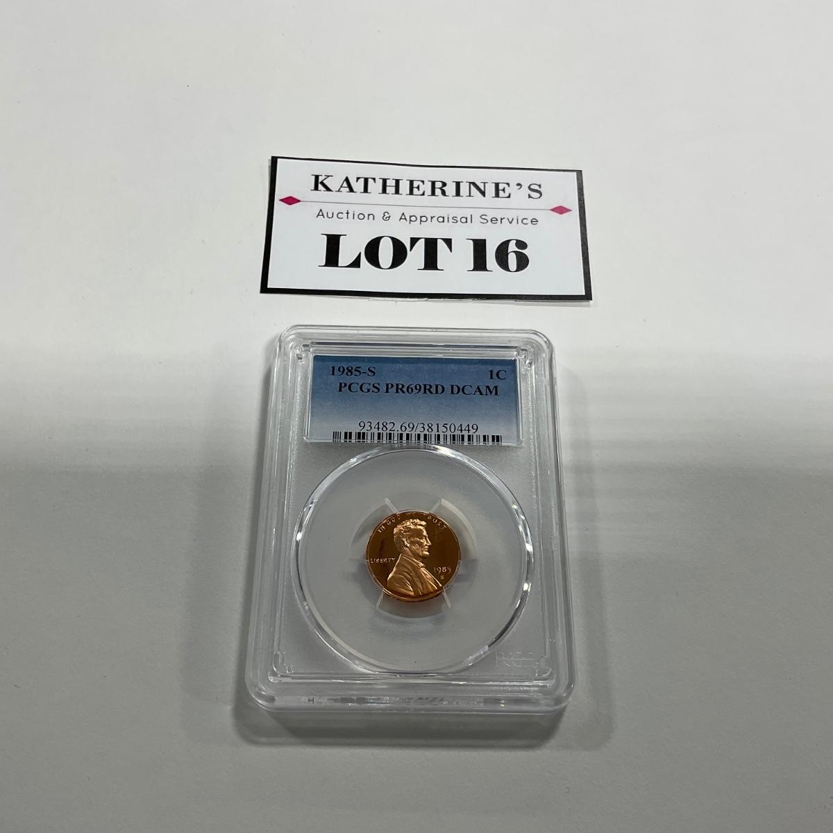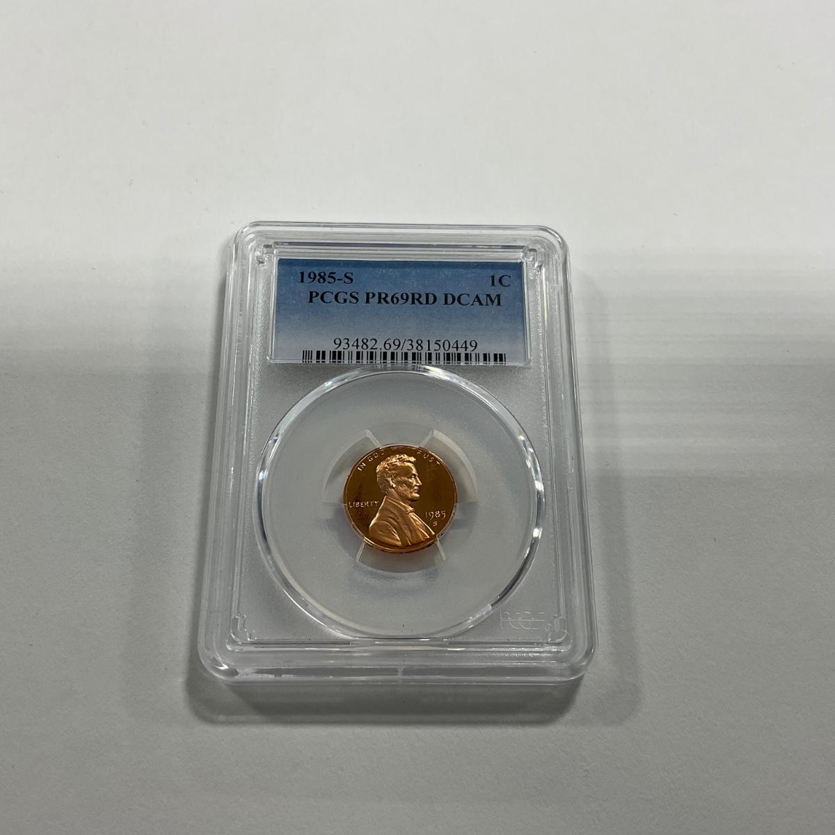 One 1985-S Lincoln cent PCGS PR69RD DCAM coin graded. Please see photos for details and condition. ::: Shipping is available on this lot. If you require shipping you must let us know at the close of the auction. We will coordinate with you after the item has been won. Shipping fees will include insurance up to or exceeding the value of all items being mailed. If you have any questions regarding this lot please contact the auctioneer either via this website, by direct email or by phone. PICK UP TIMES and other important information can be found in the TERMS and DESCRIPTION of the auction. Please take a look for pertinent information. Thanks!