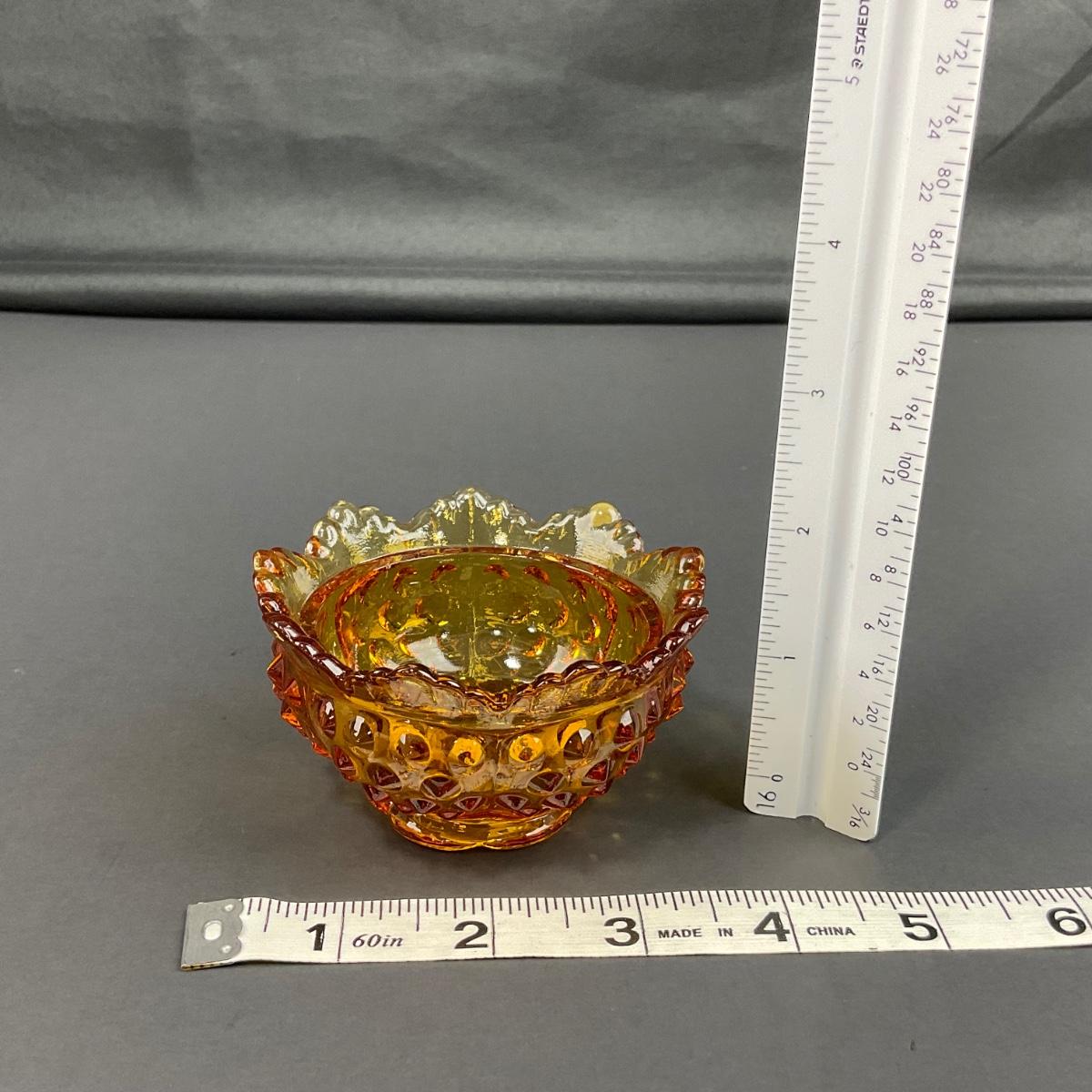 One vintage Fenton Hobnail amber in color fairy lamp. There are some flea bites on the rim of this piece. This piece does have some scuffs, scratches, marks, or slight damage, but otherwise appears to be in great shape. Please see photos for details and condition. Any condition statement is given as a courtesy to a client, is an opinion, and should not be treated as a statement of fact. Reference to condition written, oral or within a condition report shall not be regarded as a full account of condition and may not include all defects, alterations, or restorations. Absence of a condition report does not imply a lot is flawless or lacking imperfections or damage. Katherine’s Auction & Appraisal Service shall have no responsibility for any error or omission. Returns shall not be accepted on the basis of condition. ::: Shipping is available on this lot. If you require shipping you must let us know at the close of the auction. We will coordinate with you after the item has been won. Shipping fees will include insurance up to or exceeding the value of all items being mailed. If you have any questions regarding this lot please contact the auctioneer either via this website, by direct email or by phone. PICK UP TIMES and other important information can be found in the TERMS and DESCRIPTION of the auction. Please take a look for pertinent information. Thanks!