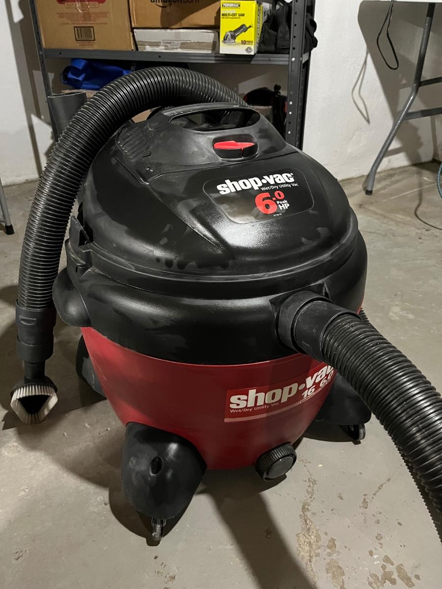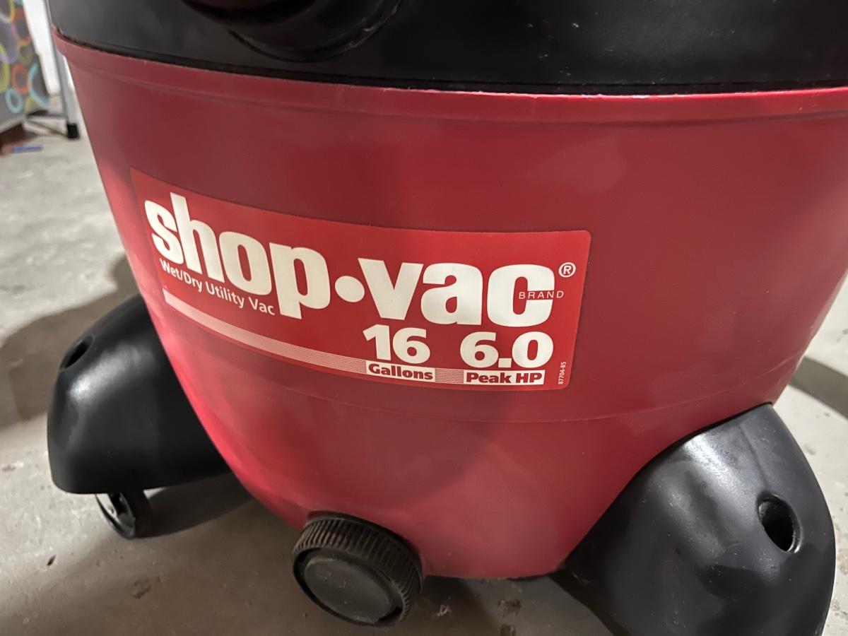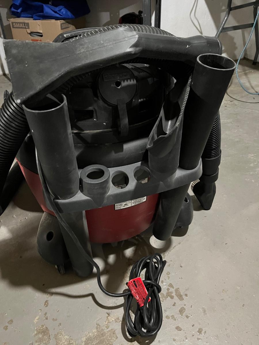 16 gallon shop vac with peak output of 6 hp. Comes with a variety of attachments mounted onto the back.