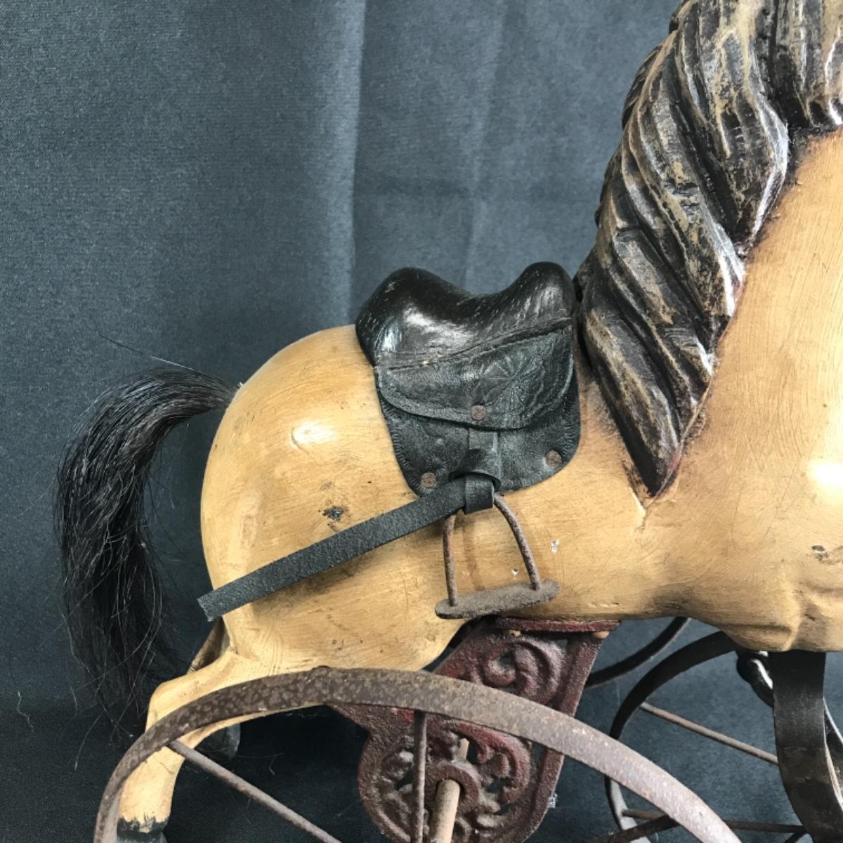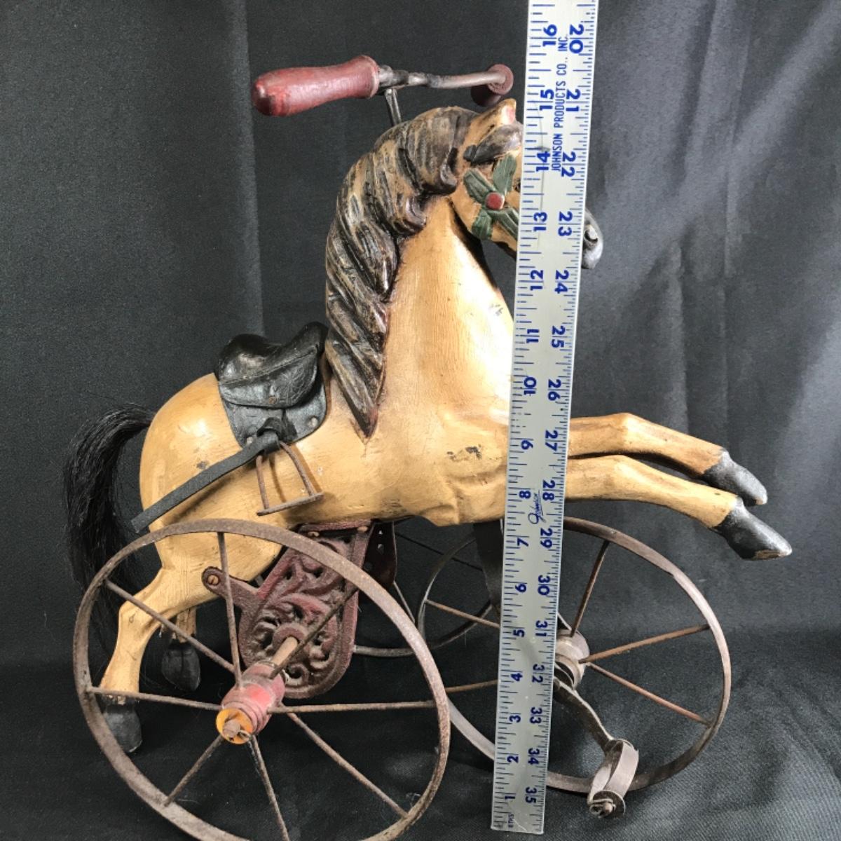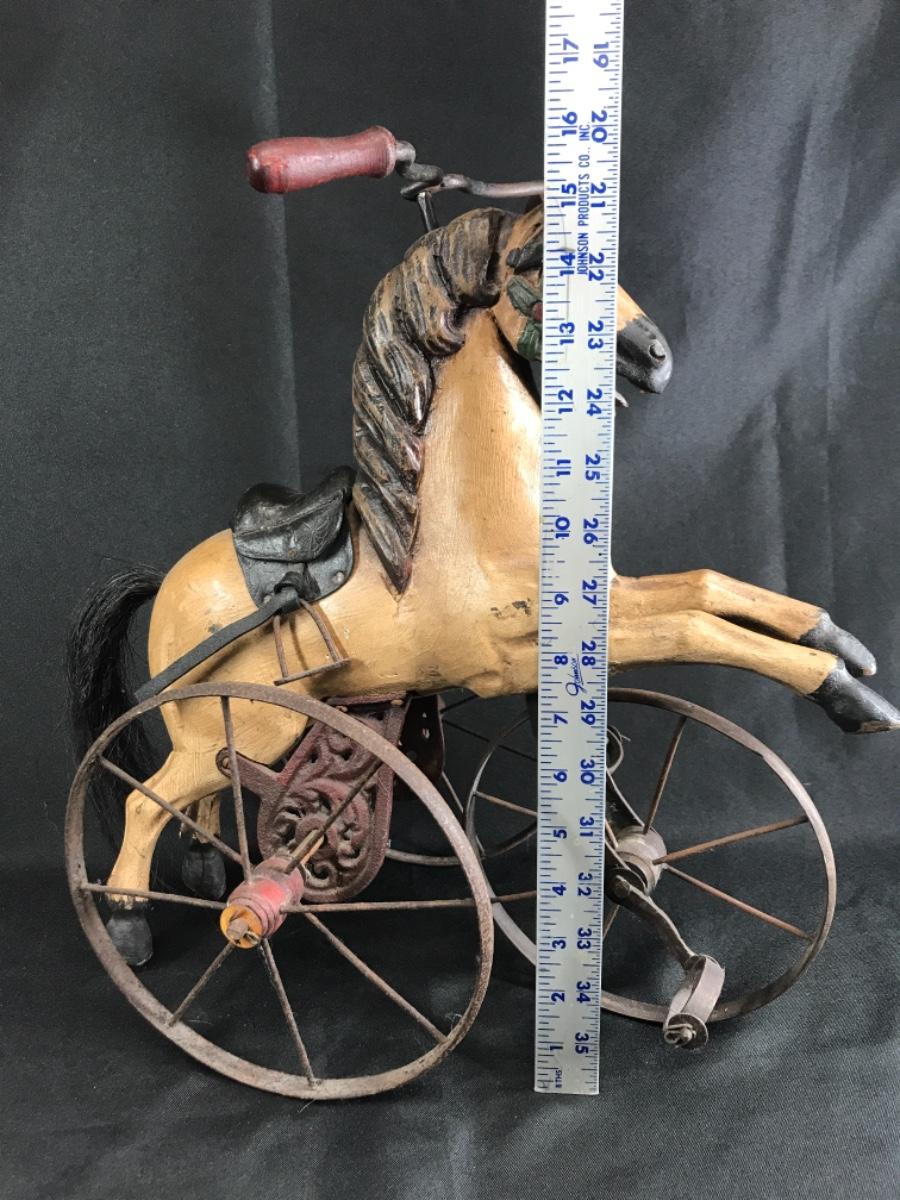 Up for auction is a 16 inch horse tricycle. The horse is made of resin and the wheels and handlebars are made of metal; see pictures. Not made for children.