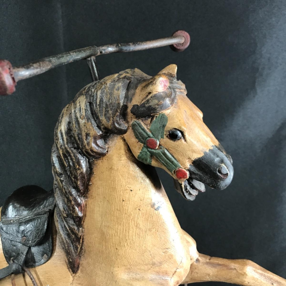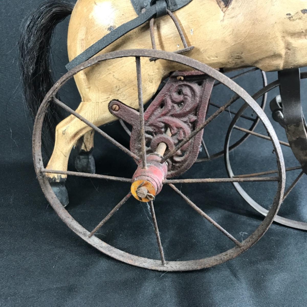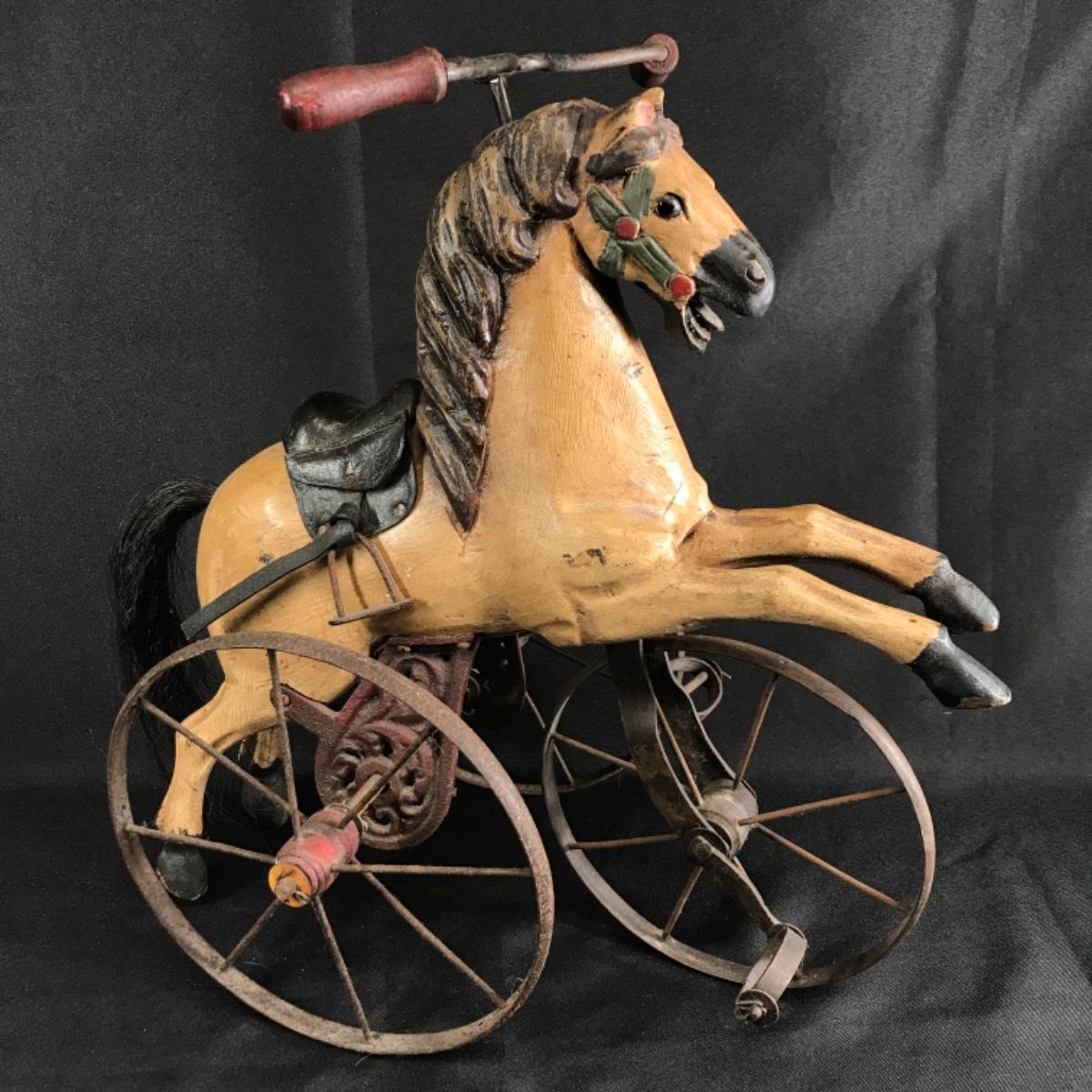 Up for auction is a 16 inch horse tricycle. The horse is made of resin and the wheels and handlebars are made of metal; see pictures. Not made for children.