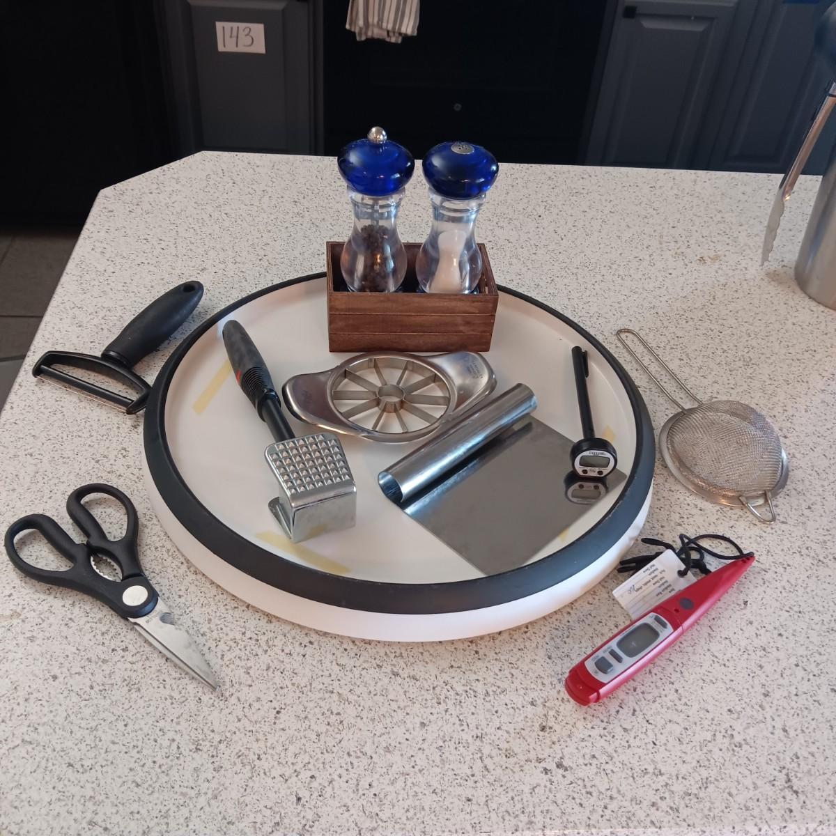 16" LAZY SUSAN, SALT AND PEPPER SHAKERS AND A VARIETY OF KITCHEN UTENSILS