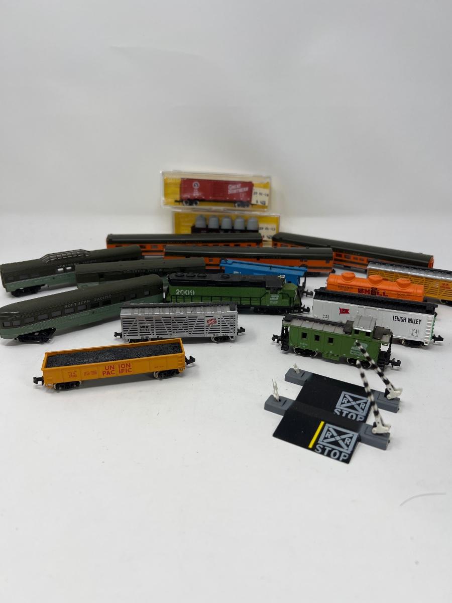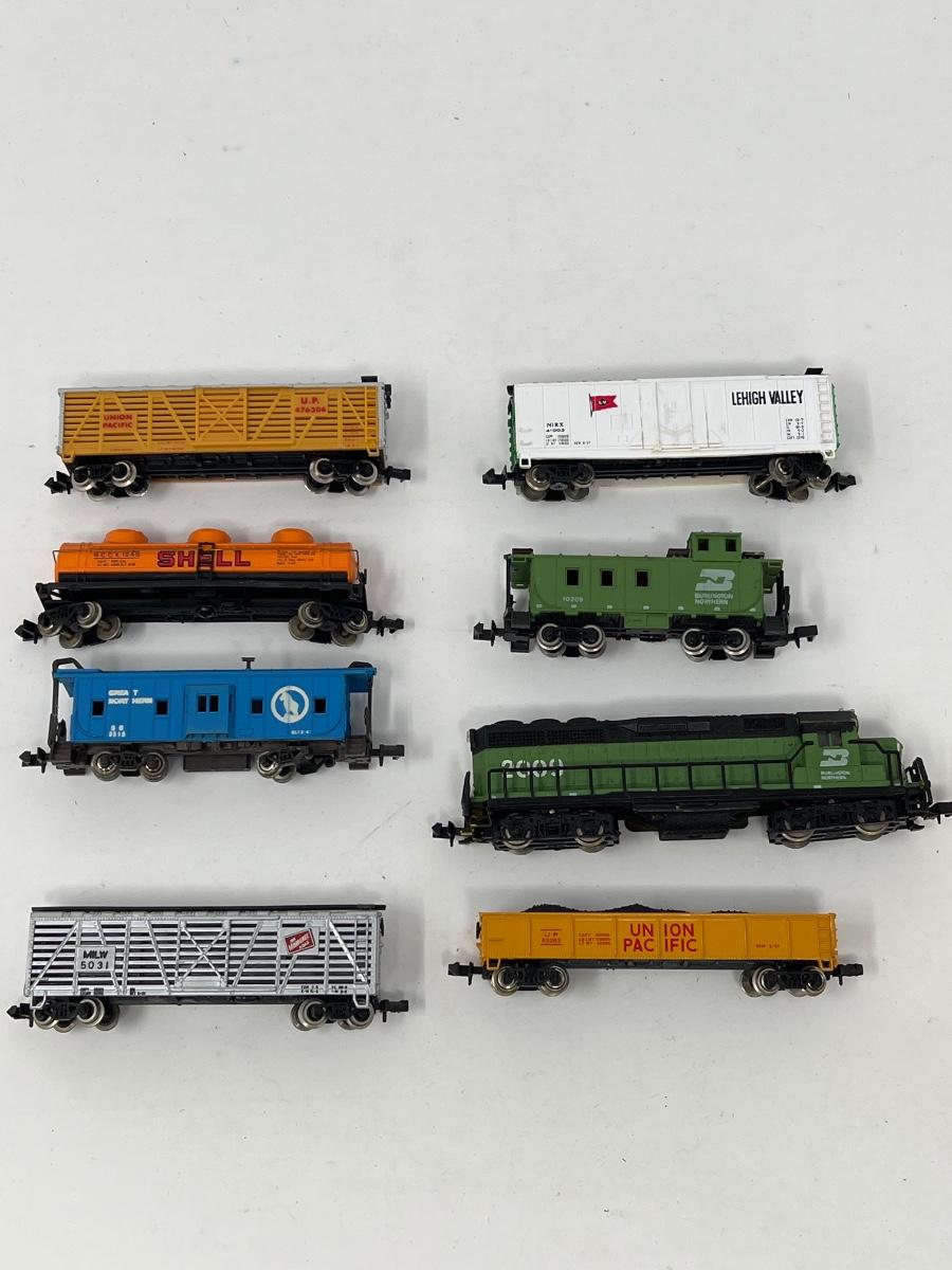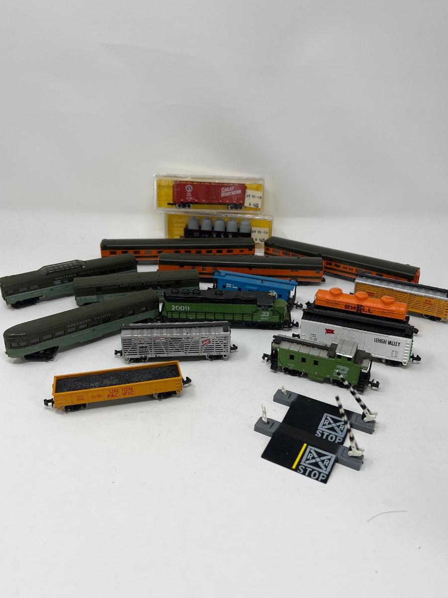 Various vintage N scale train cars and engines.