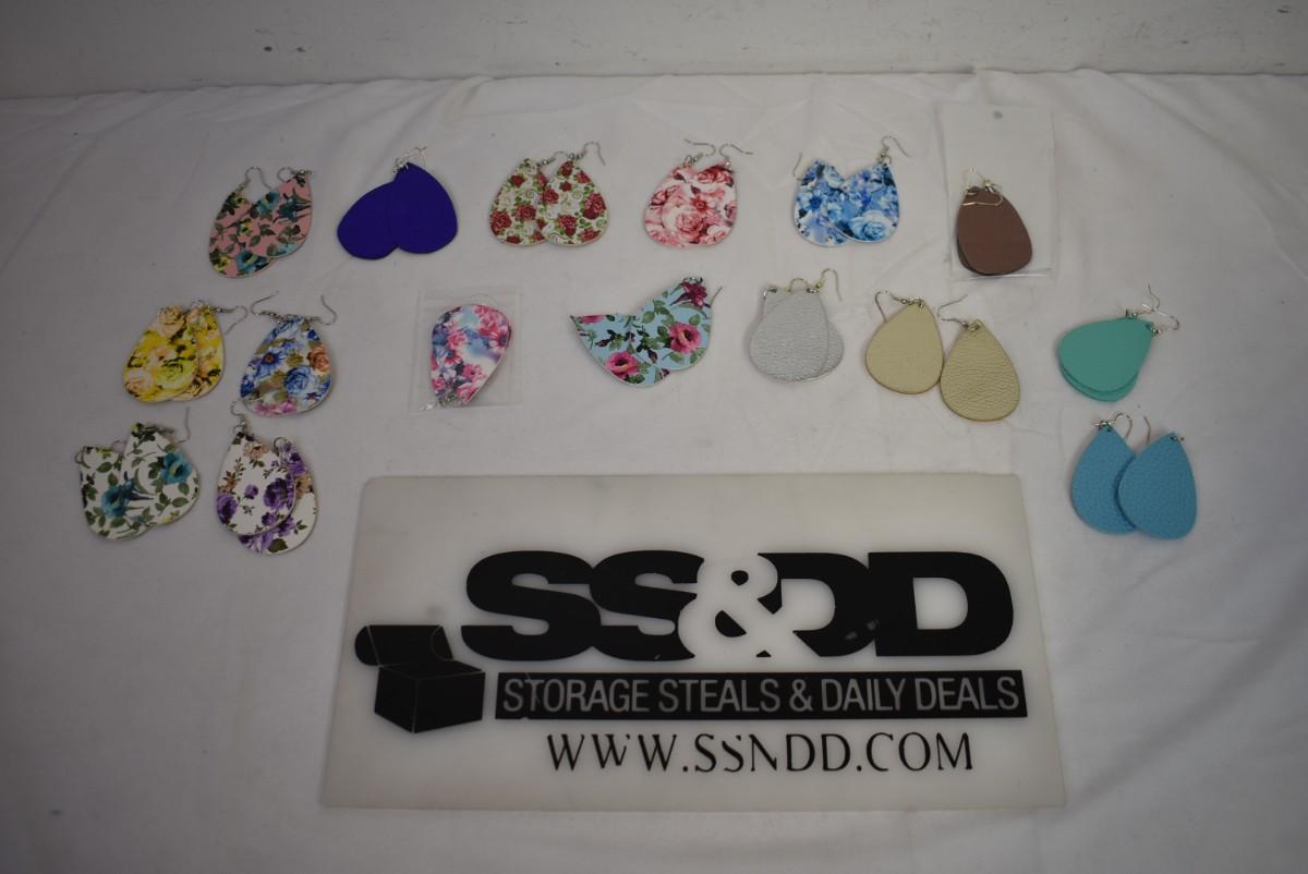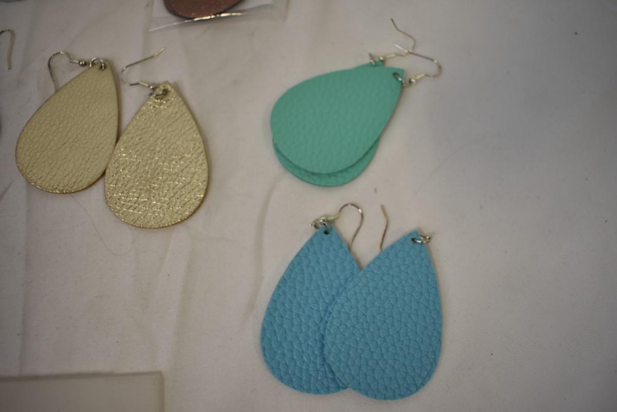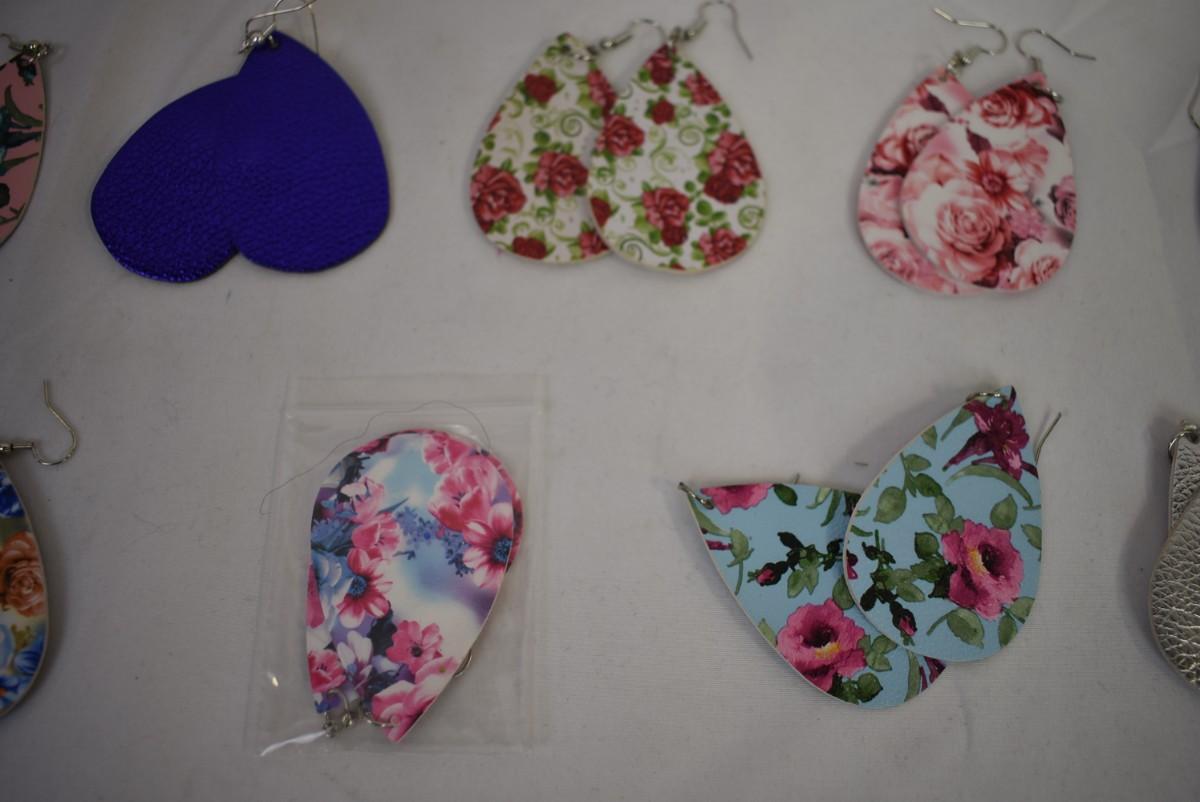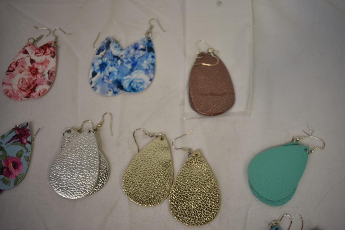 16 Pairs Leather Tear Drop Earrings, various colors: florals & solids