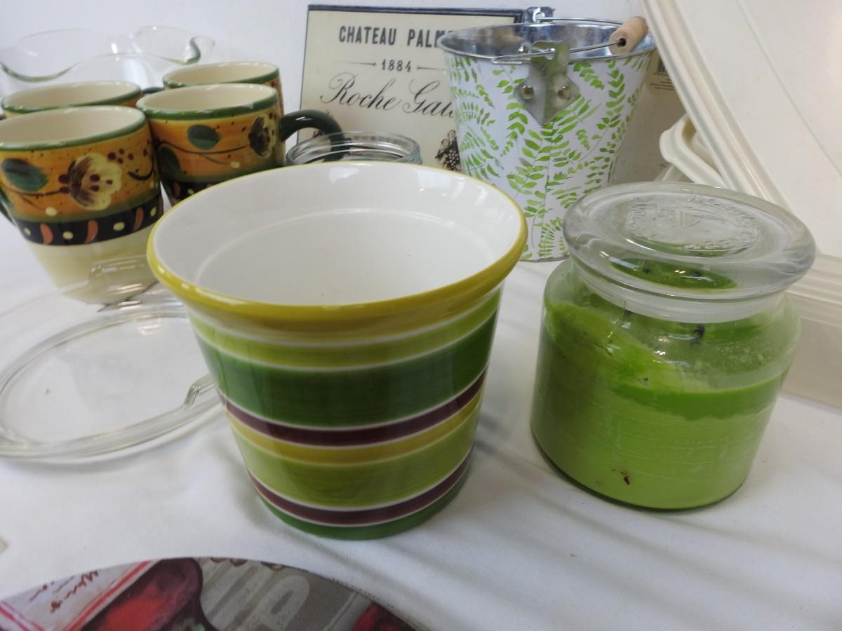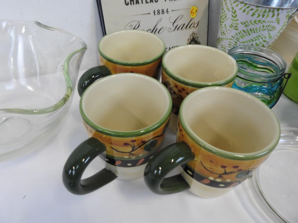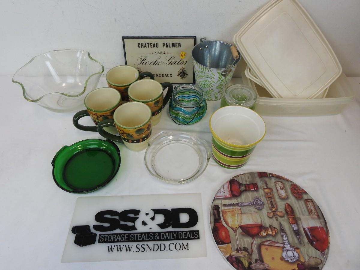 16 pc Kitchen Decor: Rubbermaid Plastic Storage, Ceramic Mugs, Metal Bucket,