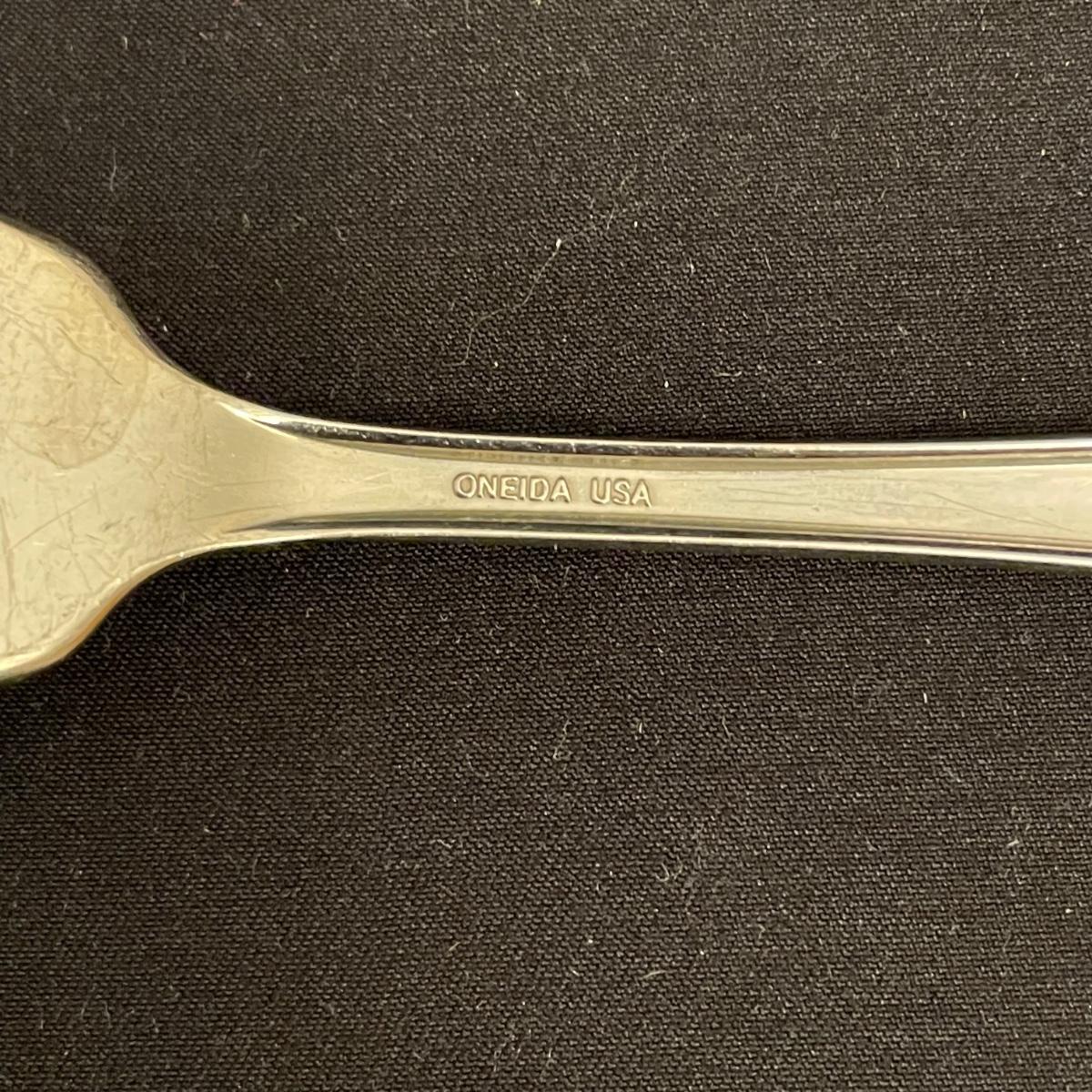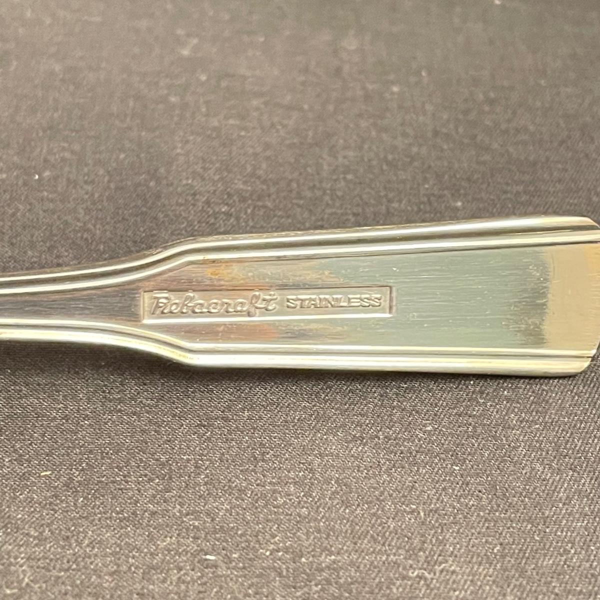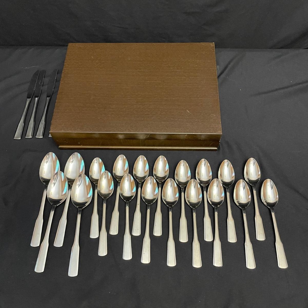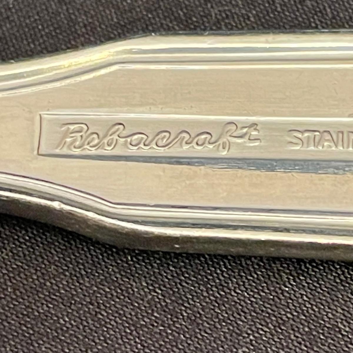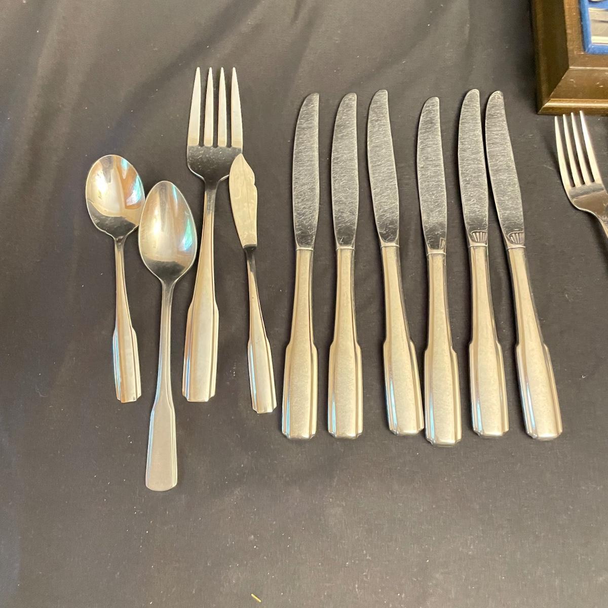 A very nice selection of Rebacraft stainless flatware includes 4 serving spoons, 16 each: knives, soup spoons, salad forks and dinner forks, plus 32 coffee/dessert spoons. Flatware is contained in a 14.75” x 10.75” x 3”H McGraw silverware chest. Note- knives tend to slip out of place easily. Lot also includes a smaller selection of similar flatware by Oneida, a 6 person set with the exception of only 4 entree forks. Flatware chest has some minor blemishes. See images. Shipping available.
