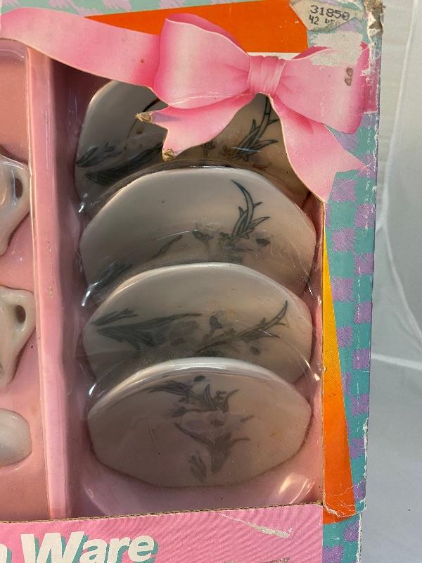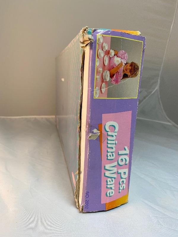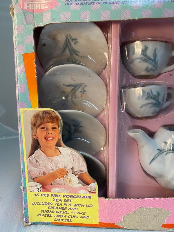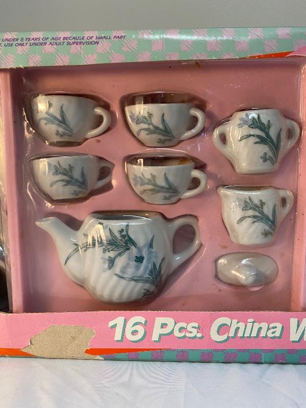 16 piece Child's Porcelain Tea Set. It looks like it might have been used and put back in the box for storage. Has all pieces and did not notice any chips. Box is beat up.