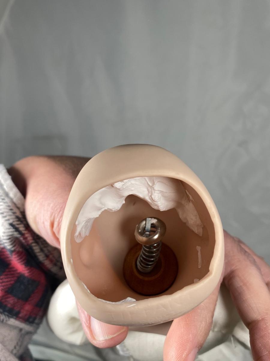 16" soft body reproduction doll. Bisque head and neck, arms, and legs. White cloth body. Open head with fixed eyes. nicely done. Mohair wig. The artist name is behind ear, the head mold name is on back but hard to read.