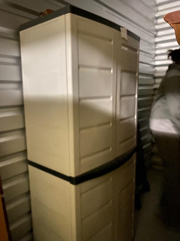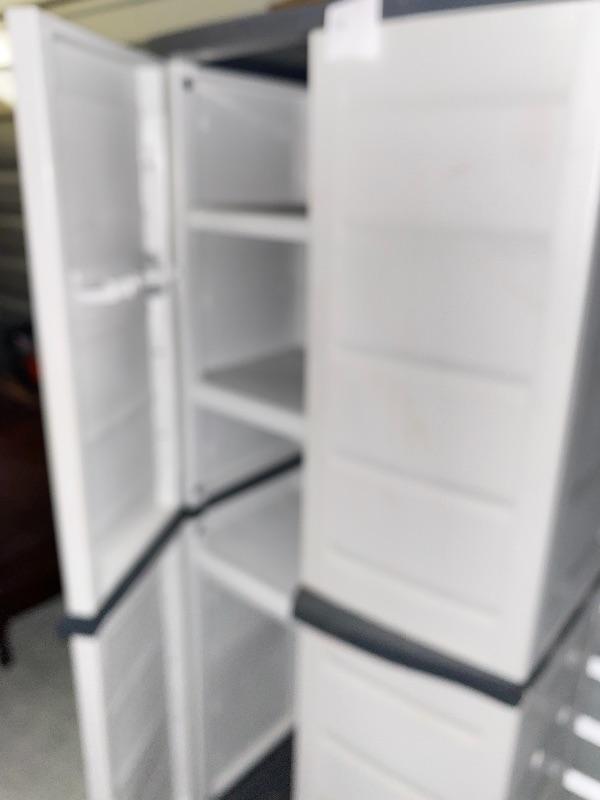 White heavy duty plastic storage unit. 19”d x 30”w x 69”h. Unsure if this is one unit or two stacked.
