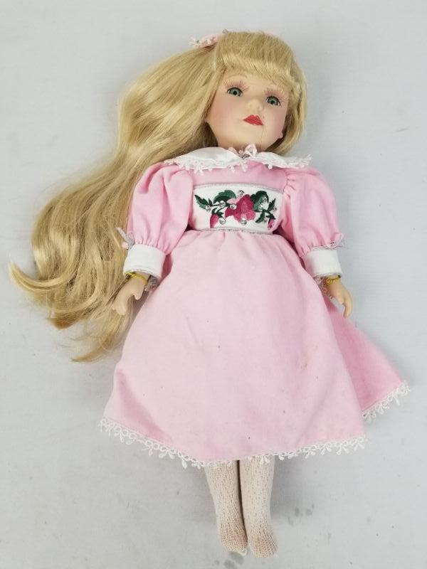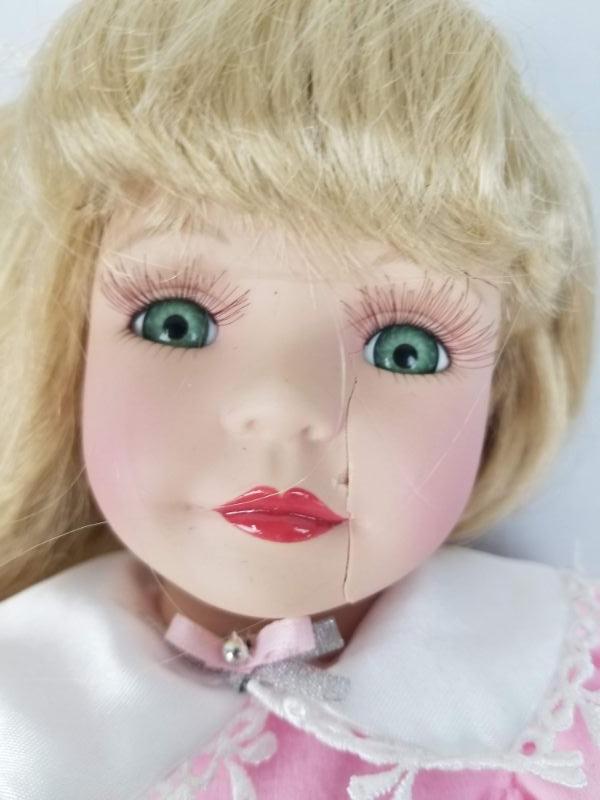 16" Tall Porcelain Doll with Pink Dress (Damaged Head)