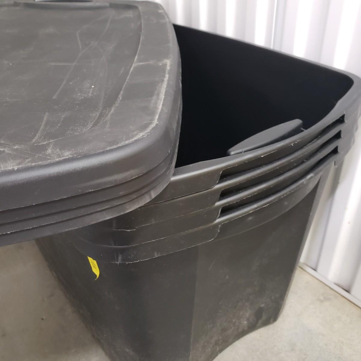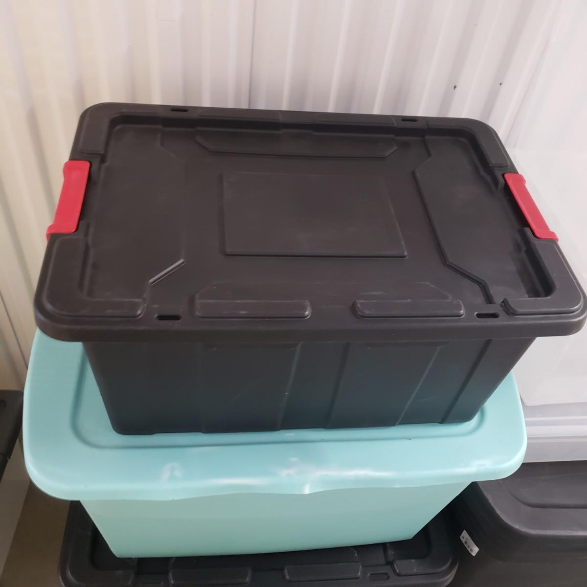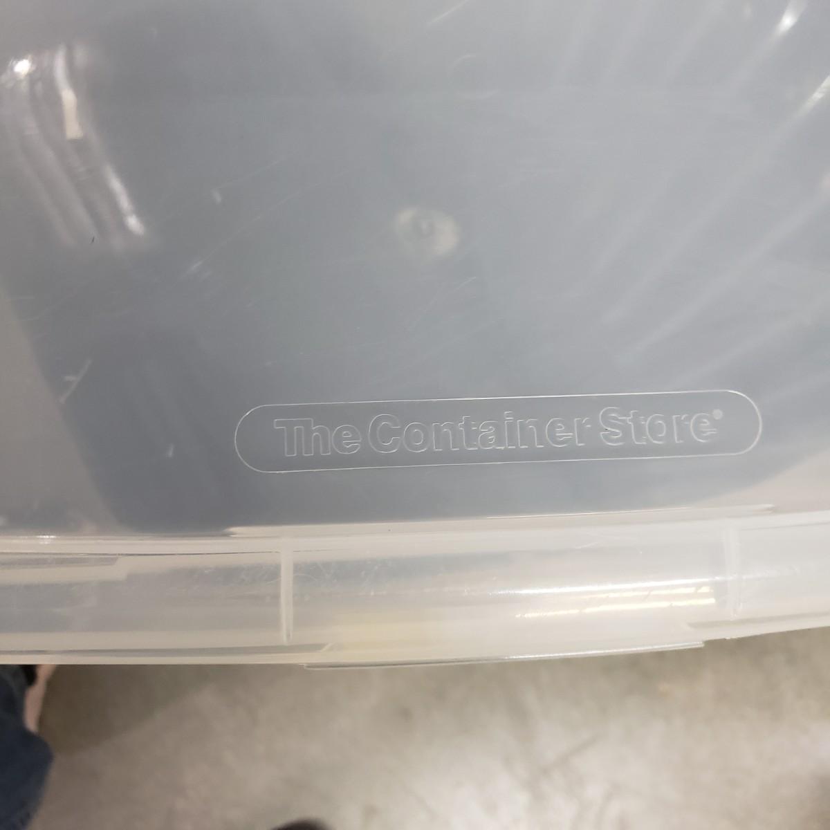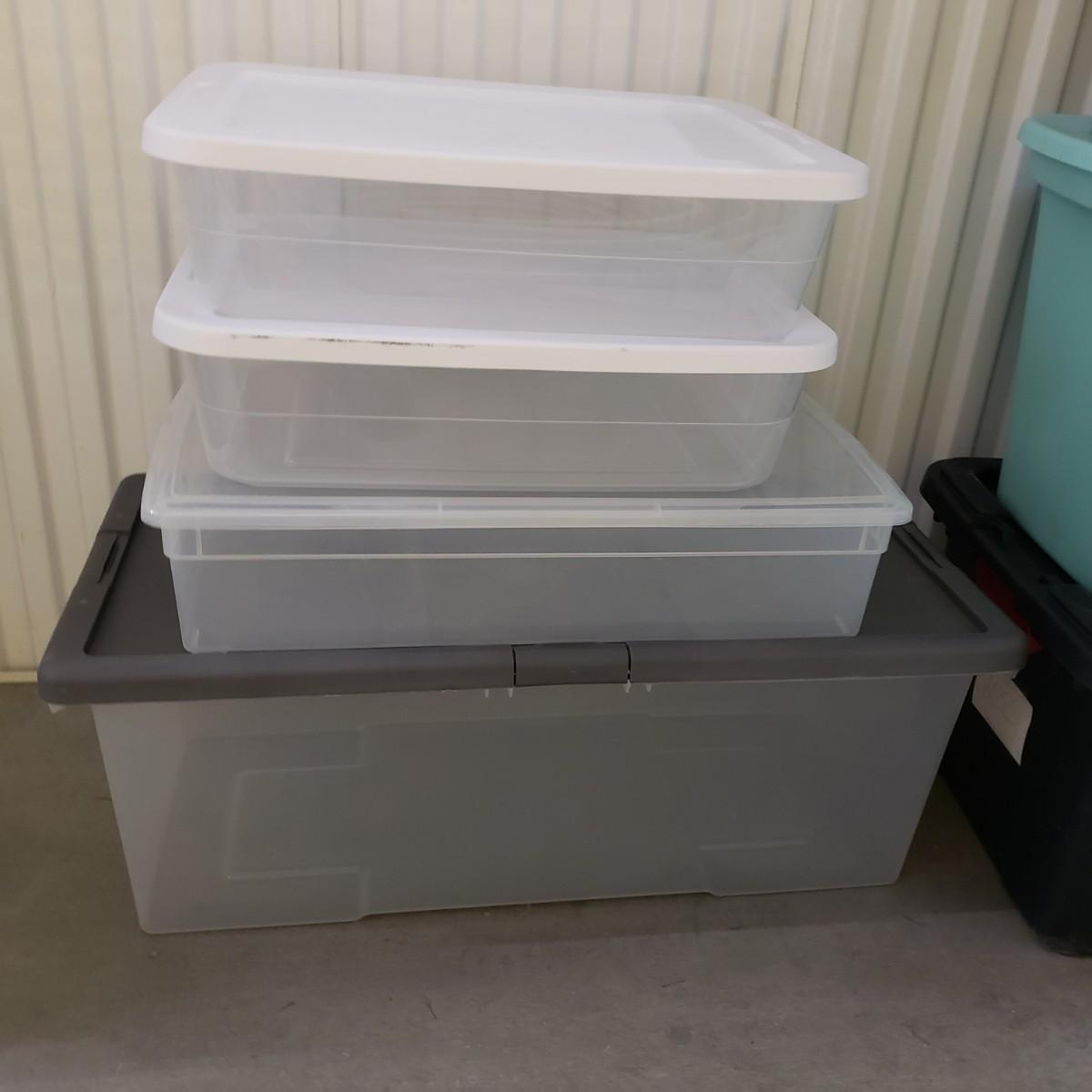 This lot contains 16 plastic tubs. Most are Sterilite brand, see pictures. The two black ones are very sturdy and have clip up handles. There are two The Container Store clear tubs.