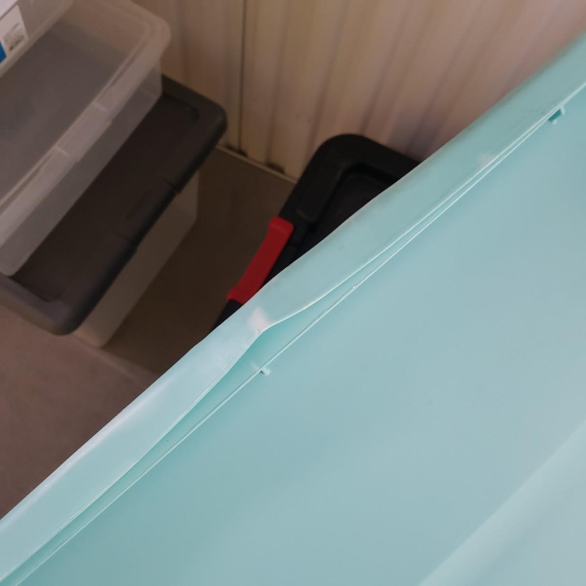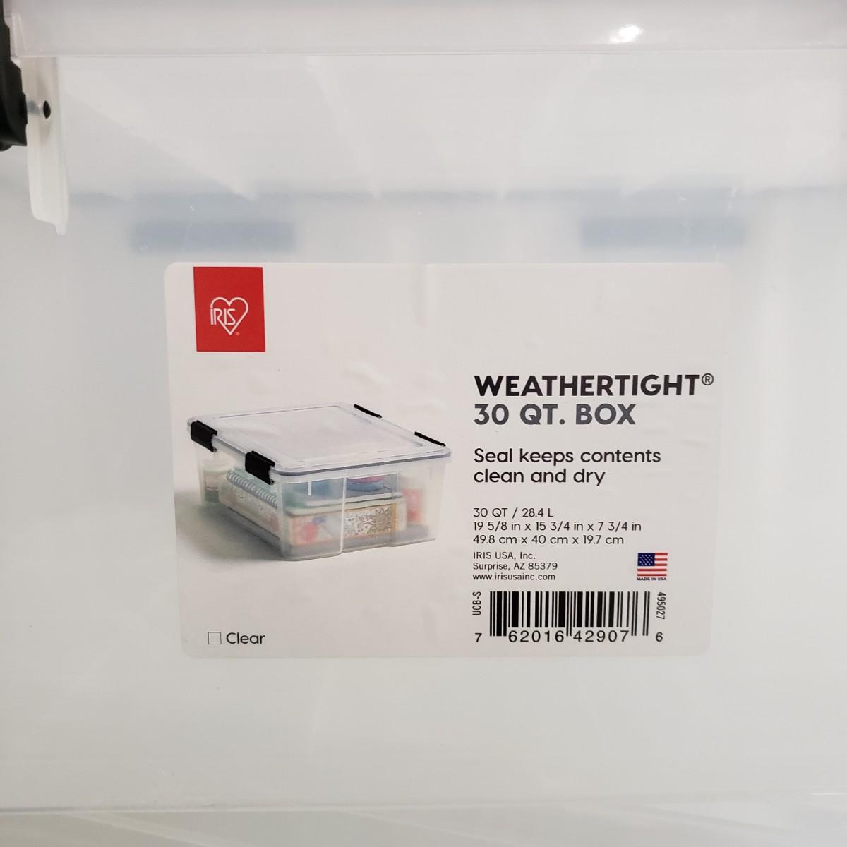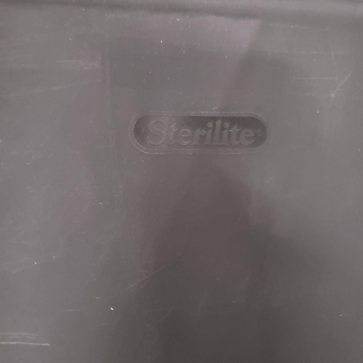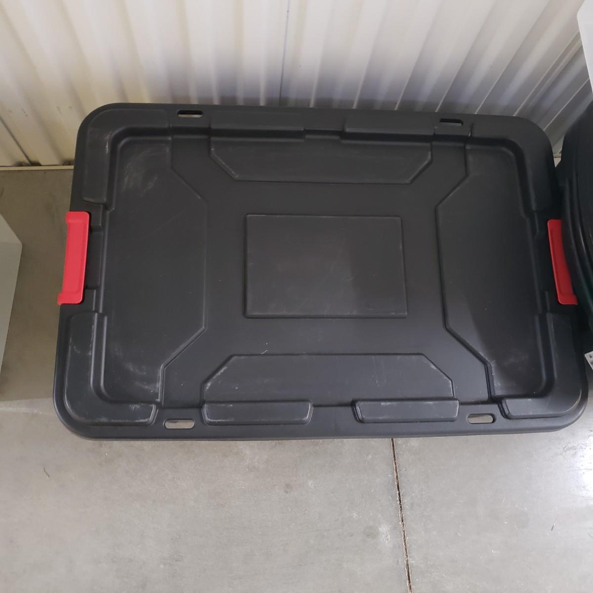 This lot contains 16 plastic tubs. Most are Sterilite brand, see pictures. The two black ones are very sturdy and have clip up handles. There are two The Container Store clear tubs.