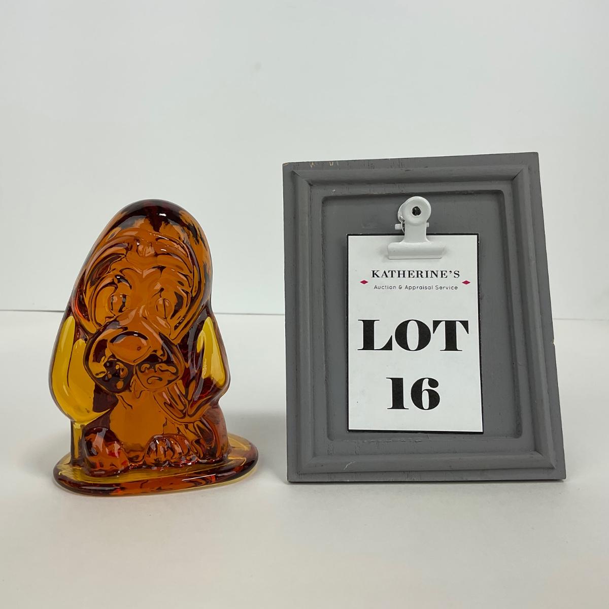 One Viking mid century amber colored hound dog paperweight. 3 inches wide by 4.25 inches tall. This piece has no damage, and appears to be in great shape with no visable chips, cracks, or broken pieces. Please see photos for details and condition. Any condition statement is given as a courtesy to a client, is an opinion, and should not be treated as a statement of fact. Reference to condition written, oral or within a condition report shall not be regarded as a full account of condition and may not include all defects, alterations, or restorations. Absence of a condition report does not imply a lot is flawless or lacking imperfections or damage. Katherine’s Auction & Appraisal Service shall have no responsibility for any error or omission. Returns shall not be accepted on the basis of condition. ::: Shipping is available on this lot. If you require shipping you must let us know at the close of the auction. We will coordinate with you after the item has been won. Shipping fees will include insurance up to or exceeding the value of all items being mailed. If you have any questions regarding this lot please contact the auctioneer either via this website, by direct email or by phone. PICK UP TIMES and other important information can be found in the TERMS and DESCRIPTION of the auction. Please take a look for pertinent information. Thanks!