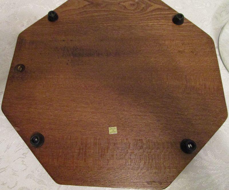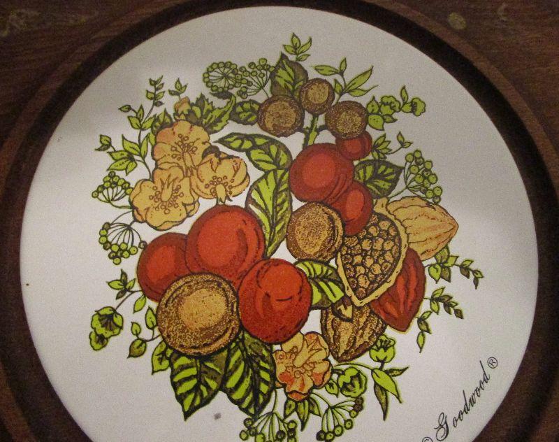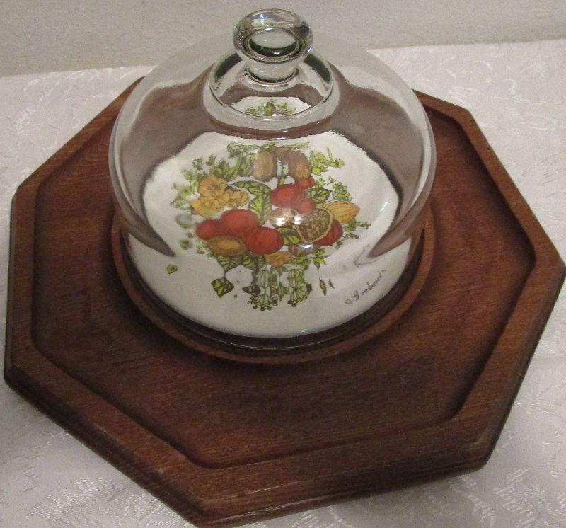 A cheese tray with a glass dome. The wood tray is about 12 inches across. The middle area for the cheese is about 6 inches in diameter. The glass dome is about 6 inches high