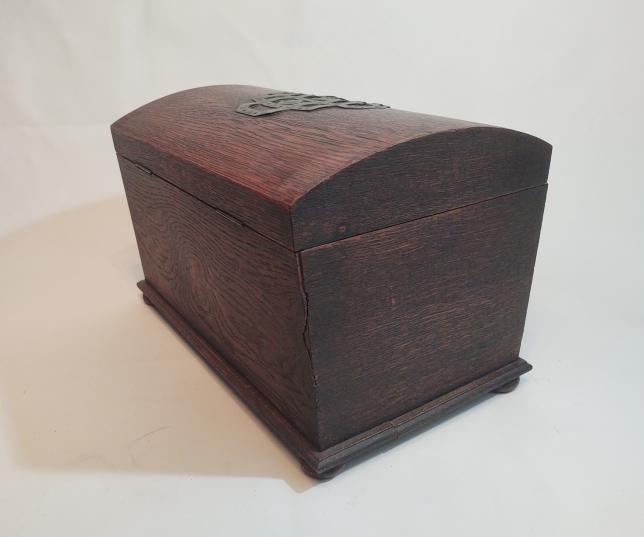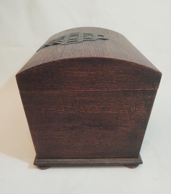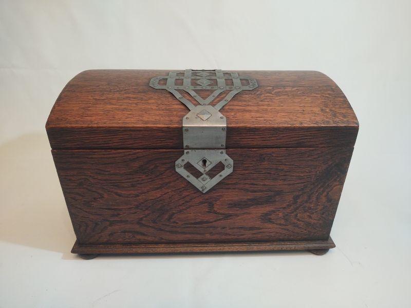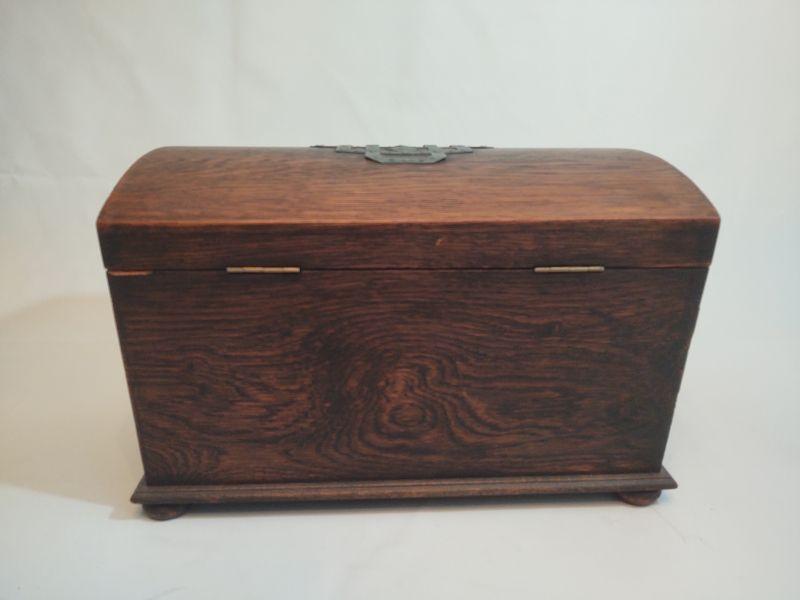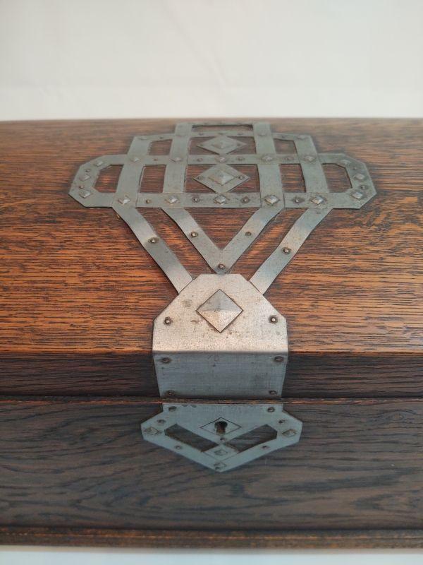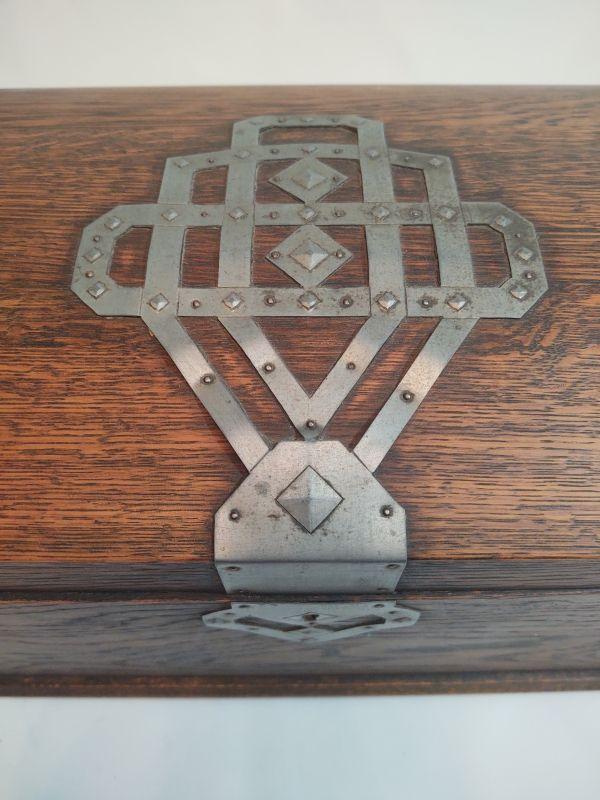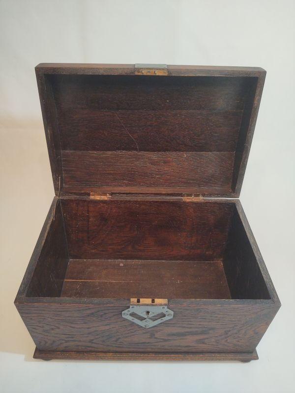Beautiful wooden kindling box has a metal top strap and latch. No key.