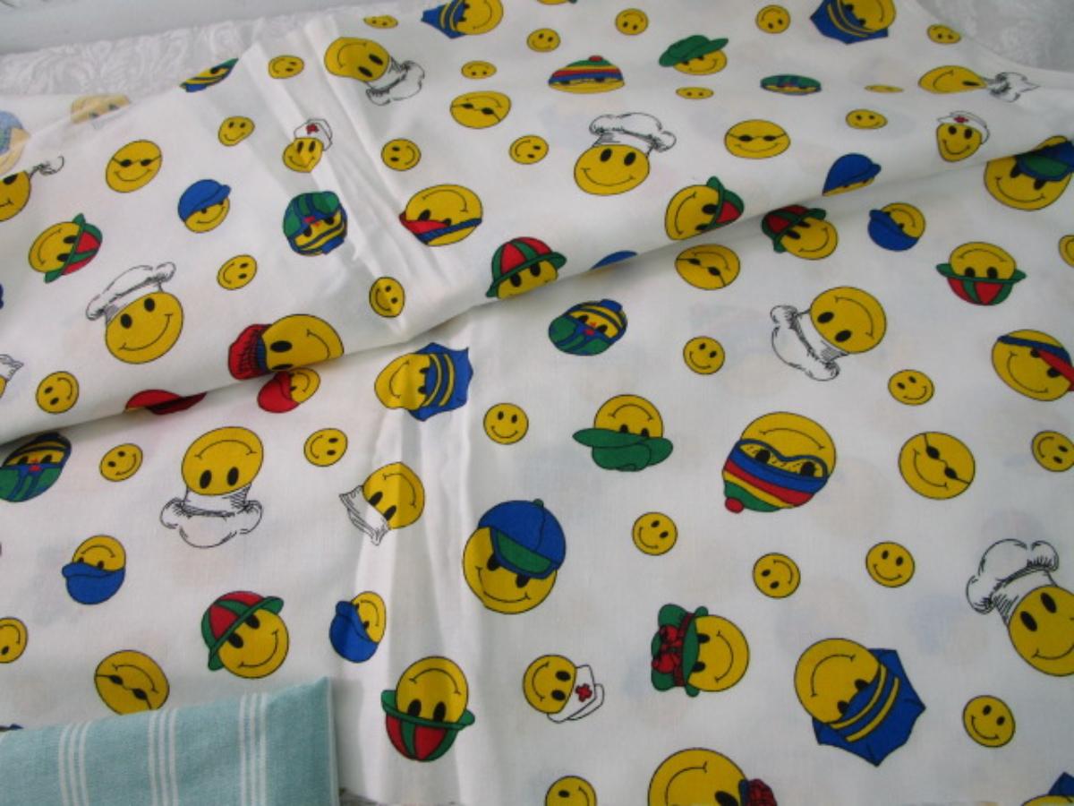 1.6 yd striped fabric, 2.3 yd smiley face fabric, 2 yd shamrock fabric