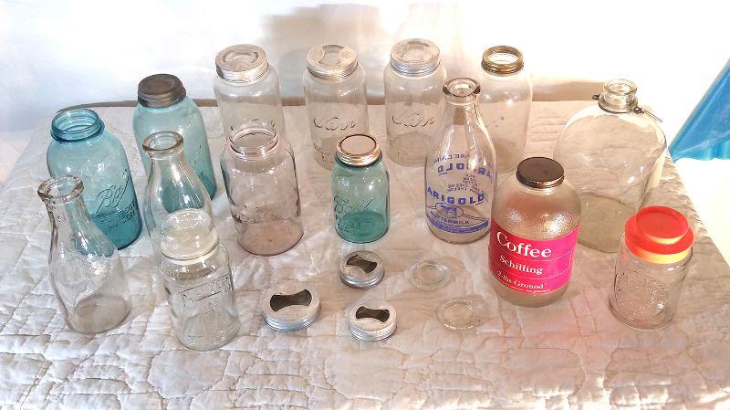 Jars: Ball regular mouth blue 2, 1 Ball pint blue, Kerr wide mouth ½ gallon, with glass lids and rings, Kerr ½ gallon regular mouth, St Louis Dairy Co. milk bottle, unmarked dairy jar, Schrom jar, Darigold Buttermilk jar, 1 gallon jug, Schilling 2-pound coffee jar, Planters covered jar, cabin jar