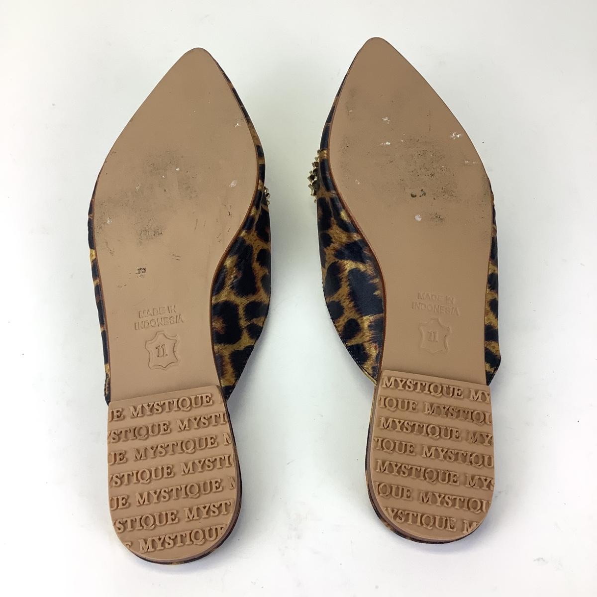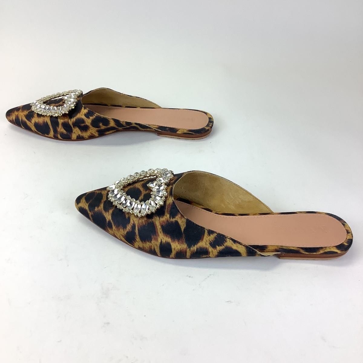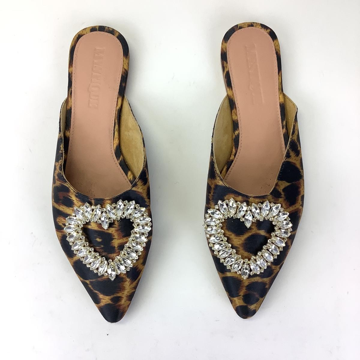 Gently worn cheetah print on leather and heart rhinestone fronts slip on pointed toe sandals.
