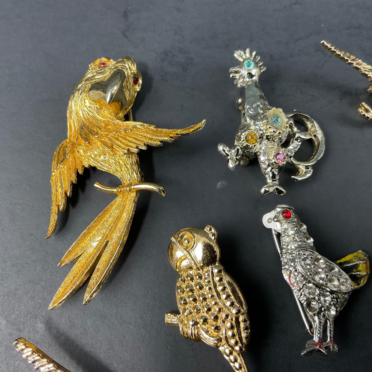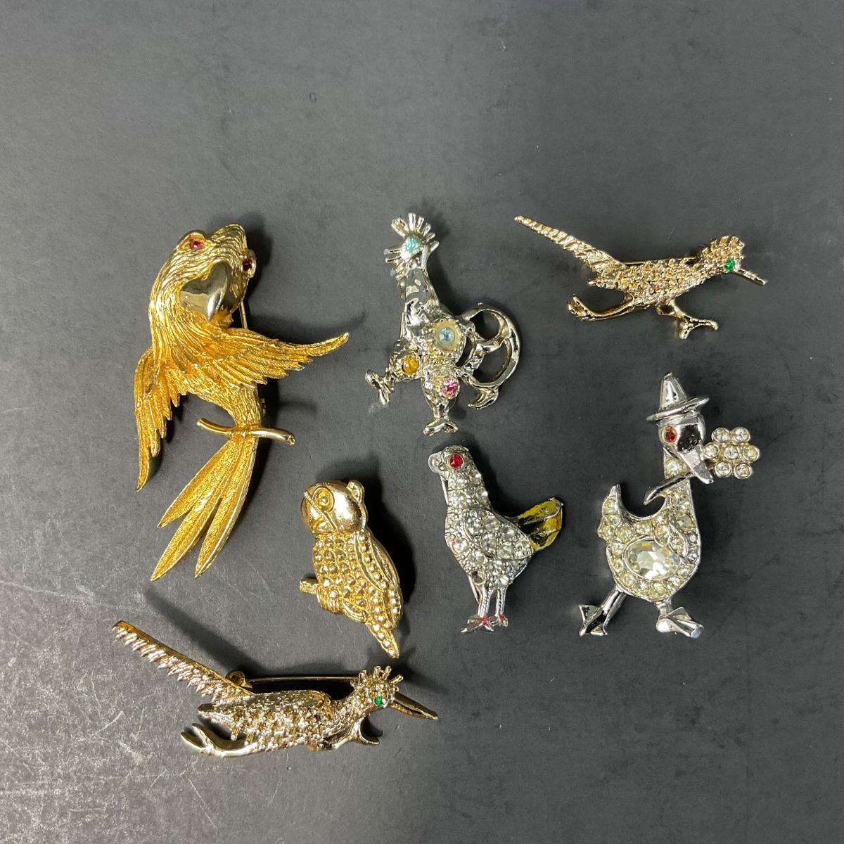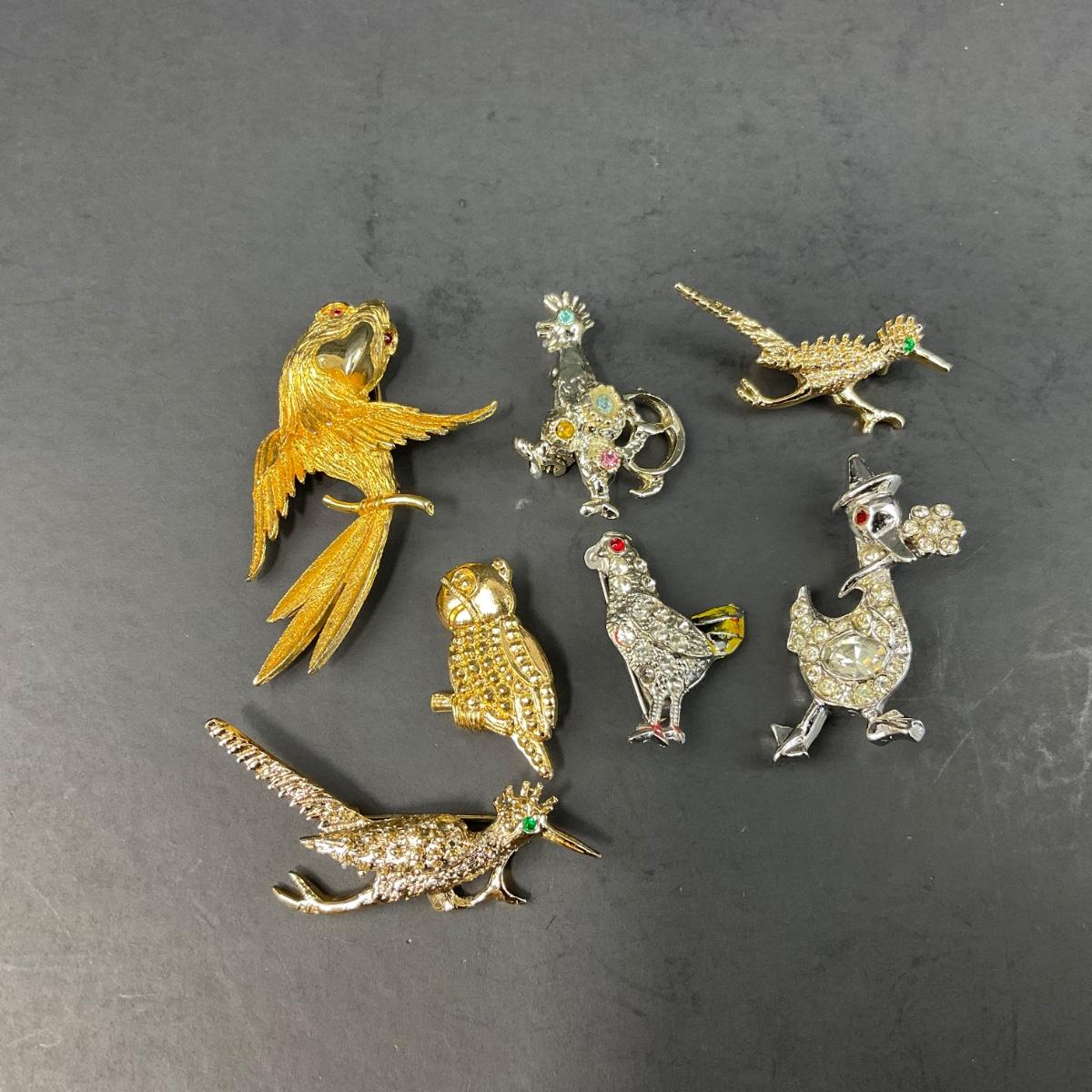 Seven assorted bird brooches. Please see photos for details and condition. Any condition statement is given as a courtesy to a client, is an opinion, and should not be treated as a statement of fact. Reference to condition written, oral or within a condition report shall not be regarded as a full account of condition and may not include all defects, alterations, or restorations. Absence of a condition report does not imply a lot is flawless or lacking imperfections or damage. Katherine’s Auction & Appraisal Service shall have no responsibility for any error or omission. Returns shall not be accepted on the basis of condition. ::: Shipping is available on this lot. If you require shipping you must let us know at the close of the auction. We will coordinate with you after the item has been won. Shipping fees will include insurance up to or exceeding the value of all items being mailed. If you have any questions regarding this lot please contact the auctioneer either via this website, by direct email or by phone. PICK UP TIMES and other important information can be found in the TERMS and DESCRIPTION of the auction. Please take a look for pertinent information. Thanks!