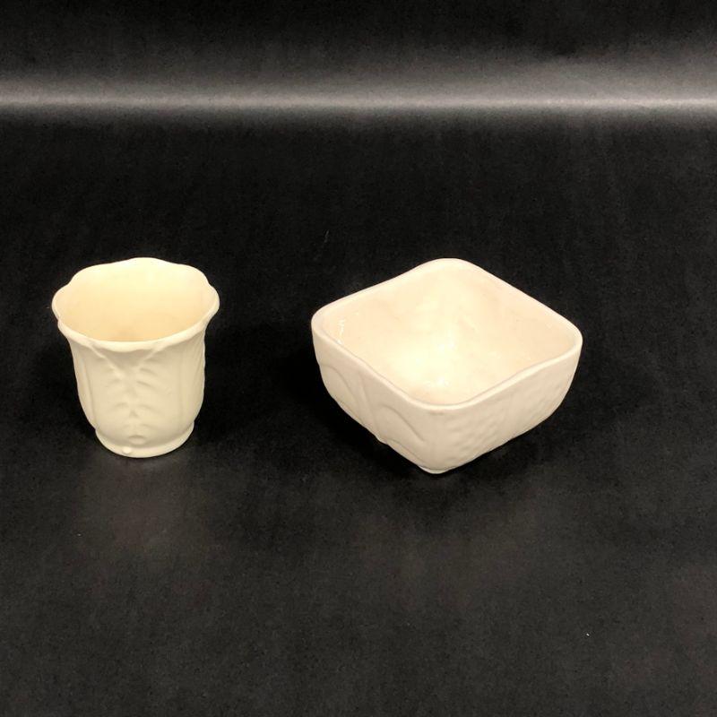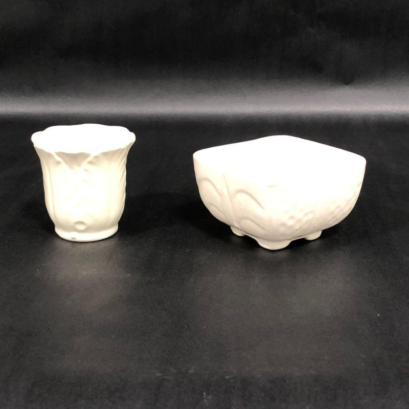 Excellent Starter lot for your windowsill garden! Featuring beautiful pieces that are tied together by color alone. For Reference, Basket Measures 7.5" Tall, and Large Wavy vase diameter is 6.5" at widest.