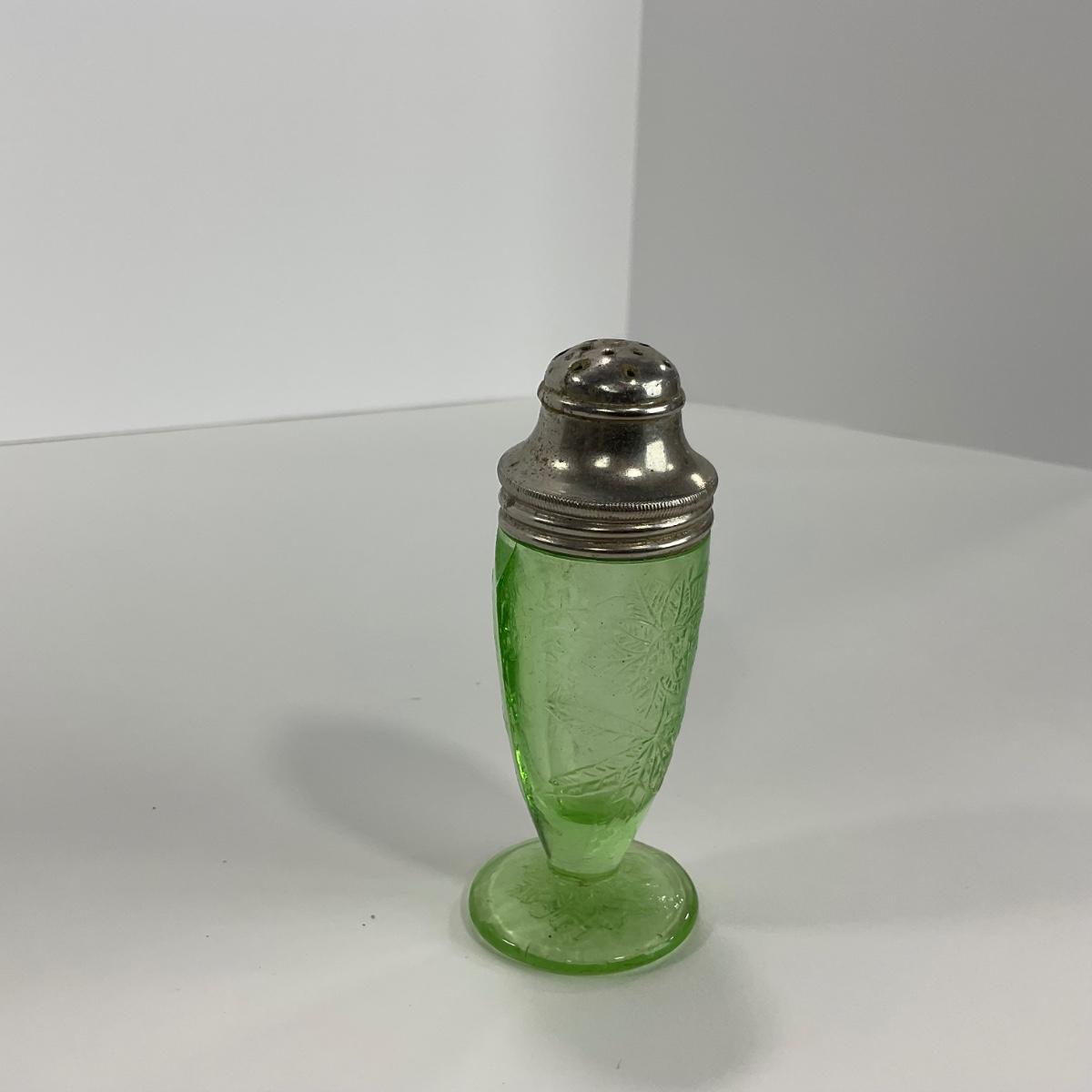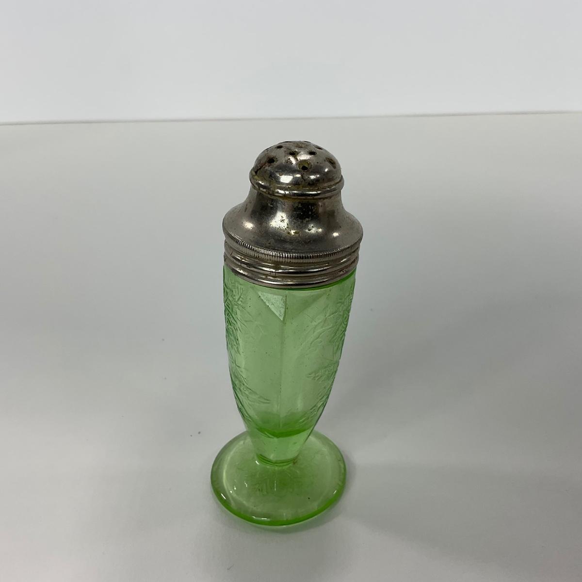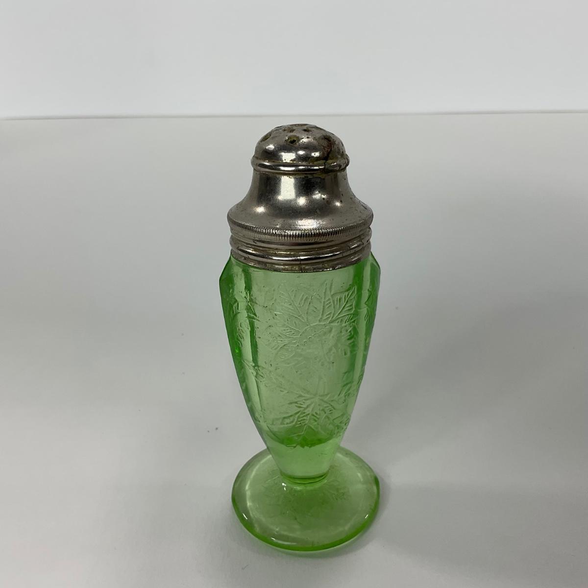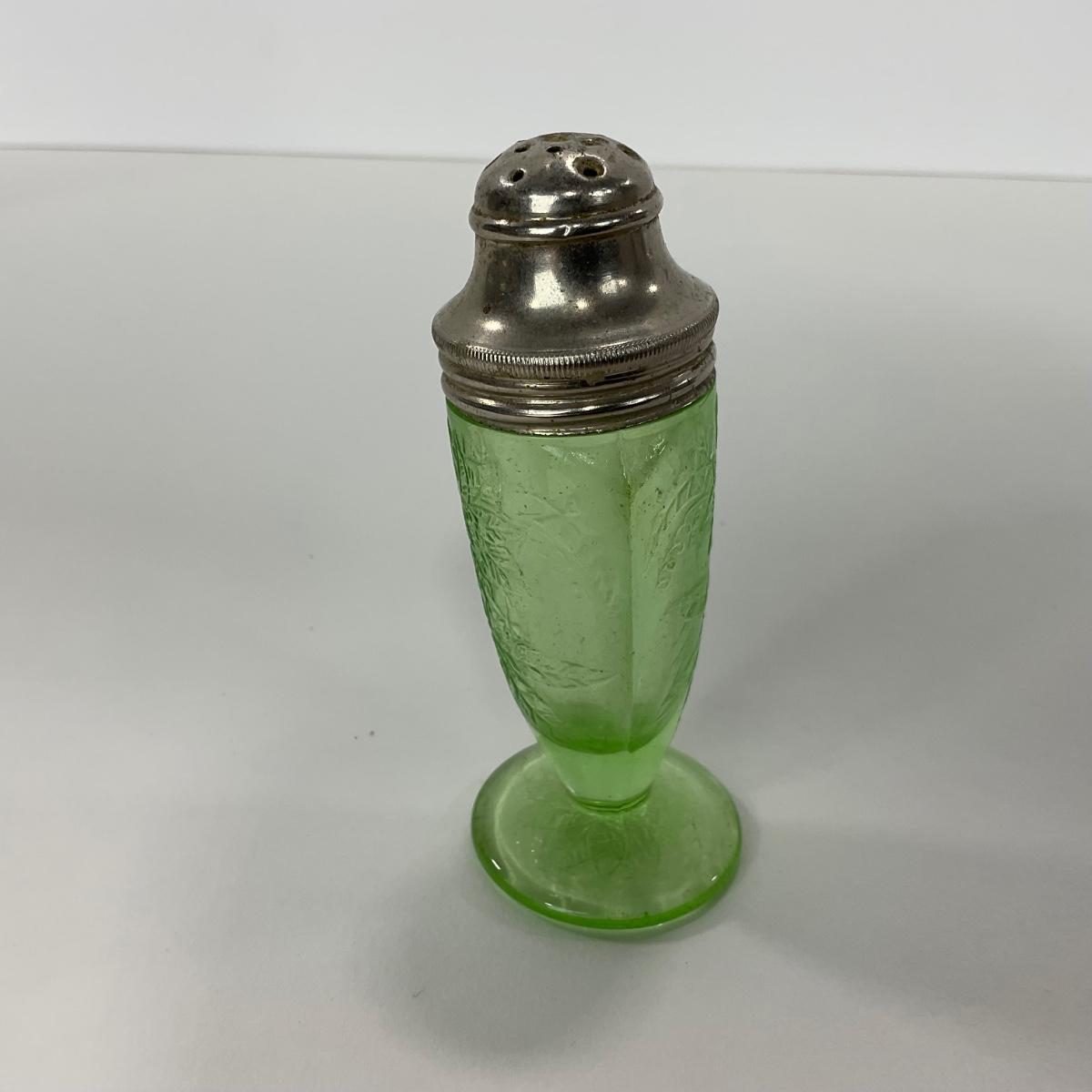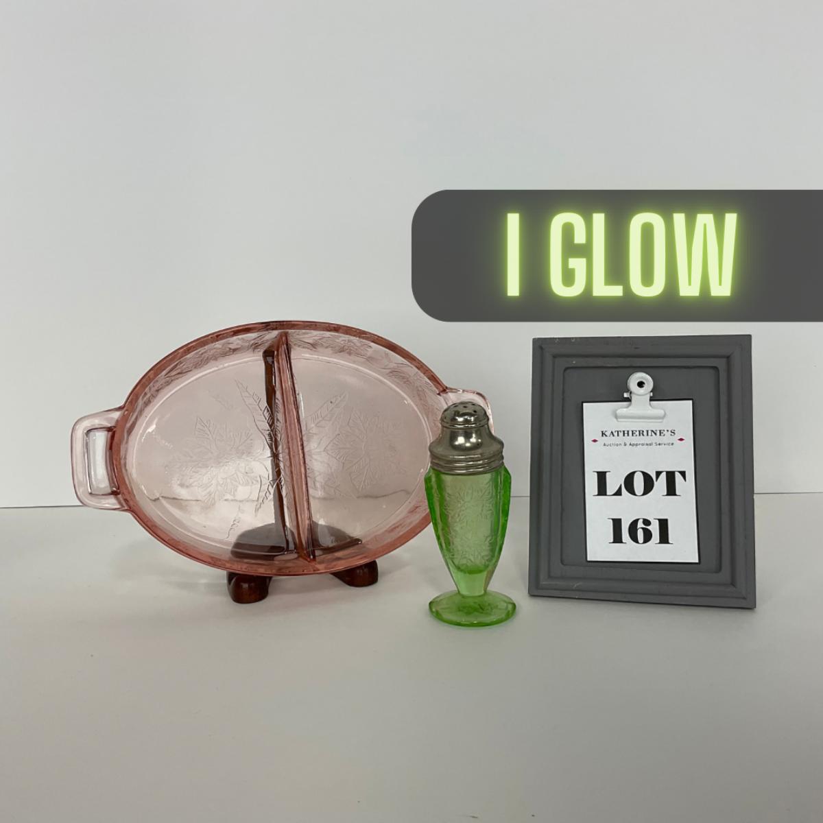 Two pieces of Floral “Poinsettia” Jeanette Glass Co. (1931-1935) including one pink depression divided dish and one green (I am Uranium glass so I DO GLOW under blacklight.) Shaker. Please see photos for details and condition. ::: Shipping is available on this lot. If you require shipping you must let us know at the close of the auction. We will coordinate with you after the item has been won. Shipping fees will include insurance up to or exceeding the value of all items being mailed. If you have any questions regarding this lot please contact the auctioneer either via this website, by direct email or by phone. PICK UP TIMES and other important information can be found in the TERMS and DESCRIPTION of the auction. Please take a look for pertinent information. Thanks!