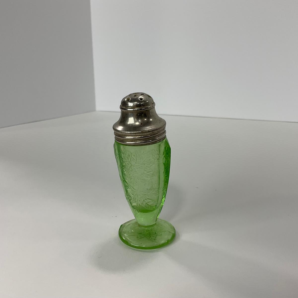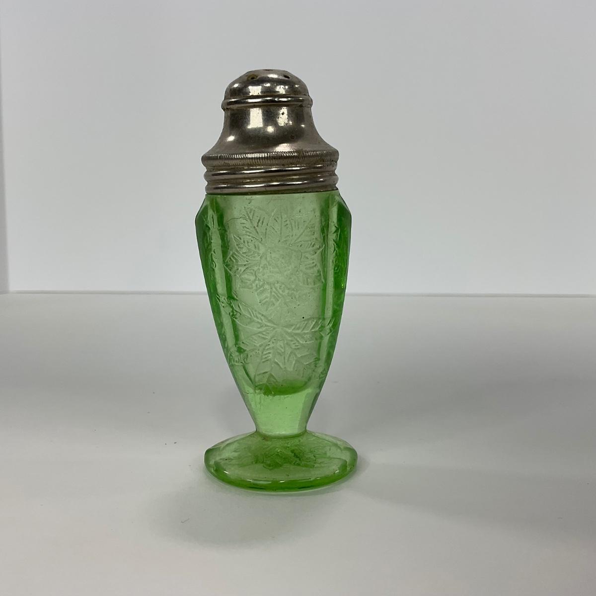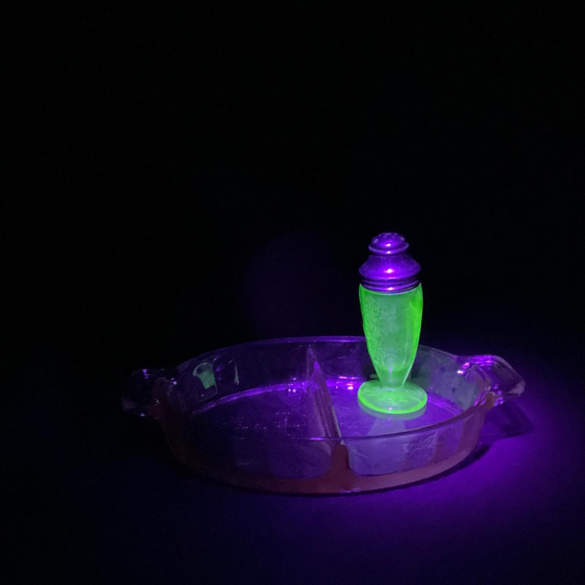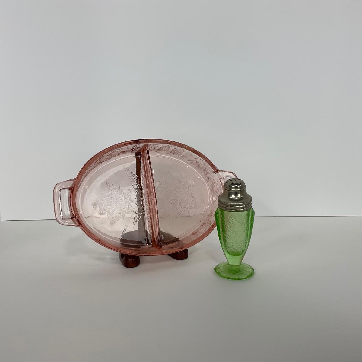 -161- URANIUM | Floral “Poinsettia” Jeanette Glass Co. | Divided Dish & Shaker