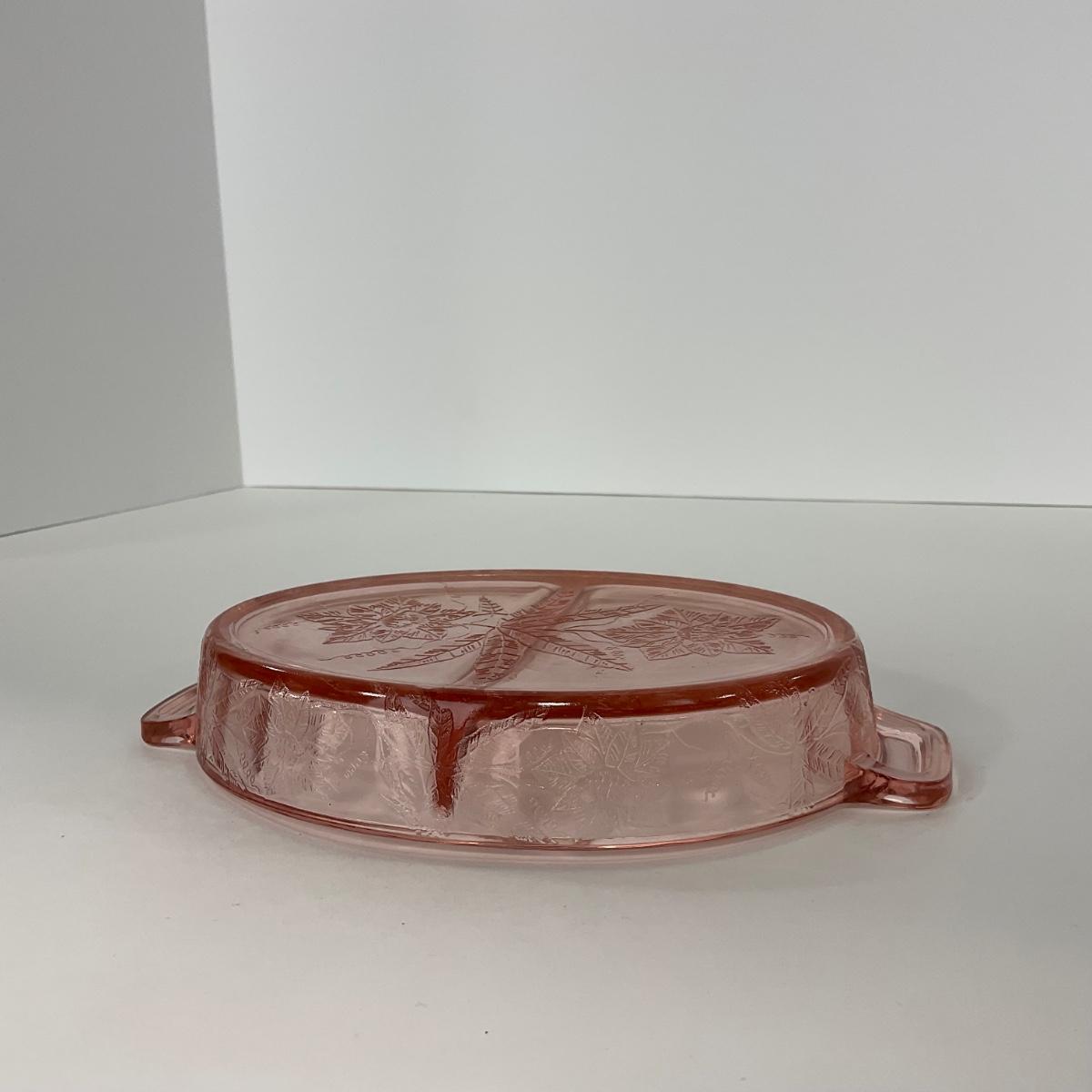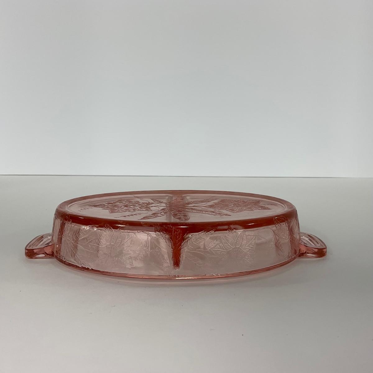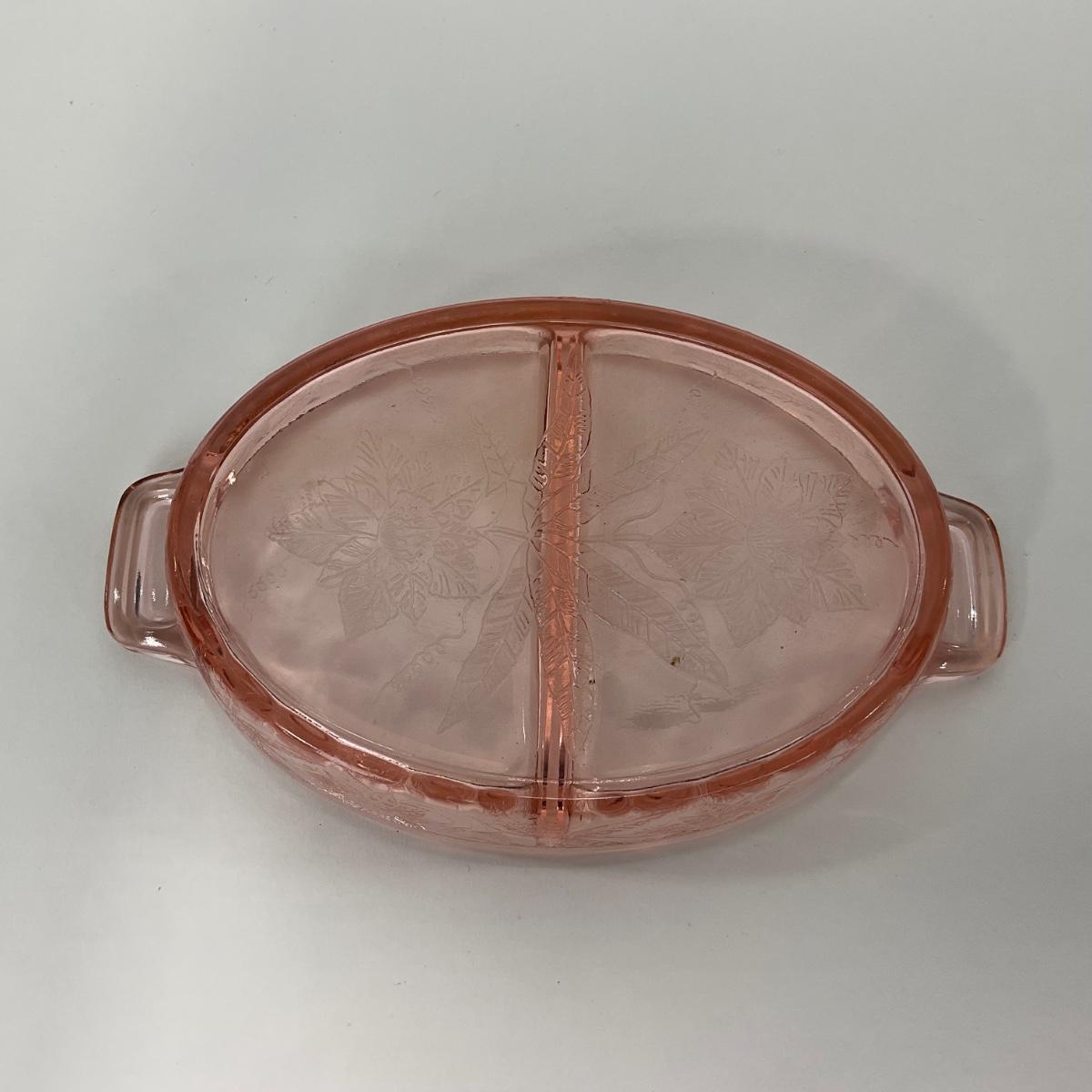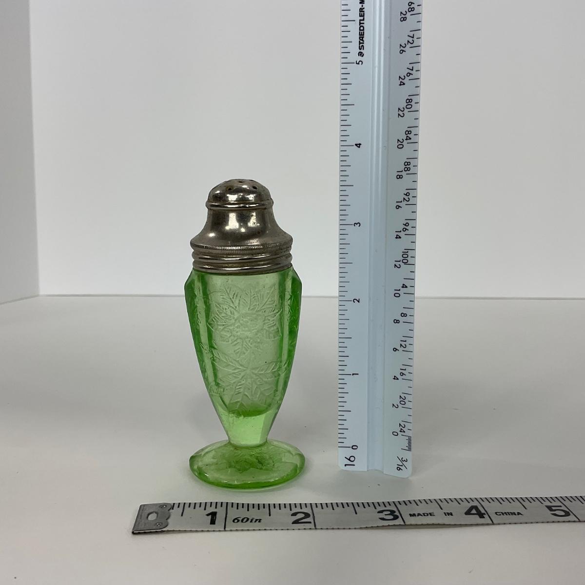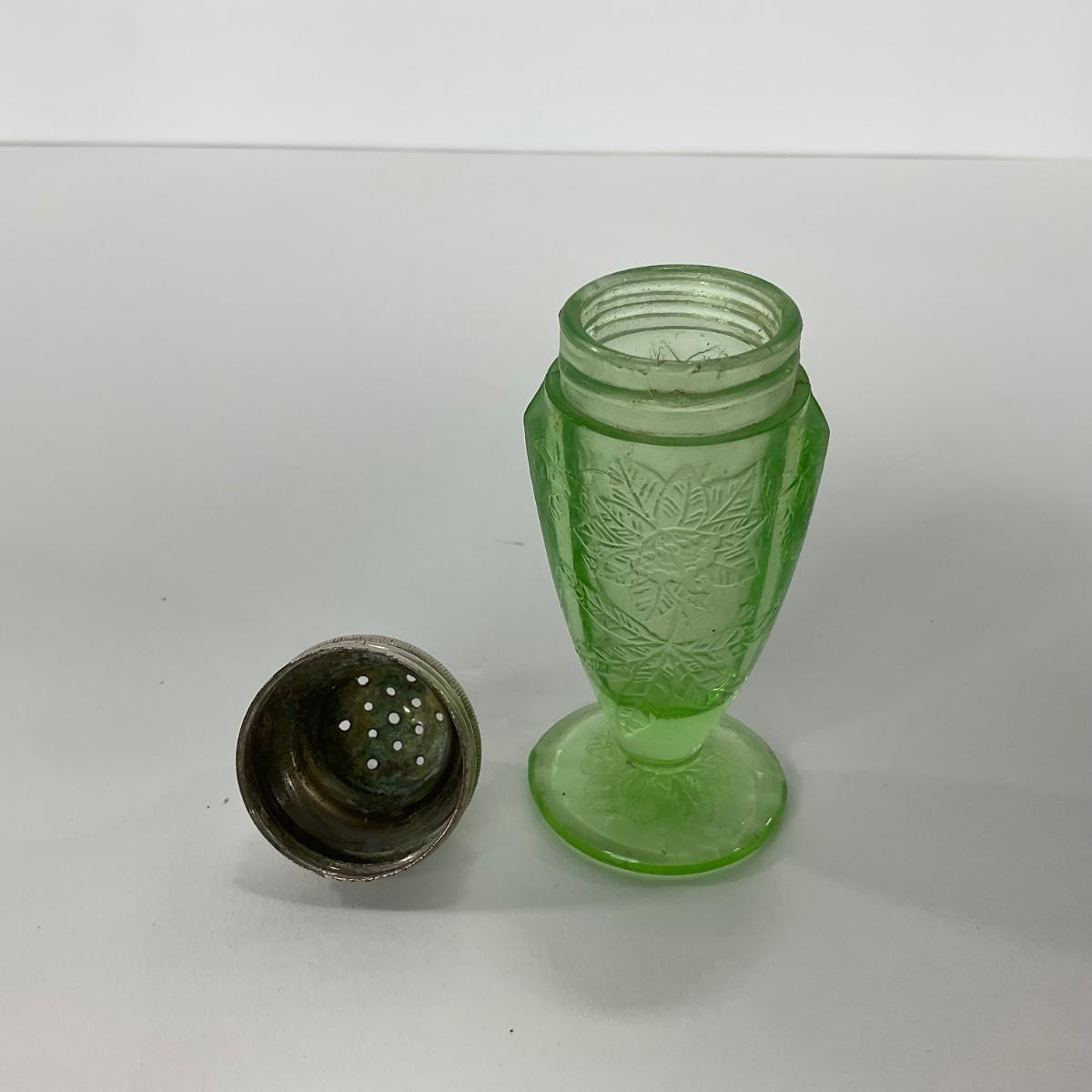 -161- URANIUM | Floral “Poinsettia” Jeanette Glass Co. | Divided Dish & Shaker