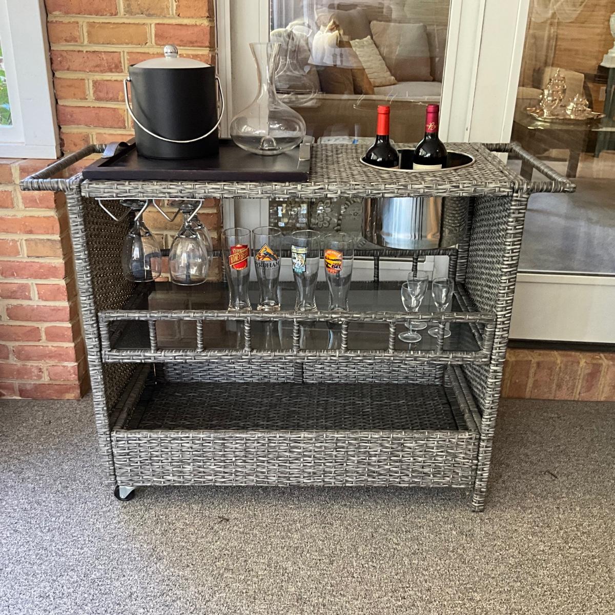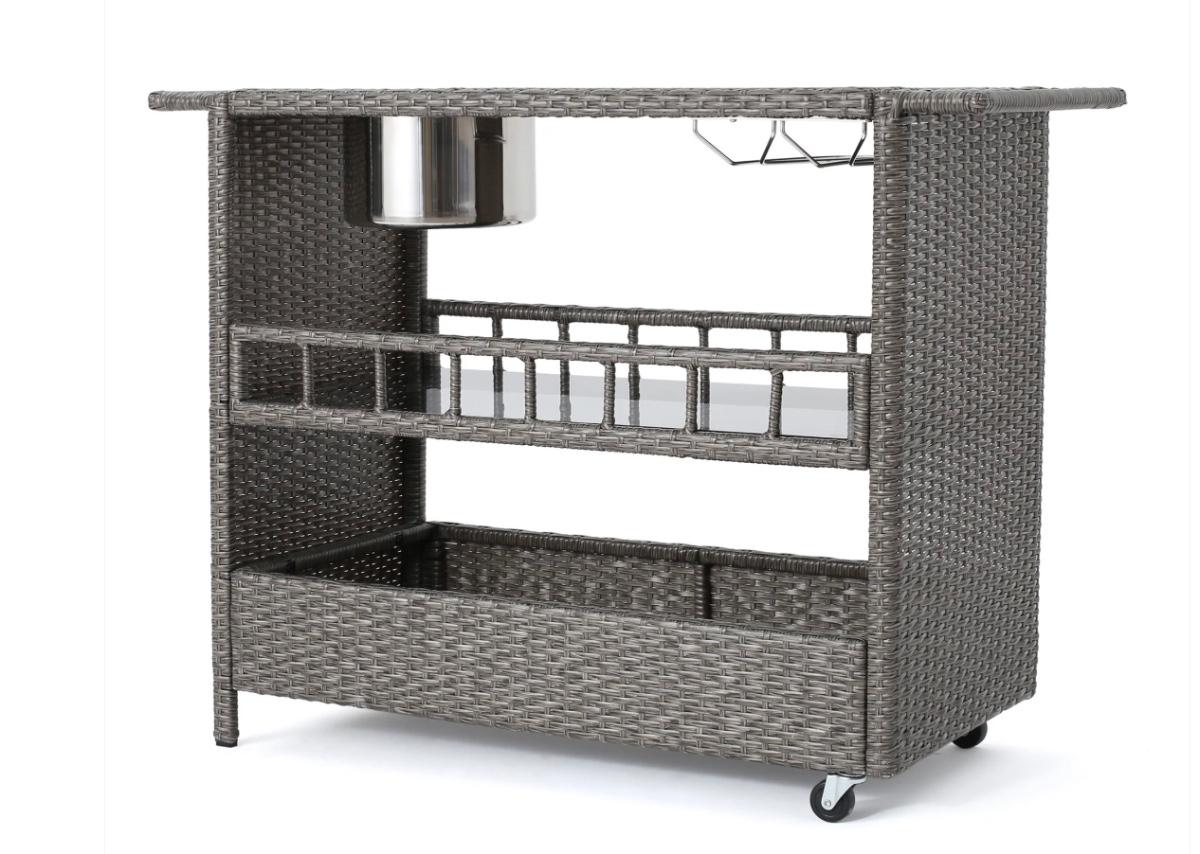 This bar cart has everything that you would want from a barcart. Featuring top quality wicker wrapped tightly around the frame of the barcart with a large ice bucket for keeping the wine chilled. With space for a couple of wine glasses for serving and a tempered glass shelf to help store small dessert plates for serving the cakes neatly placed on top of the cart. the bottom features a deep storage bin for extra plates, utensils and napkins for all of your hosting needs. This barcart does it all!