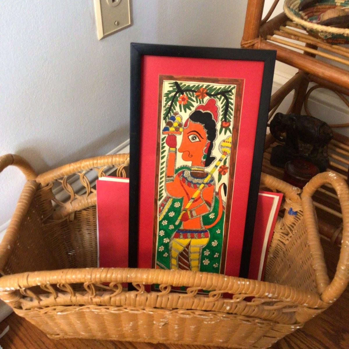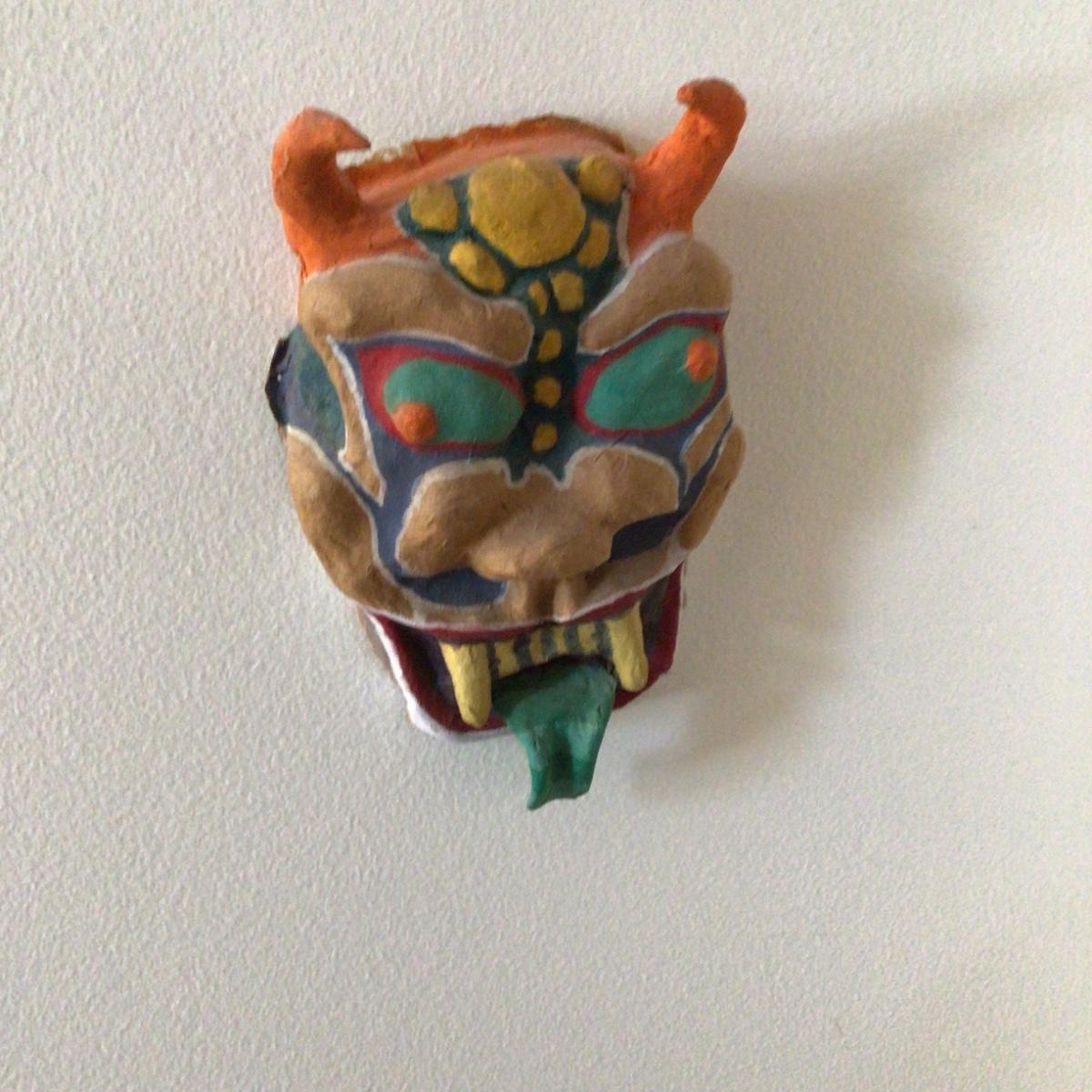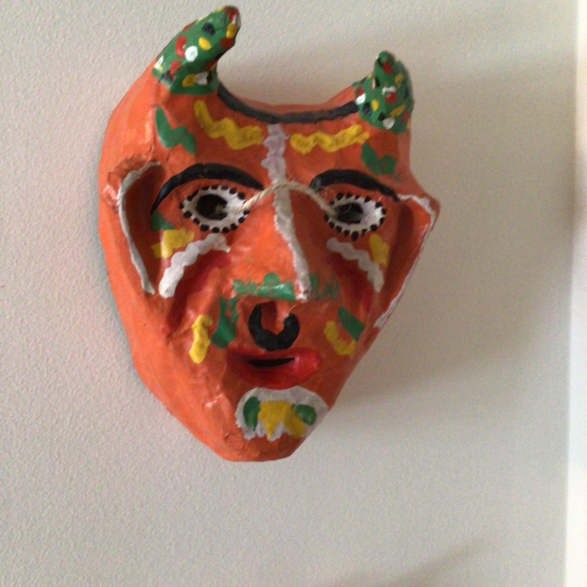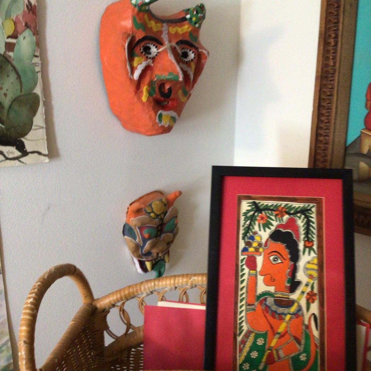 There are 2 paper mache masks and a framed art print of a brightly painted lady with basket.