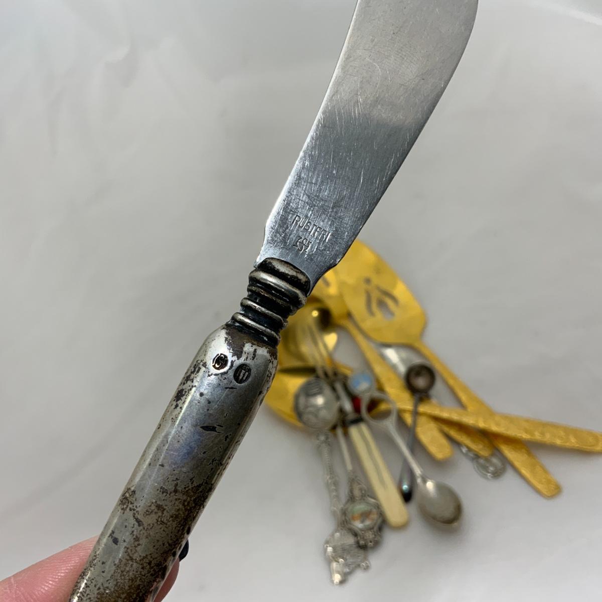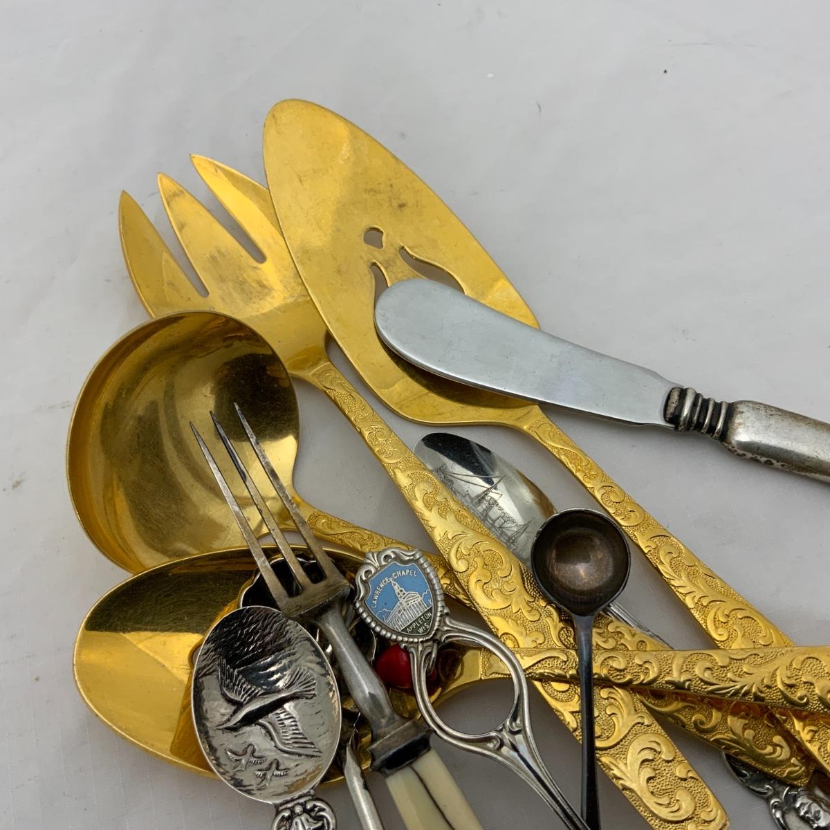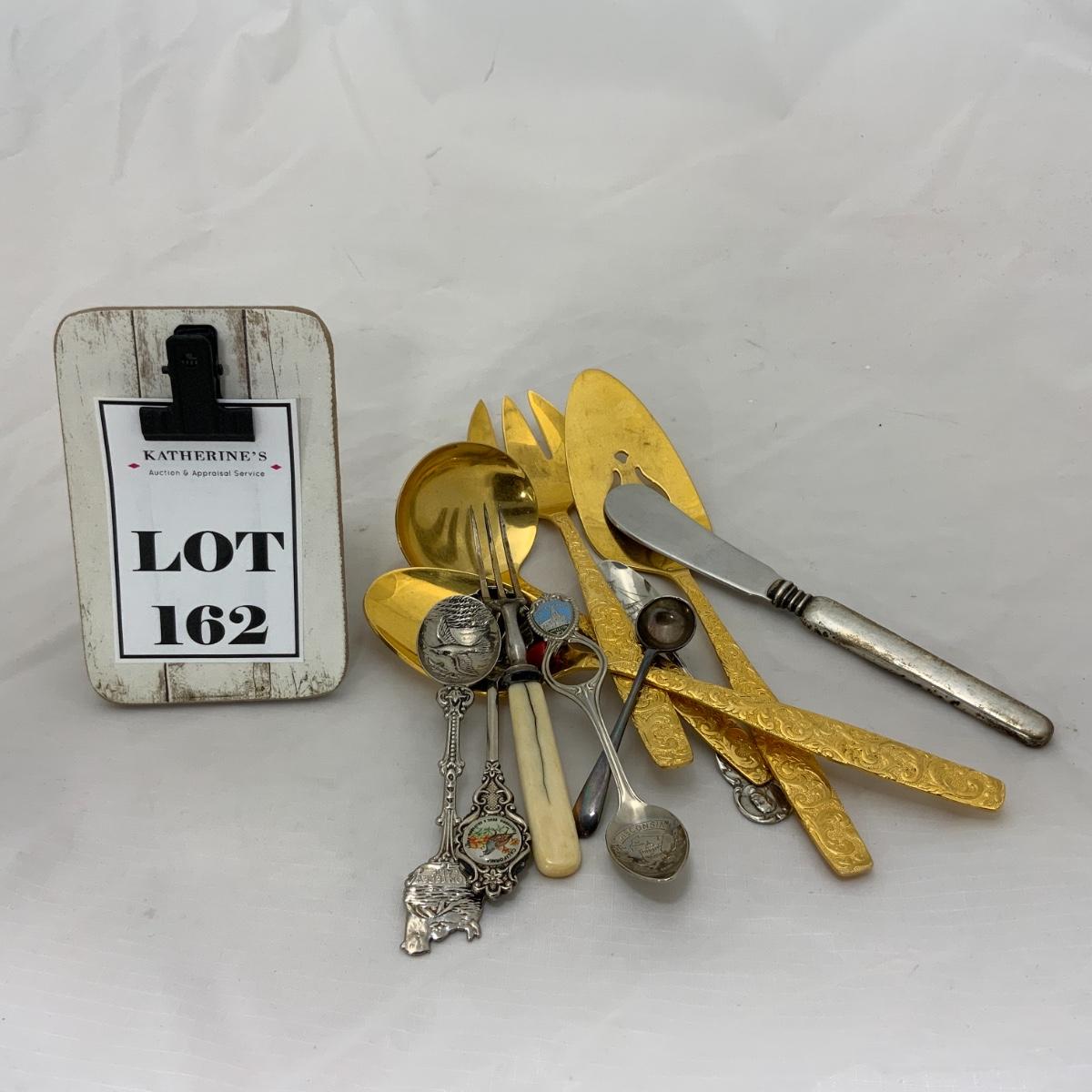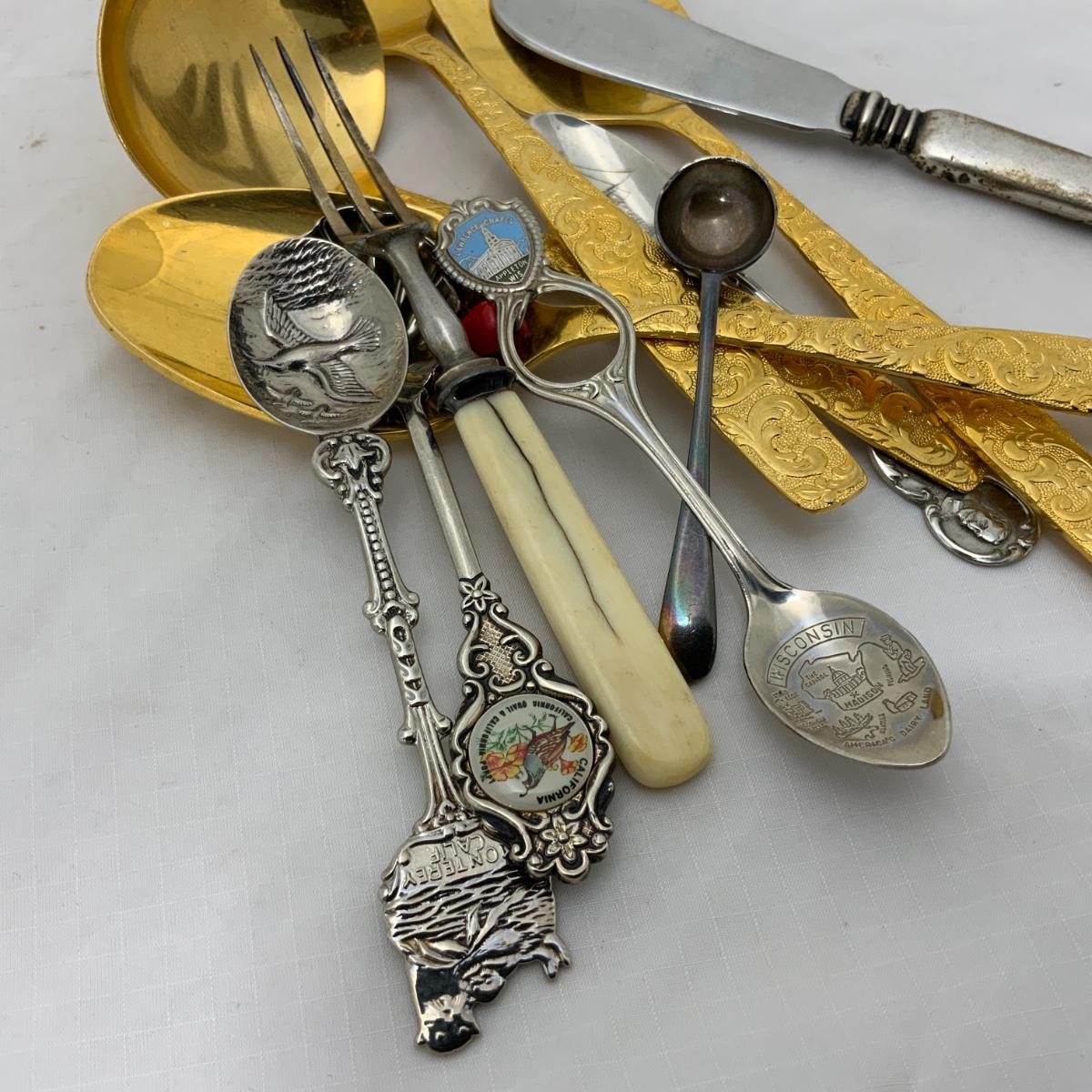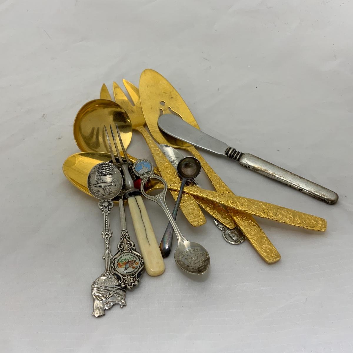 From the Estate of Peter and Alice Radovanovich: A small mixed lot of Flatware. Some golden utensils, some silver plated collector spoons all in fine used condition. Please see photos for details and condition. ::: Shipping is NOT available on this lot. If you have any questions regarding this lot please contact the auctioneer either via this website, by direct email or by phone. PICK UP TIMES and other important information can be found in the TERMS and DESCRIPTION of the auction. Please take a look for pertinent information. Thanks!
