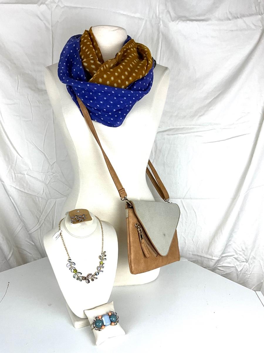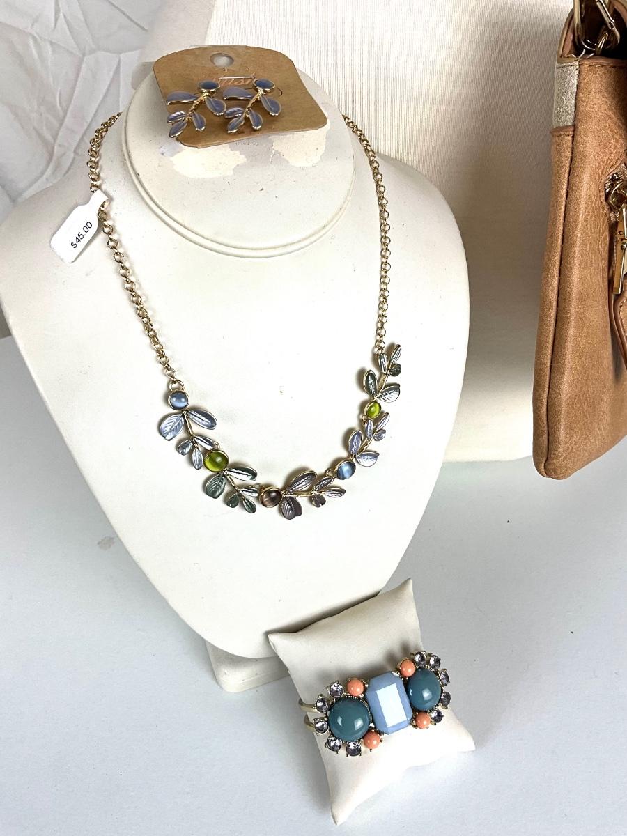 Purse is new with small stain on front suede flap, Floral Necklace with matching earrings , large chunky cuff bracelet