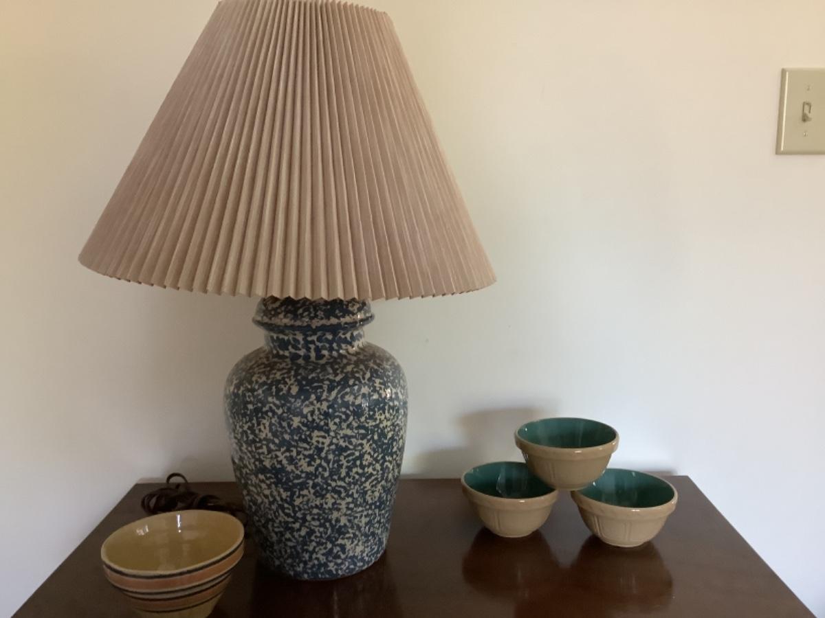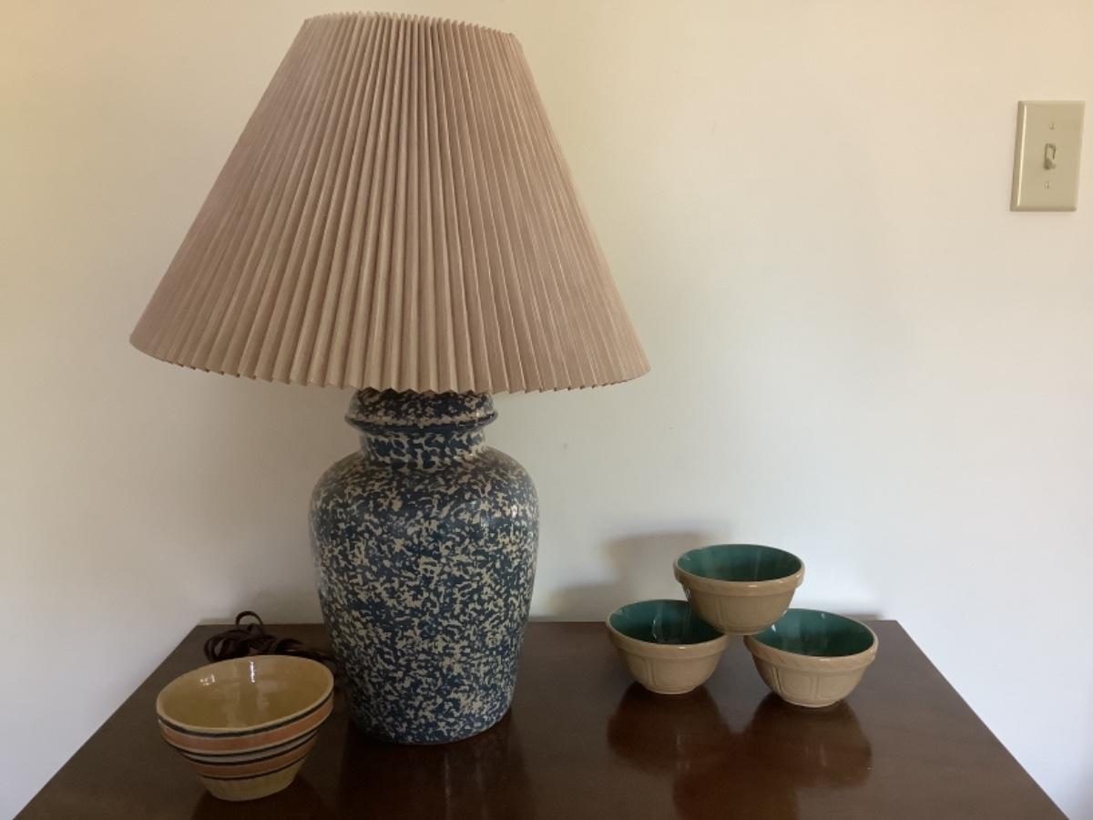 162. Splatterware Lamp & 4 Small Pottery Bowls