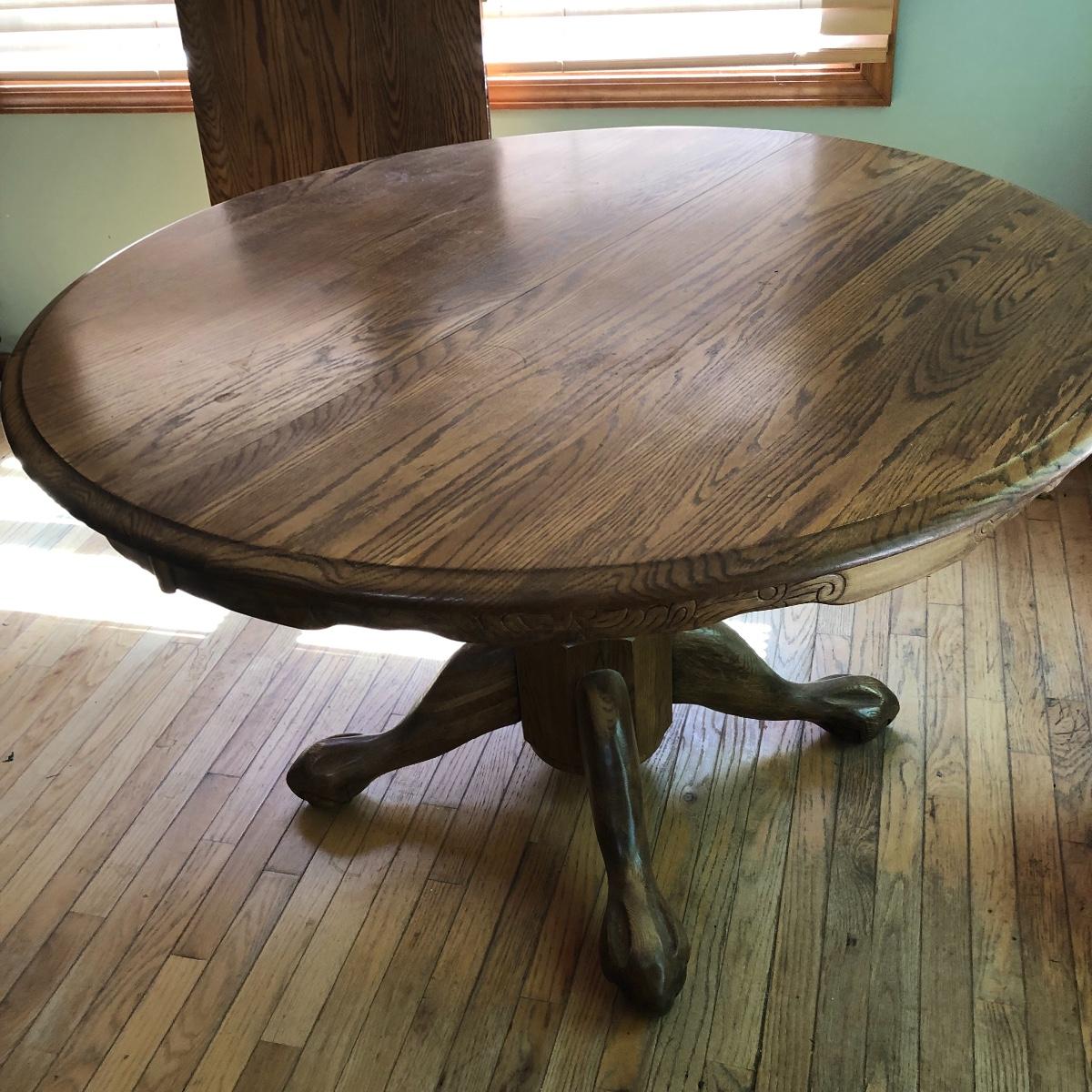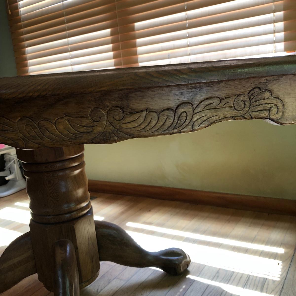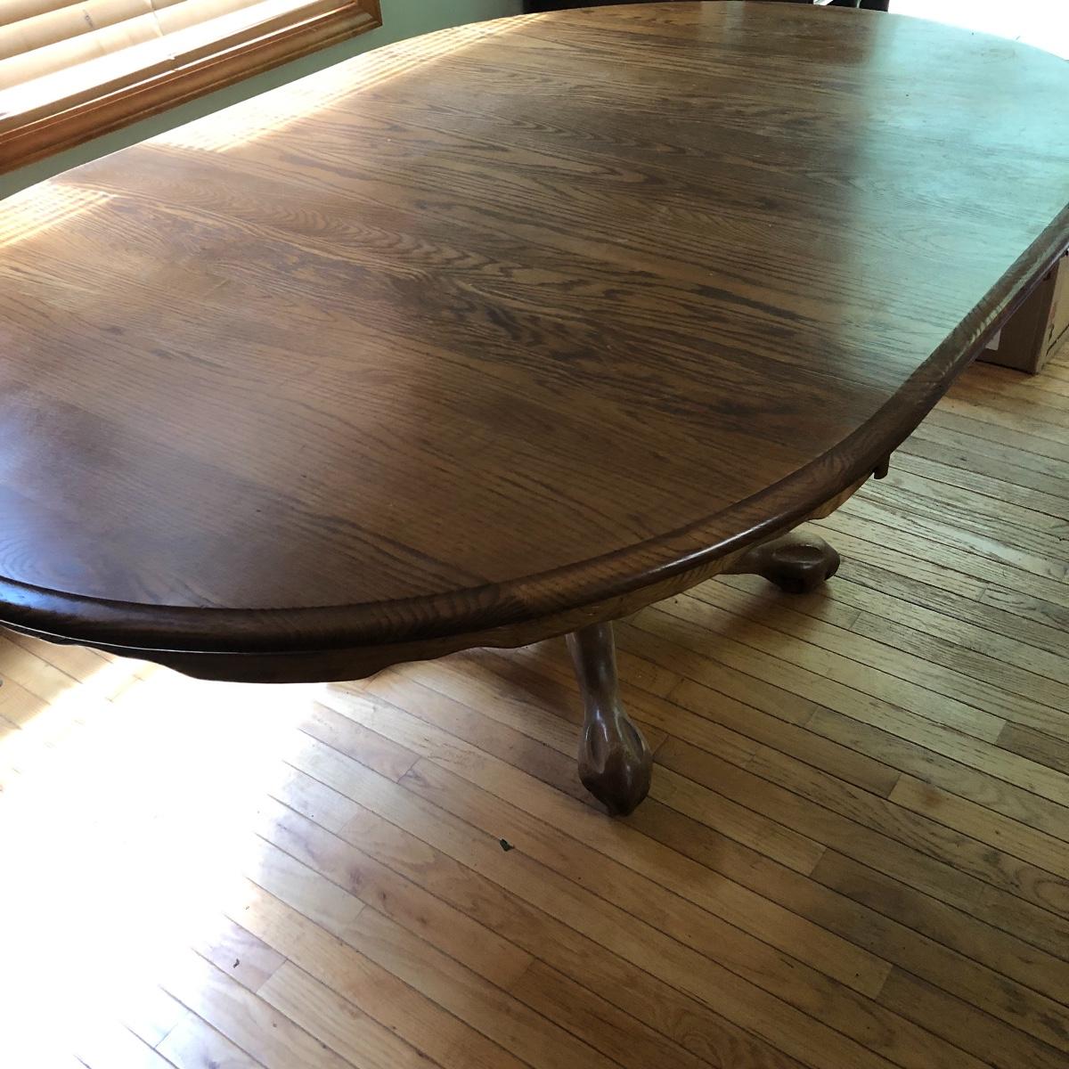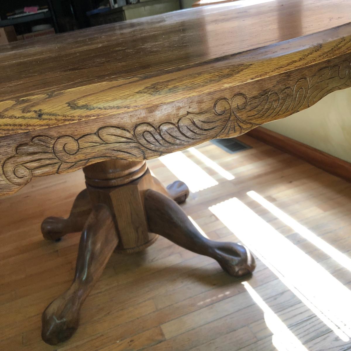 Enjoy meals on this sturdy oak Clawfoot table! Note how it expands with the leaf. With the leaf, it measures 48” x 72”. Without the leaf, the table becomes round and measures 48” in diameter. Also, note the detail edging. There are a few faint marks on the top of the table which will come out with polish. Local pick up only.