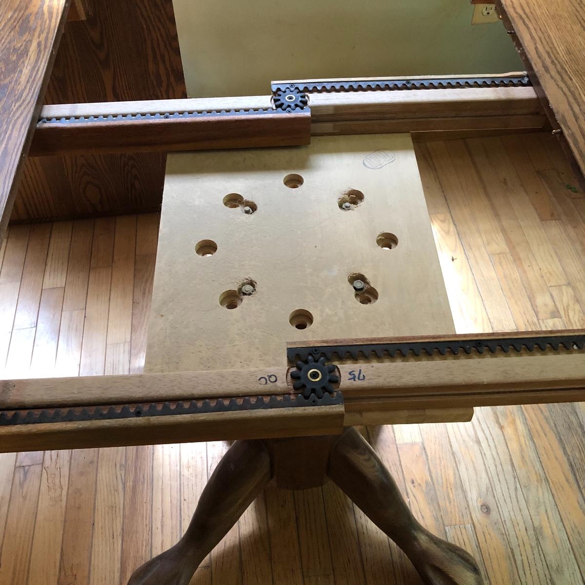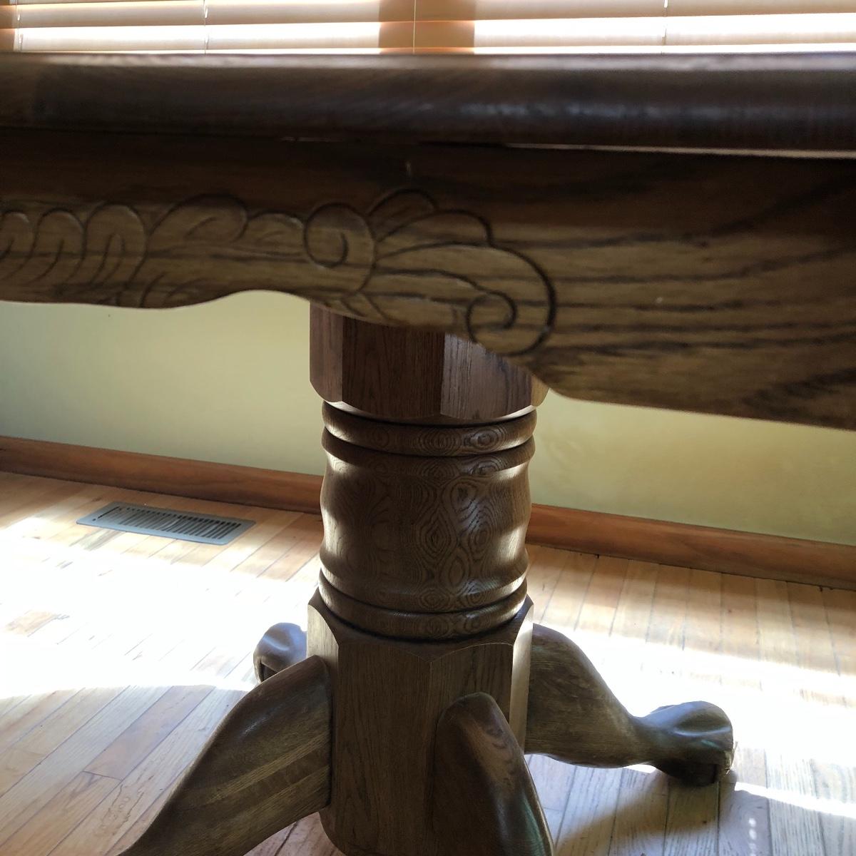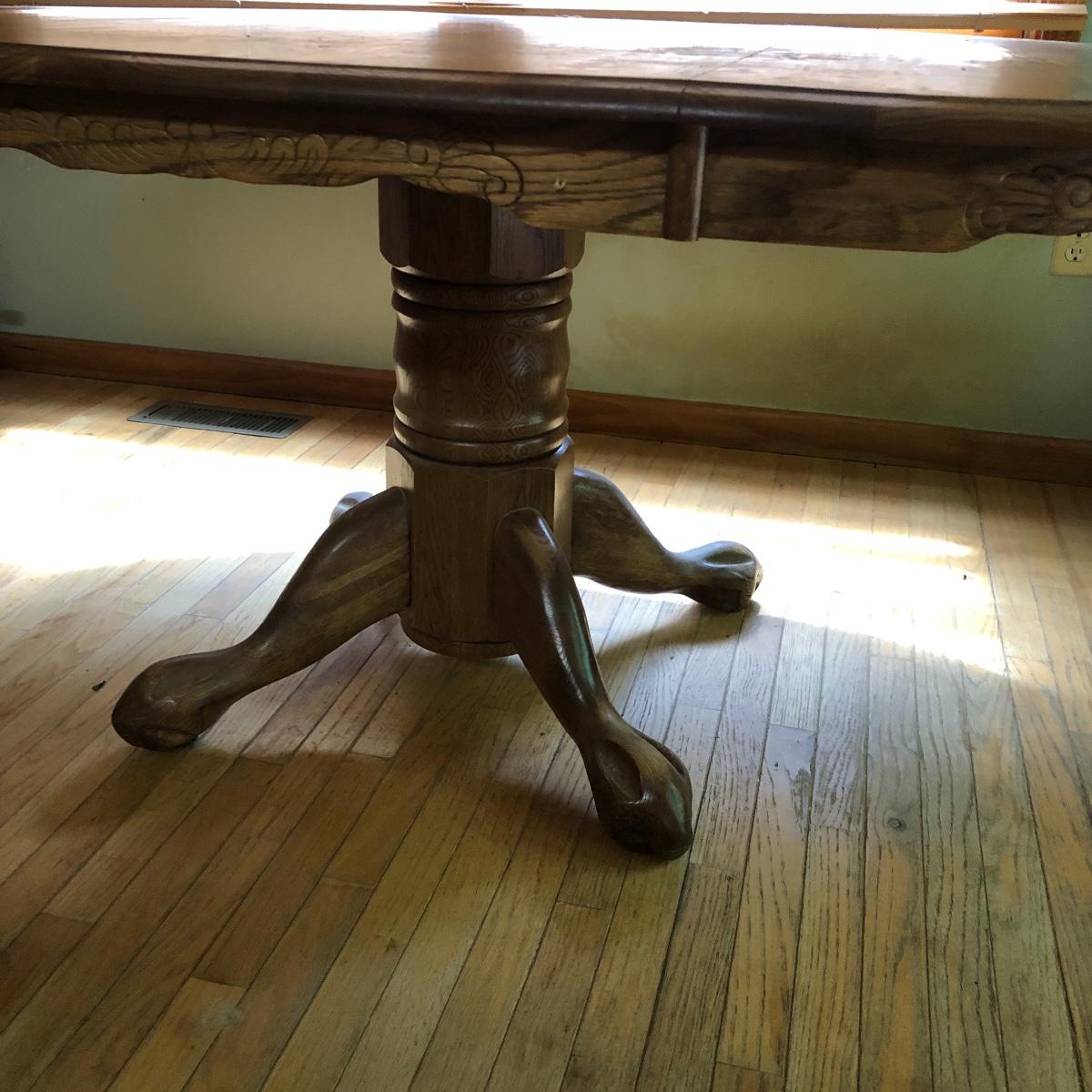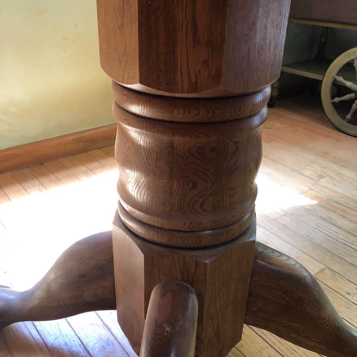 Enjoy meals on this sturdy oak Clawfoot table! Note how it expands with the leaf. With the leaf, it measures 48” x 72”. Without the leaf, the table becomes round and measures 48” in diameter. Also, note the detail edging. There are a few faint marks on the top of the table which will come out with polish. Local pick up only.