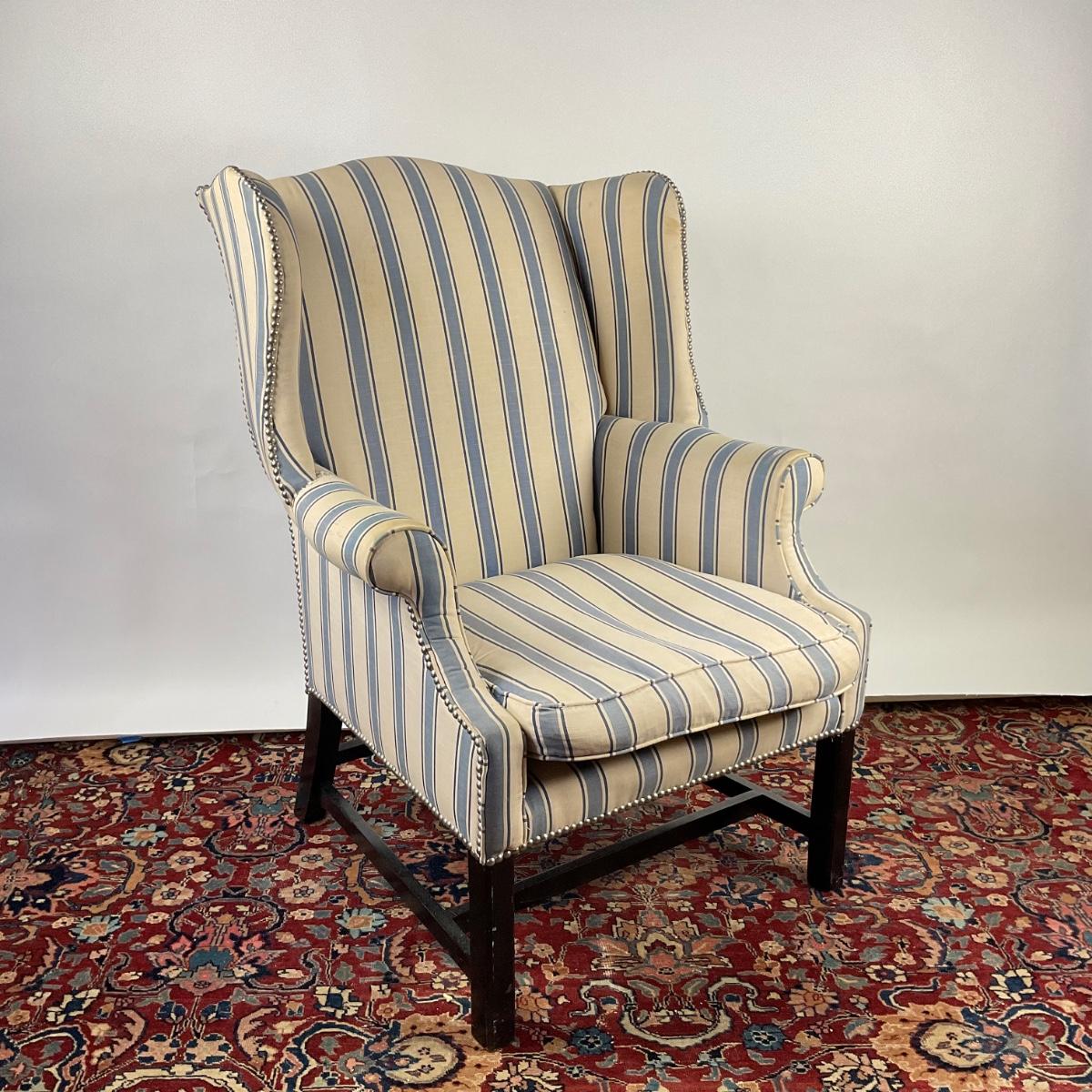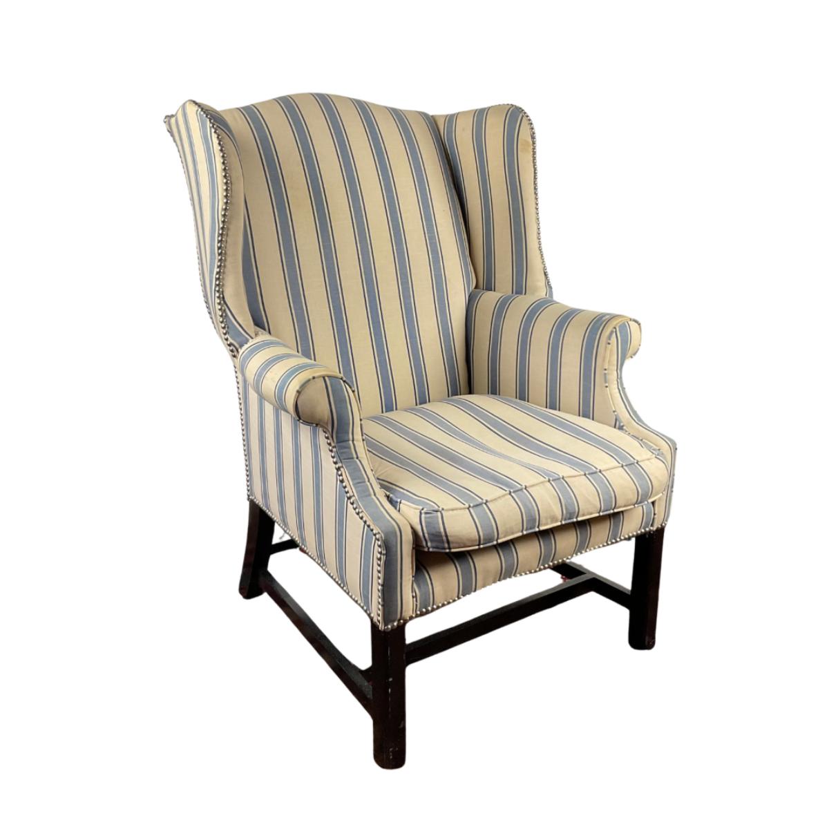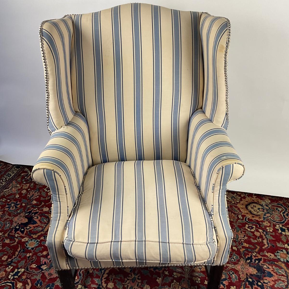 163 Blue & White Striped Wingback Chair with Silver Tac Trim