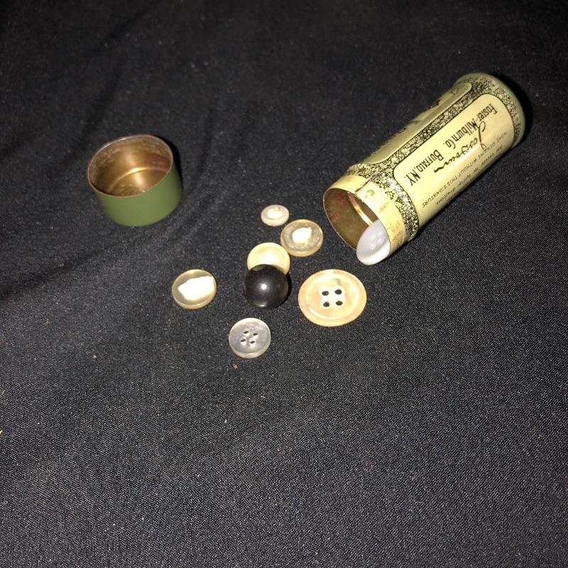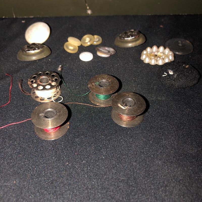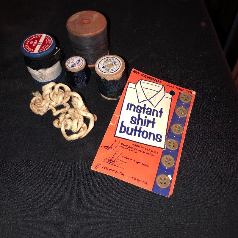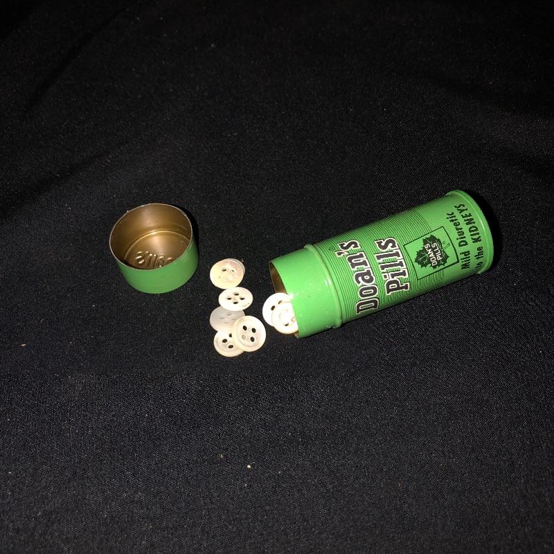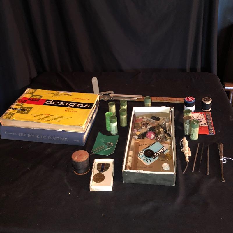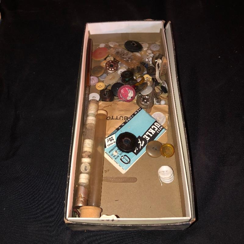 If you or a loved one sew for fun or for your career, this lot is for you! It offers a myriad of buttons, from small white ones, to flowery ones, to every day buttons that match almost anything. This lot includes several “Doan’s Pills” bottles filled with all different kinds of buttons, several different wooden and metal spools of thread, a vintage skirt marker, two books detailing different sewing techniques and so much more! Shipping available.