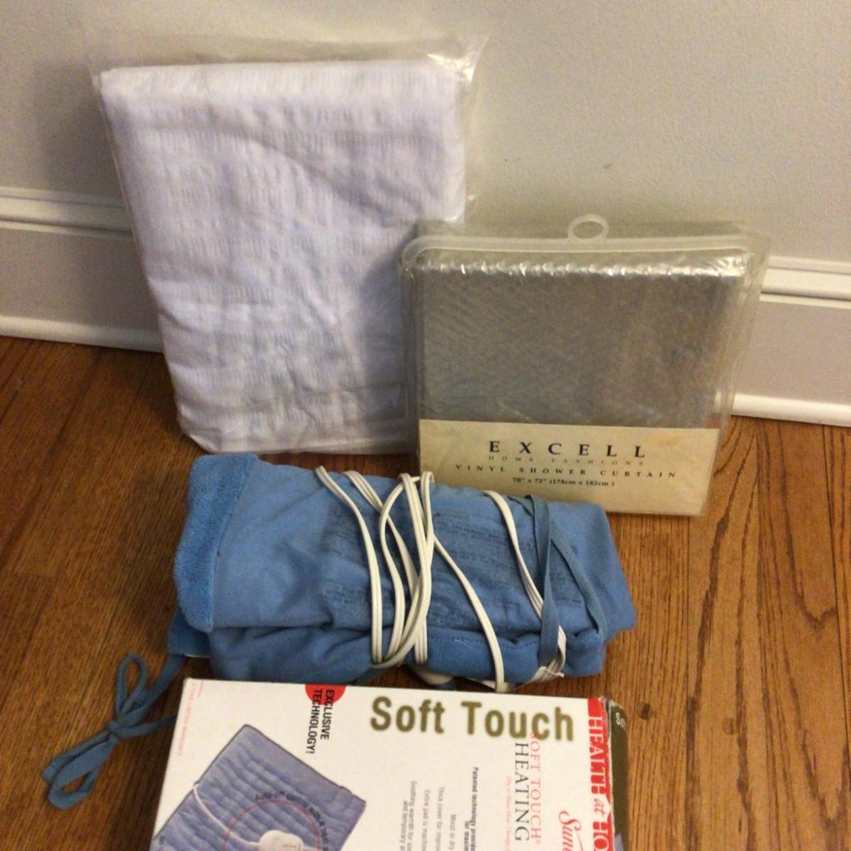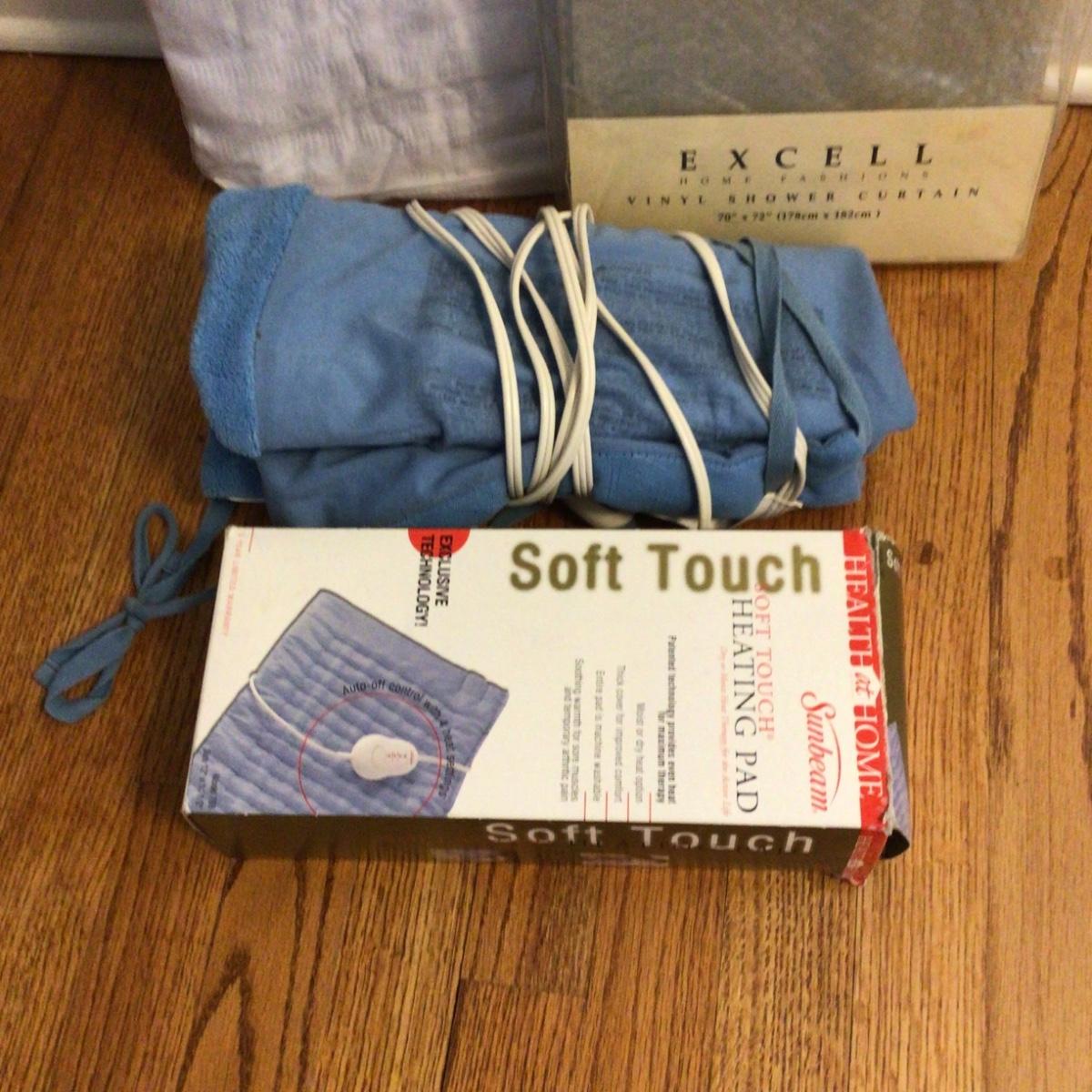 Lot contains new vinyl shower curtain liner, new white cotton shower curtain and 2 heating pads.