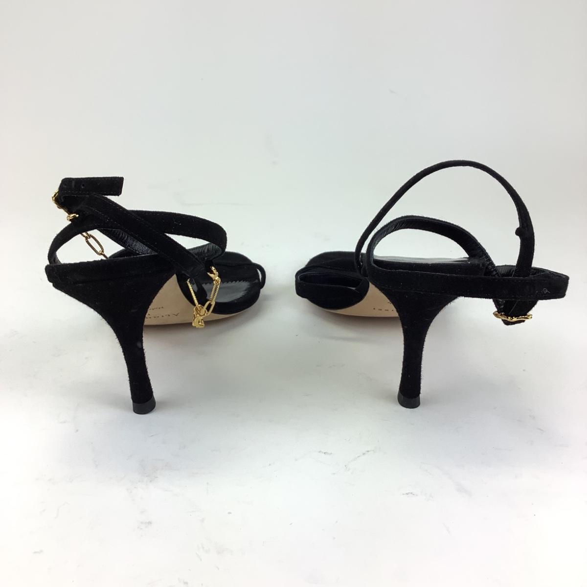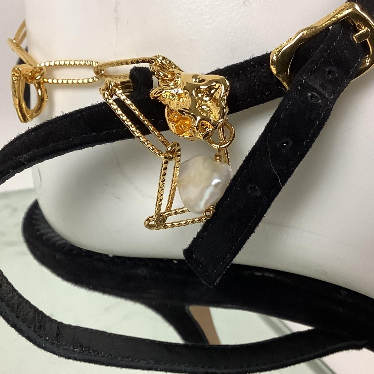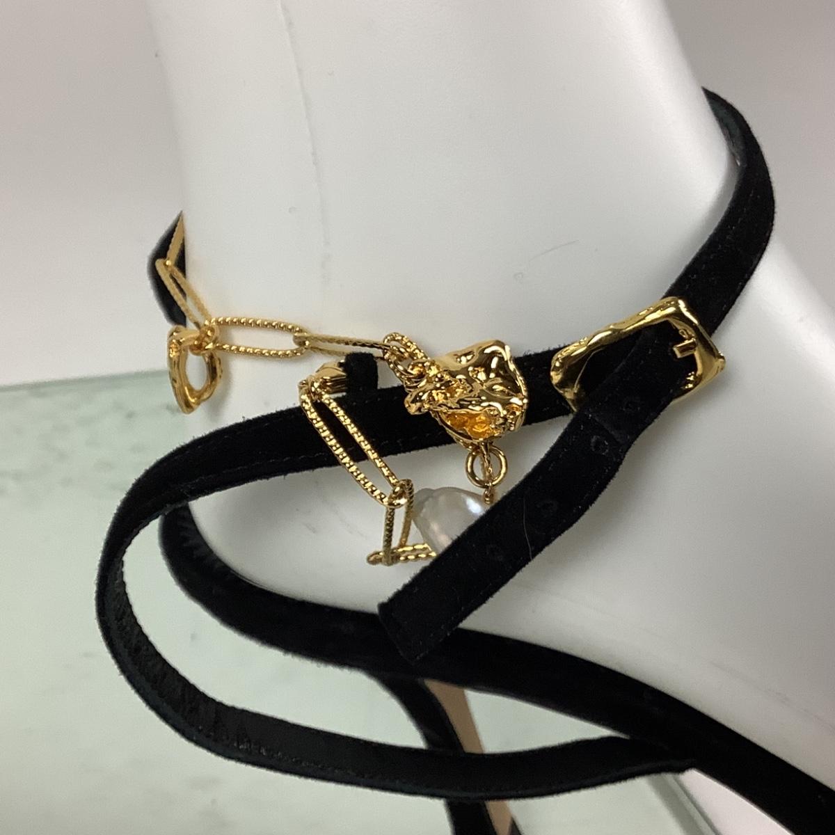 Black suede strap heel sandals with gold metal anklet is on Right heel only