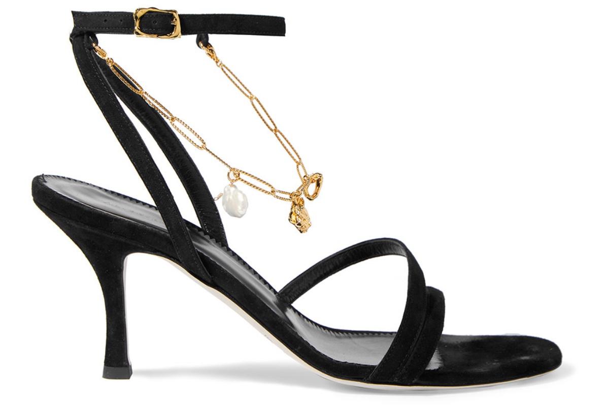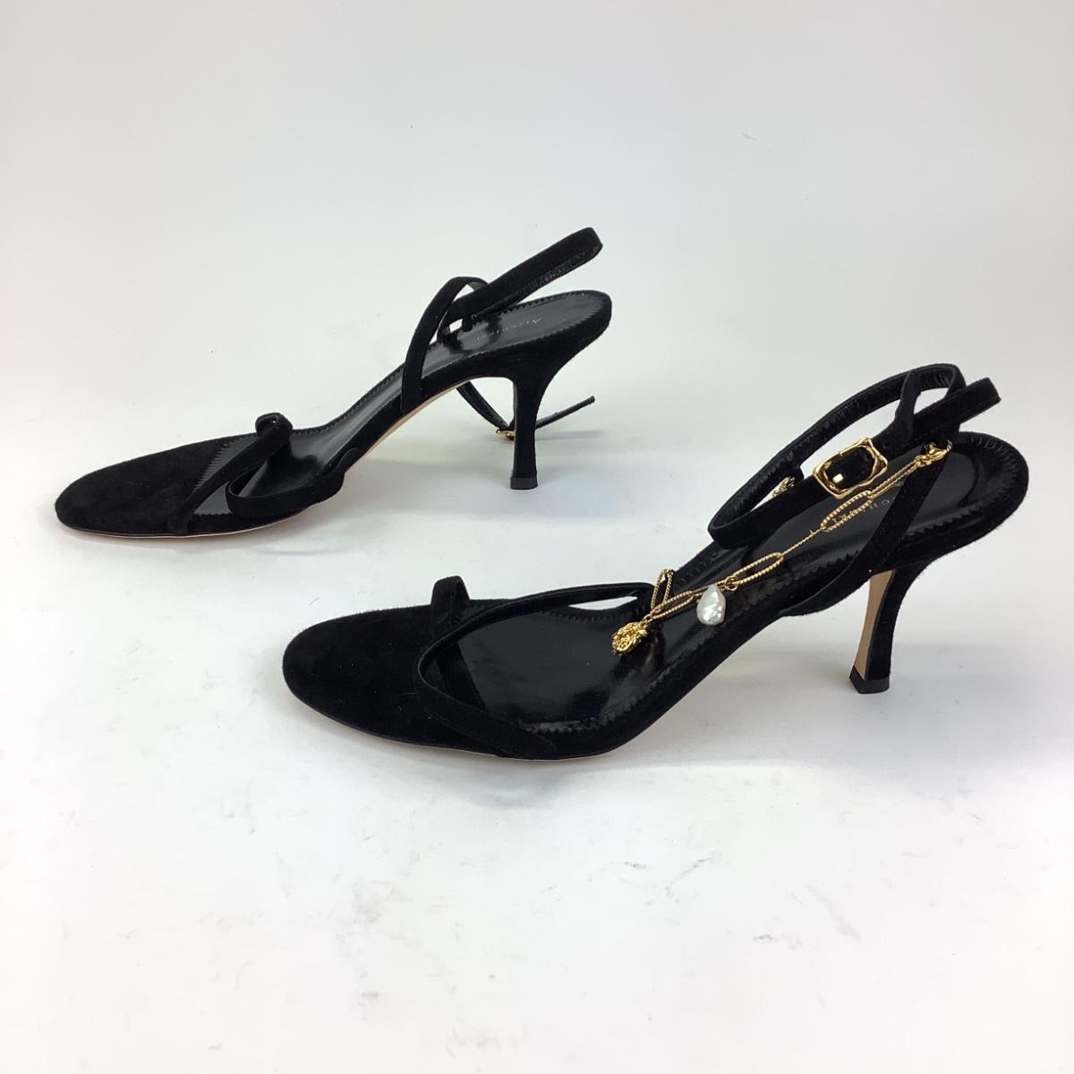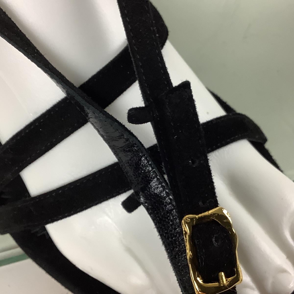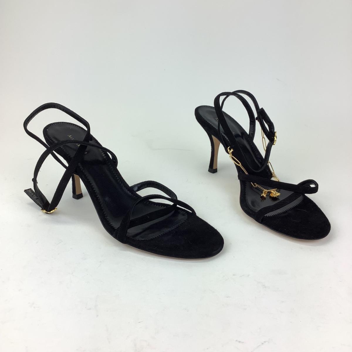 Black suede strap heel sandals with gold metal anklet is on Right heel only
