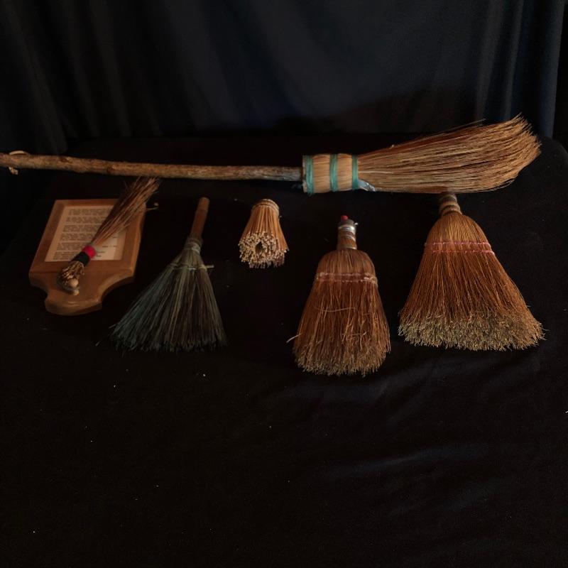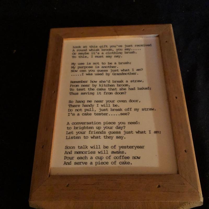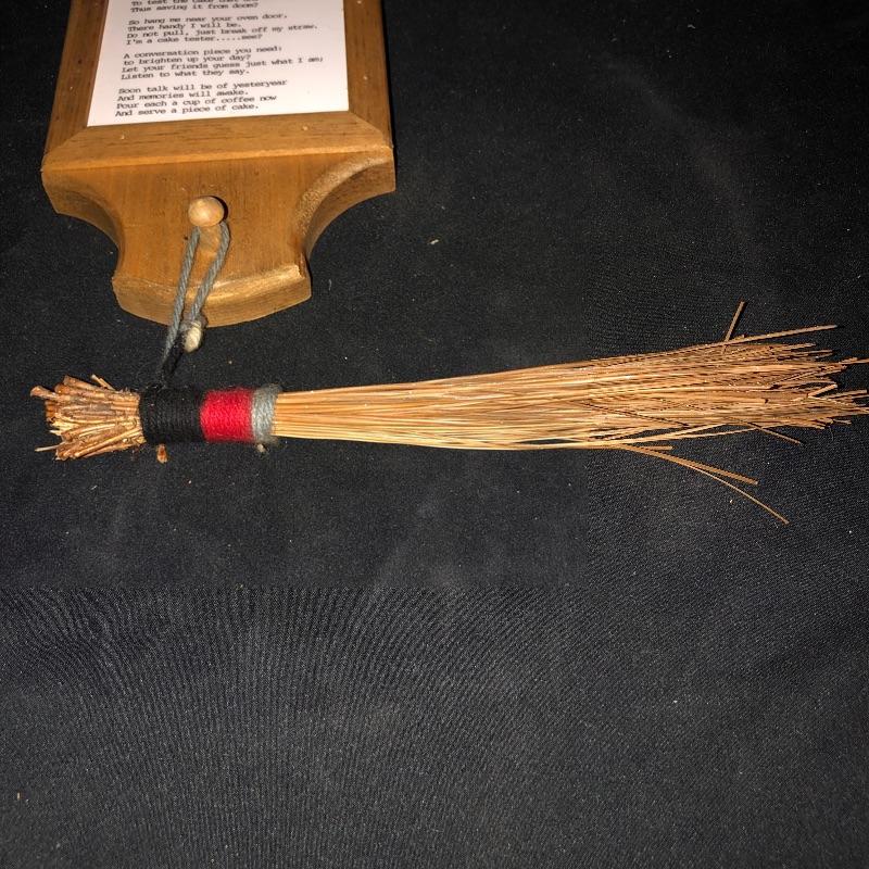 This lot of brooms is unique and multi-purposeful. It contains a special item, a homemade “cake tester” that the seller’s grandmother made! As it describes on the plaque, if you break off one of the straws, you can stick it in your cake to see if it’s ready or not. The rest of the brooms can be used for decoration or just sweeping, specifically the long one (35” long). The smallest is 5.5” long. Local pickup only.