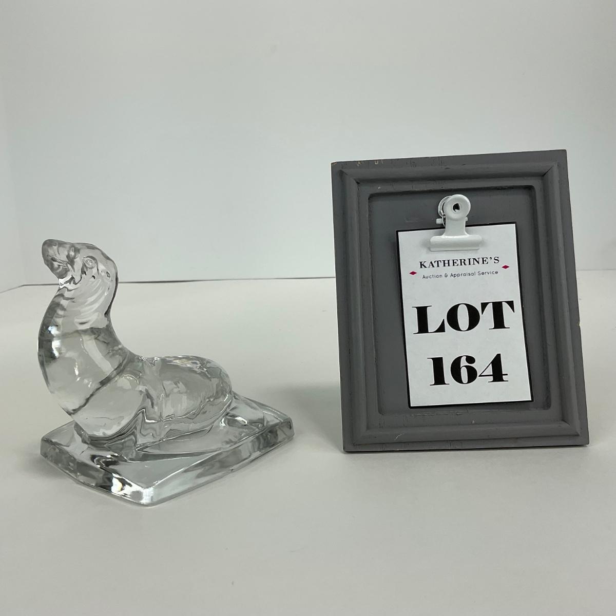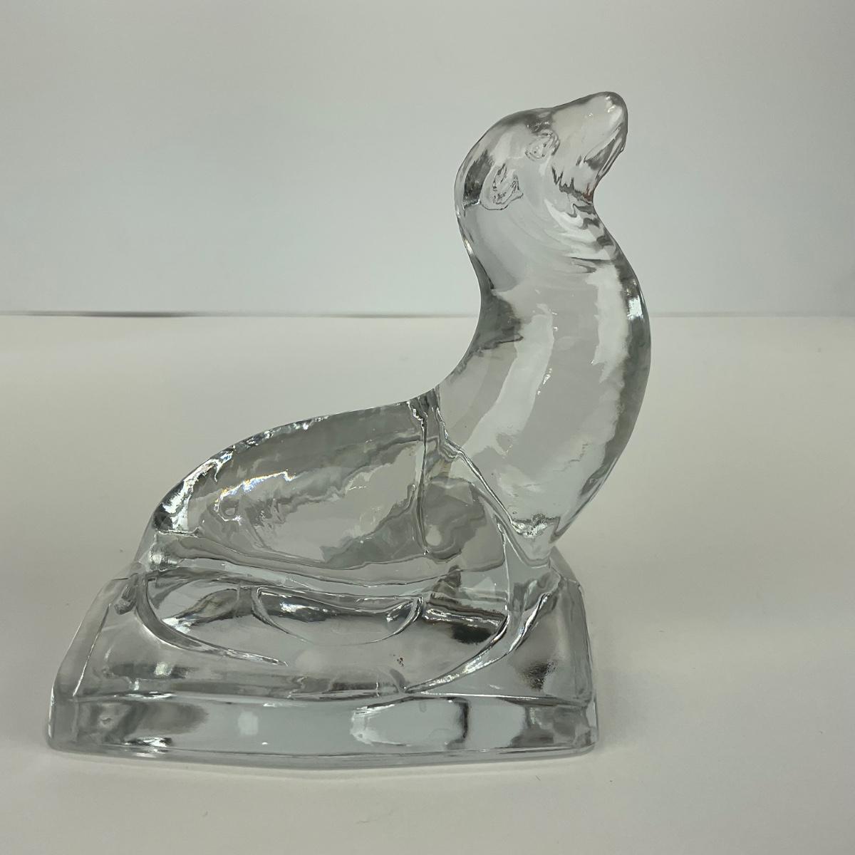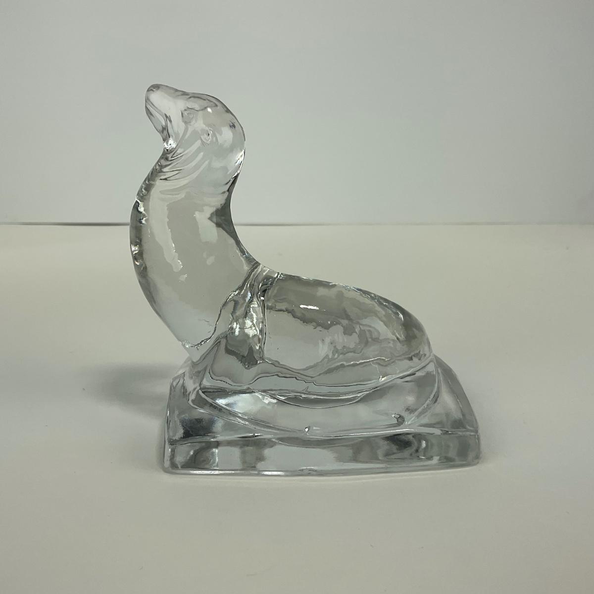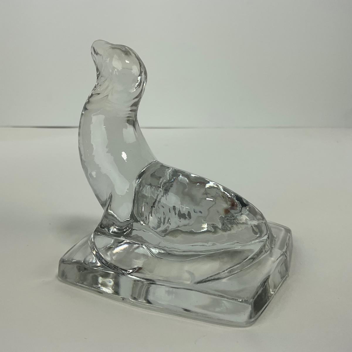 One Fostoria clear glass seal figure with a few small chips on the bottom base. This piece does have some scuffs, scratches, marks, or slight damage, but otherwise appears to be in great shape. Please see photos for details and condition. Any condition statement is given as a courtesy to a client, is an opinion, and should not be treated as a statement of fact. Reference to condition written, oral or within a condition report shall not be regarded as a full account of condition and may not include all defects, alterations, or restorations. Absence of a condition report does not imply a lot is flawless or lacking imperfections or damage. Katherine’s Auction & Appraisal Service shall have no responsibility for any error or omission. Returns shall not be accepted on the basis of condition. ::: Shipping is available on this lot. If you require shipping you must let us know at the close of the auction. We will coordinate with you after the item has been won. Shipping fees will include insurance up to or exceeding the value of all items being mailed. If you have any questions regarding this lot please contact the auctioneer either via this website, by direct email or by phone. PICK UP TIMES and other important information can be found in the TERMS and DESCRIPTION of the auction. Please take a look for pertinent information. Thanks!