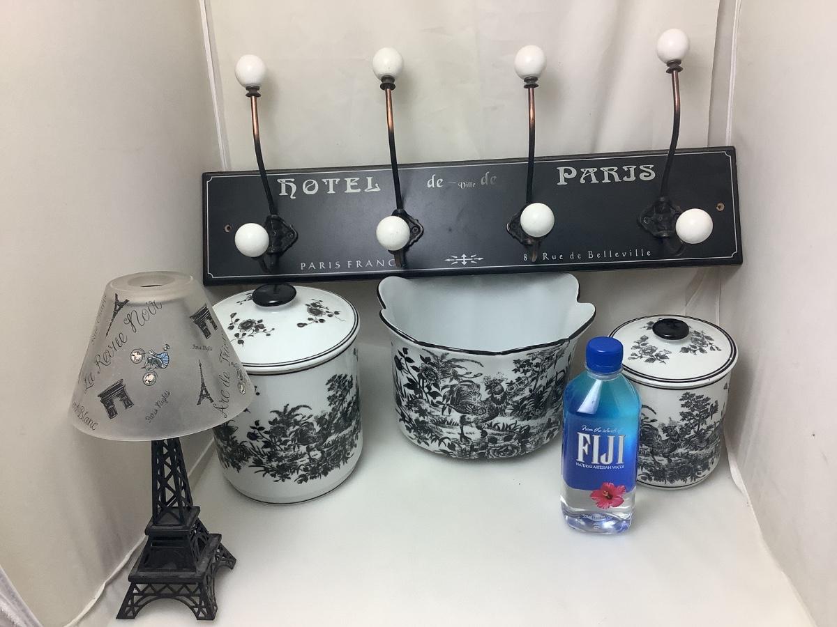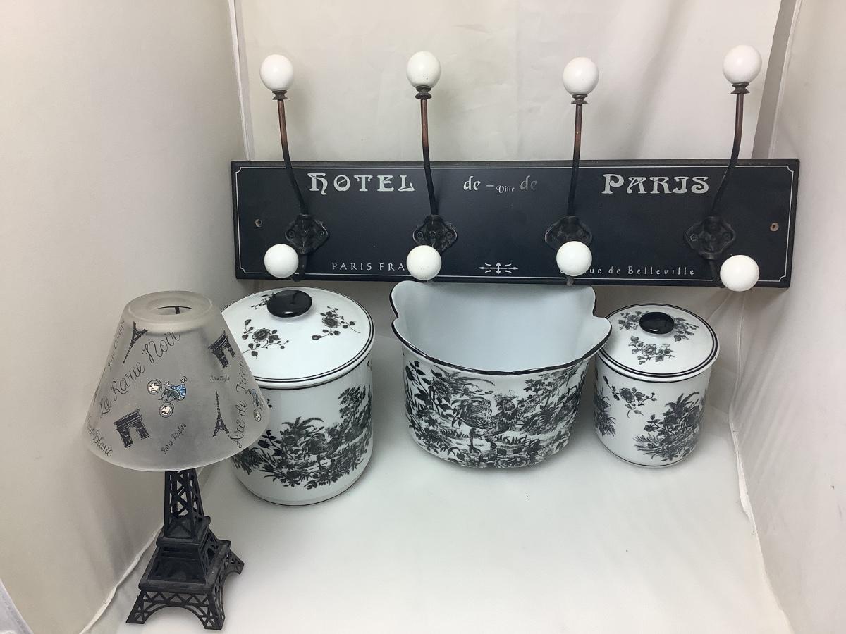 Porcelain black and white toile covered jars and flower pot with eiffel tower lamp, and bottle