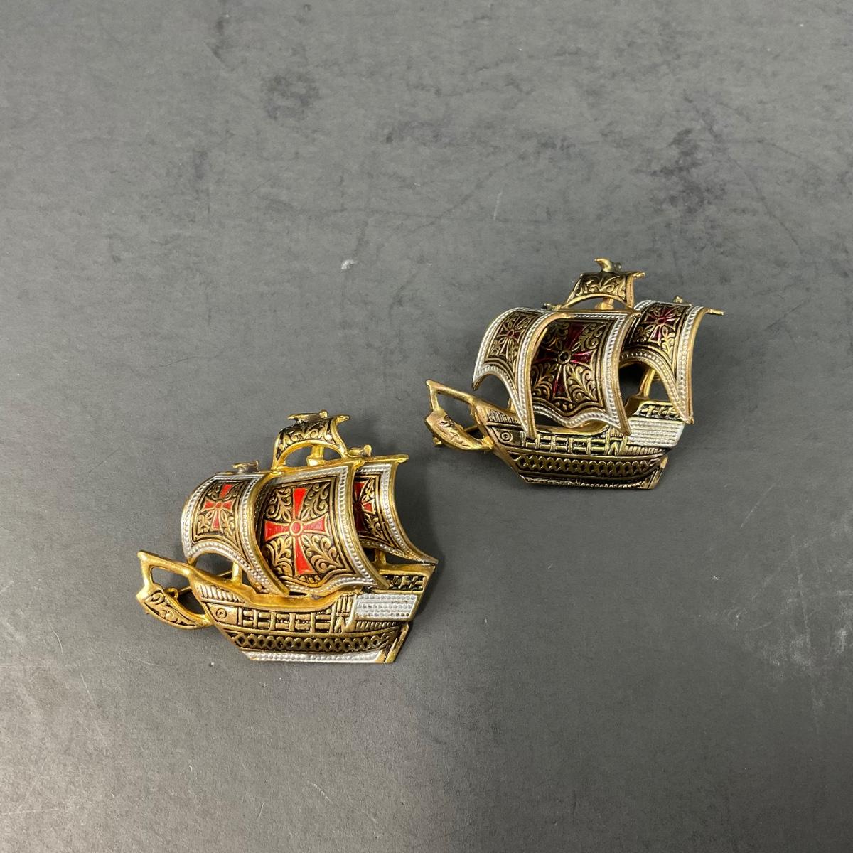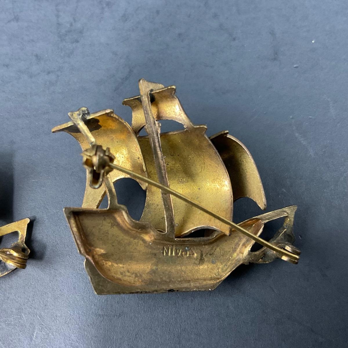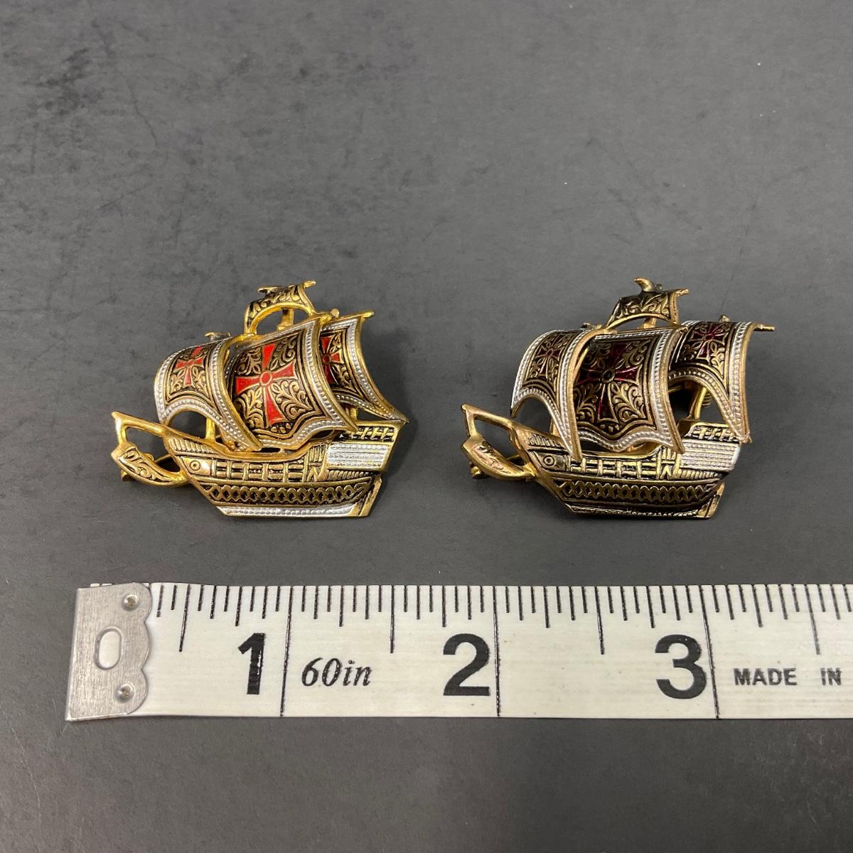 -164- PINS | Spain Gold Tone Damascene Galleon Sailing Ship Brooches