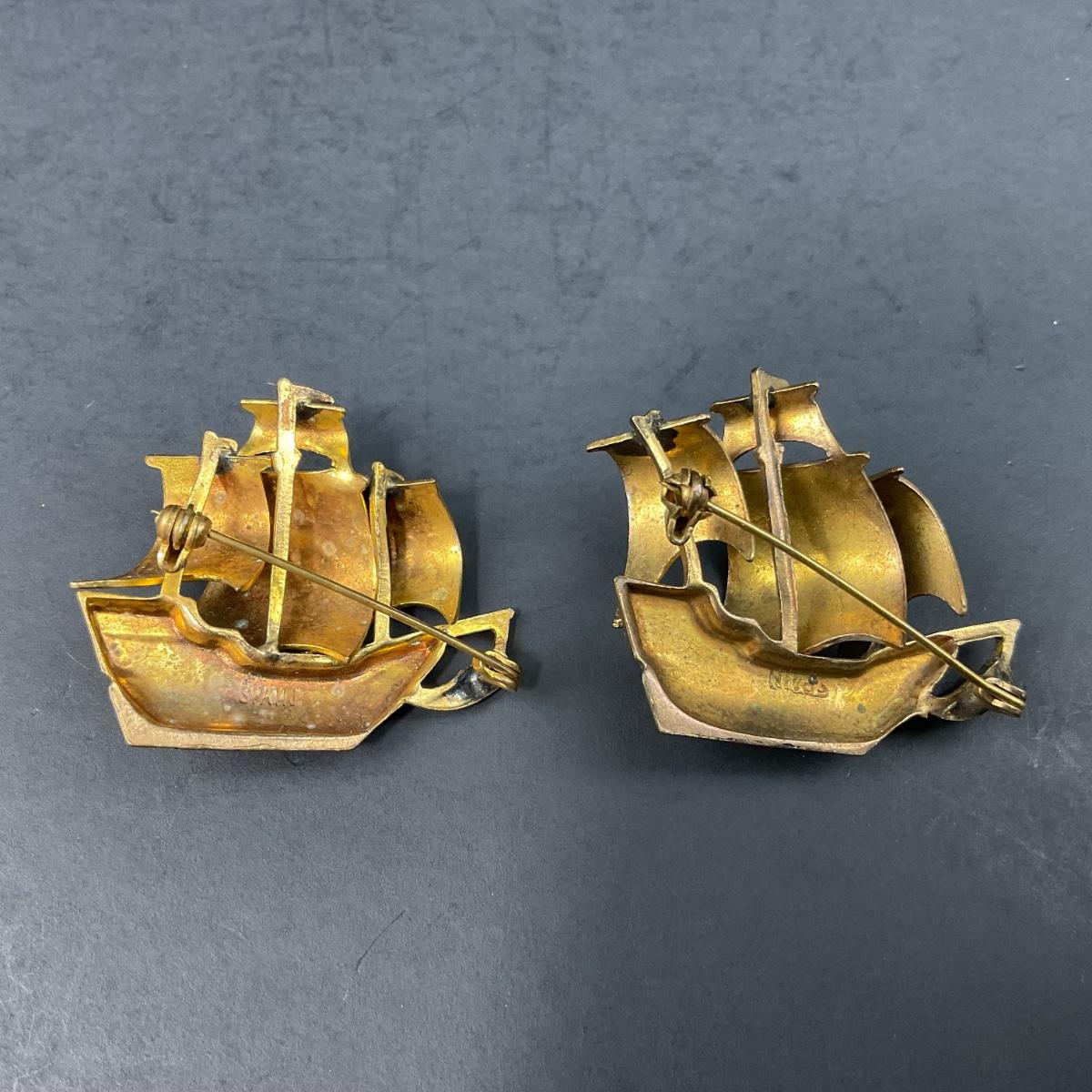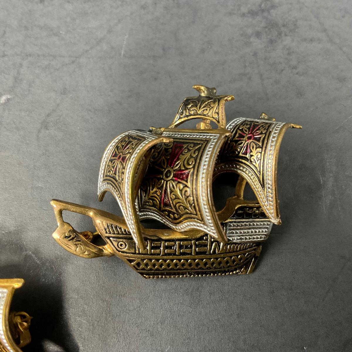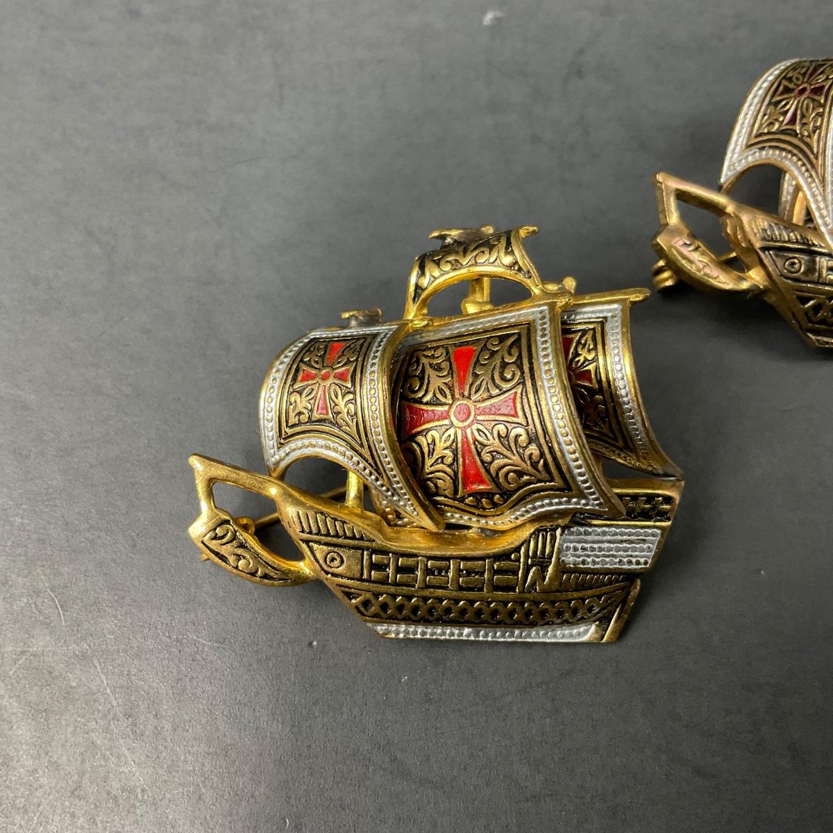 -164- PINS | Spain Gold Tone Damascene Galleon Sailing Ship Brooches