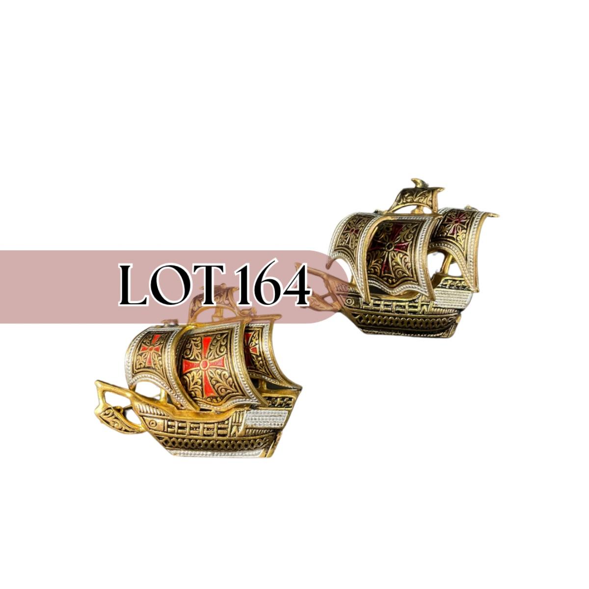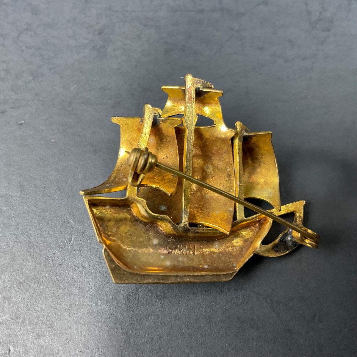 Two vintage Spain gold tone Damascene Galleon sailing ship brooches. This piece has no damage, and appears to be in great shape with no visable chips, cracks, or broken pieces. Please see photos for details and condition. Any condition statement is given as a courtesy to a client, is an opinion, and should not be treated as a statement of fact. Reference to condition written, oral or within a condition report shall not be regarded as a full account of condition and may not include all defects, alterations, or restorations. Absence of a condition report does not imply a lot is flawless or lacking imperfections or damage. Katherine’s Auction & Appraisal Service shall have no responsibility for any error or omission. Returns shall not be accepted on the basis of condition. ::: Shipping is available on this lot. If you require shipping you must let us know at the close of the auction. We will coordinate with you after the item has been won. Shipping fees will include insurance up to or exceeding the value of all items being mailed. If you have any questions regarding this lot please contact the auctioneer either via this website, by direct email or by phone. PICK UP TIMES and other important information can be found in the TERMS and DESCRIPTION of the auction. Please take a look for pertinent information. Thanks!