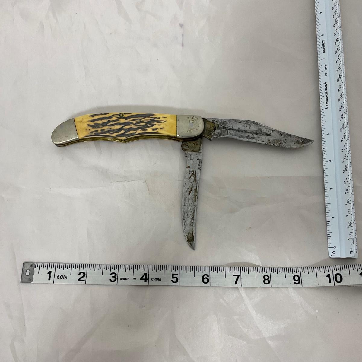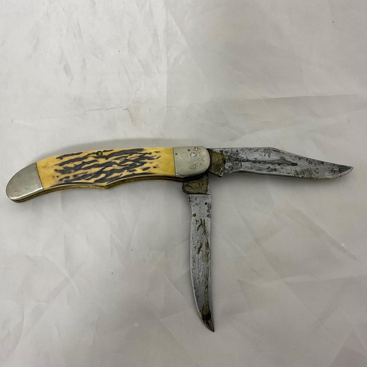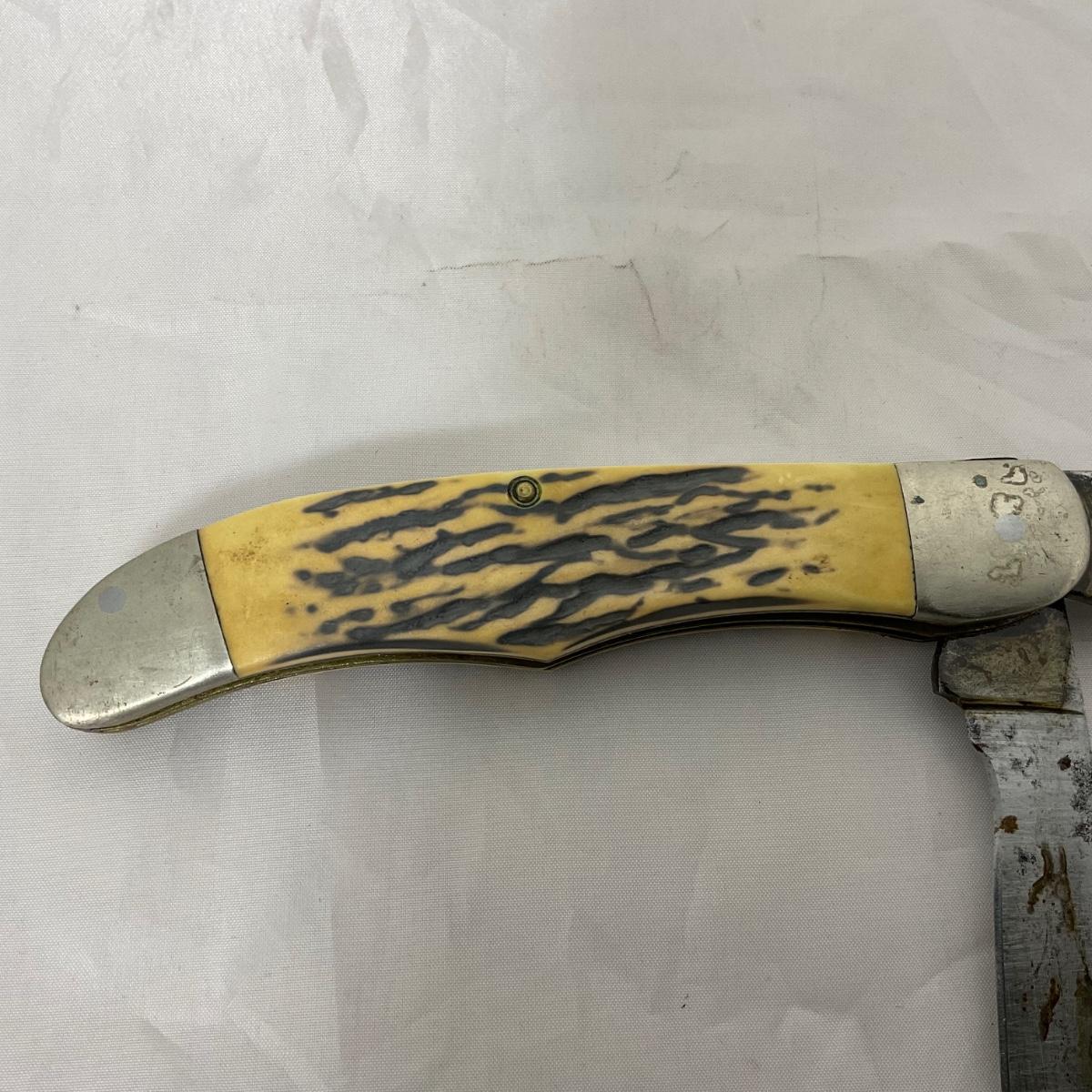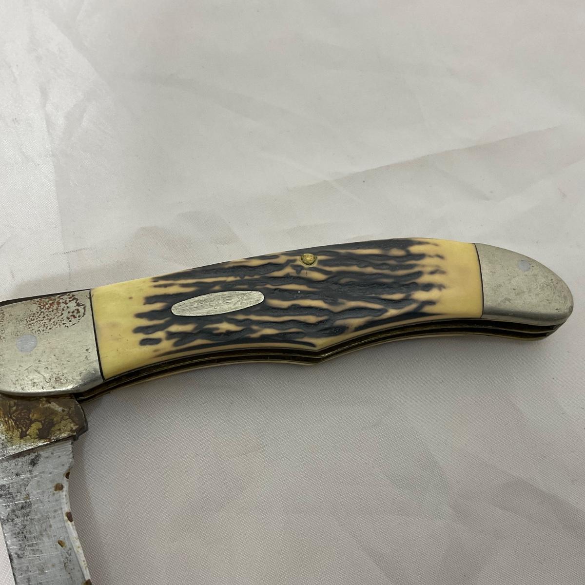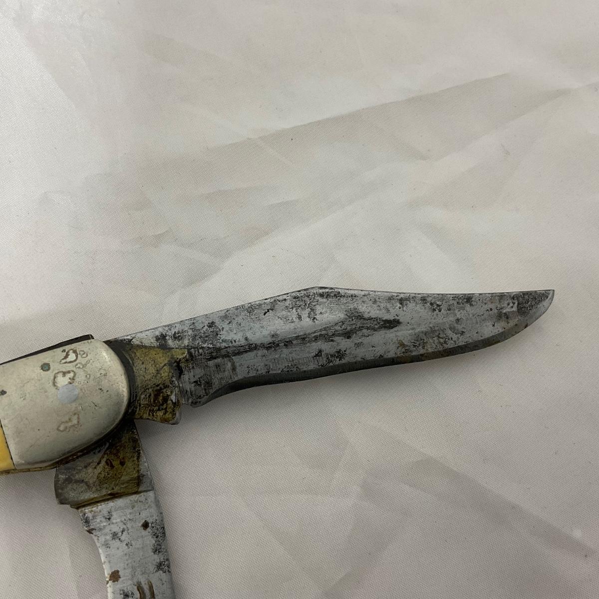 One large vintage Kabar folding knife. In rough condition. Please see photos for details and condition. ::: Shipping is available on this lot. If you require shipping you must let us know at the close of the auction. We will coordinate with you after the item has been won. Shipping fees will include insurance up to or exceeding the value of all items being mailed. If you have any questions regarding this lot please contact the auctioneer either via this website, by direct email or by phone. PICK UP TIMES and other important information can be found in the TERMS and DESCRIPTION of the auction. Please take a look for pertinent information. Thanks!