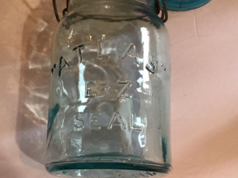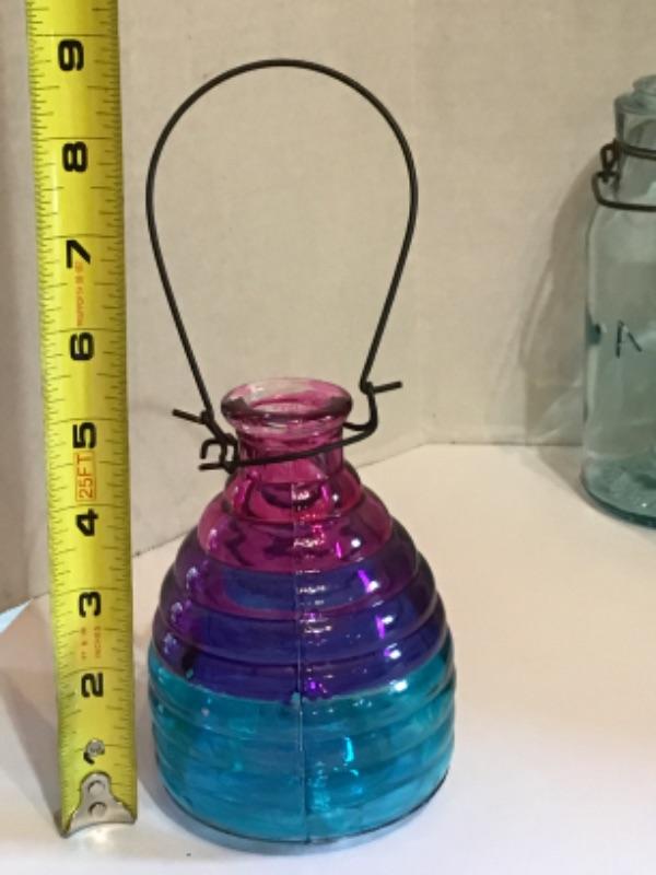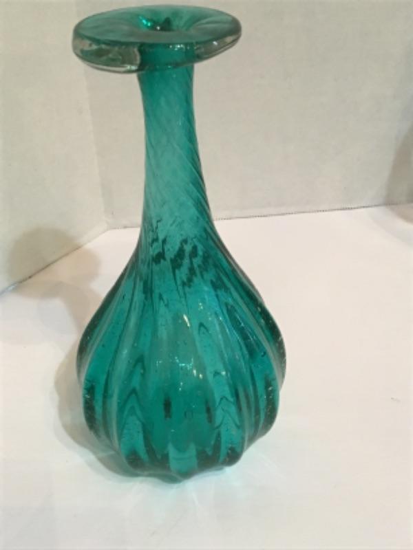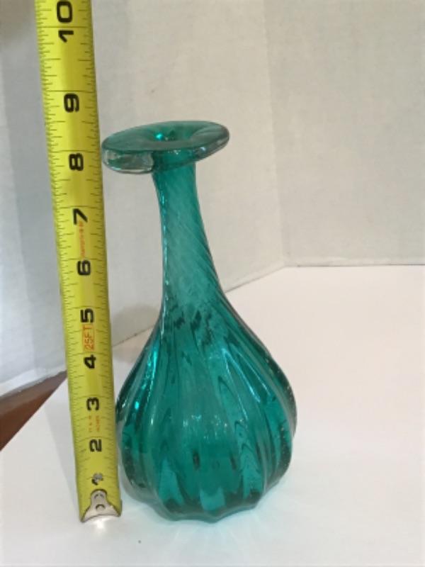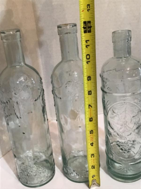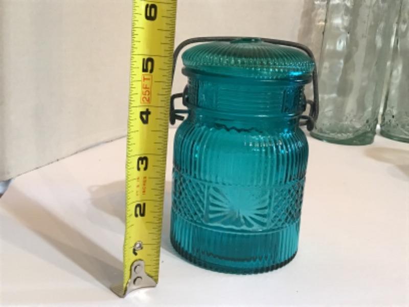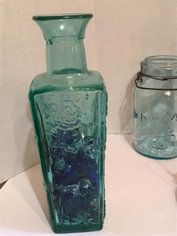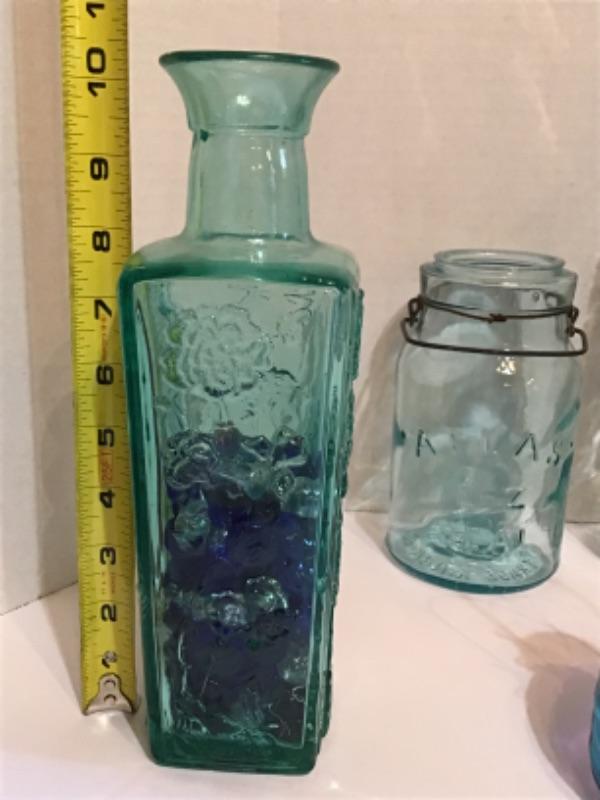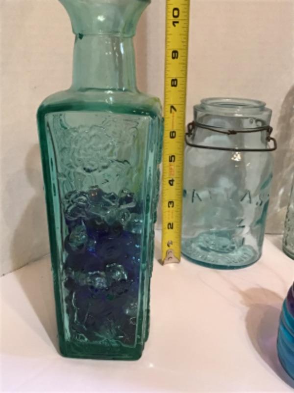 13 different Teal and Clear Glass bottles ranging in size from 4”-12”, see pictures